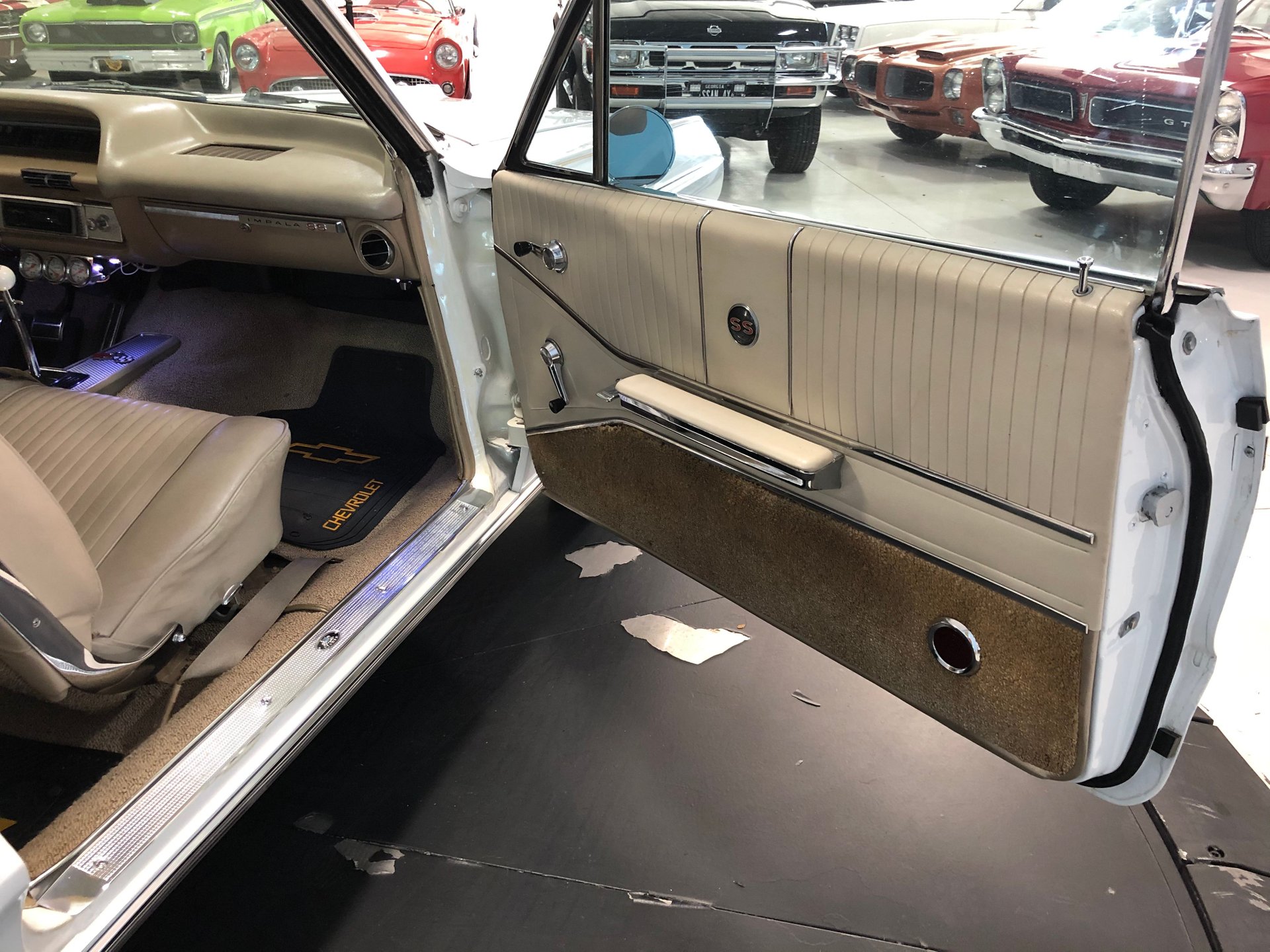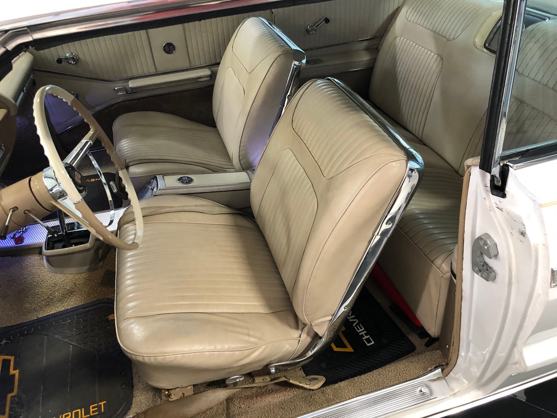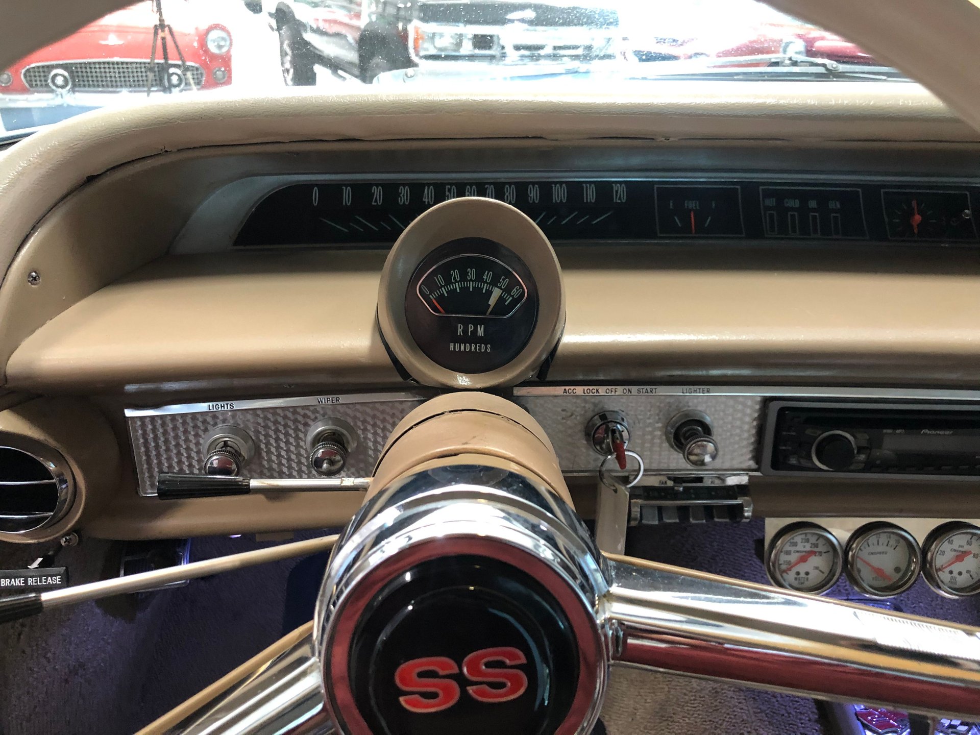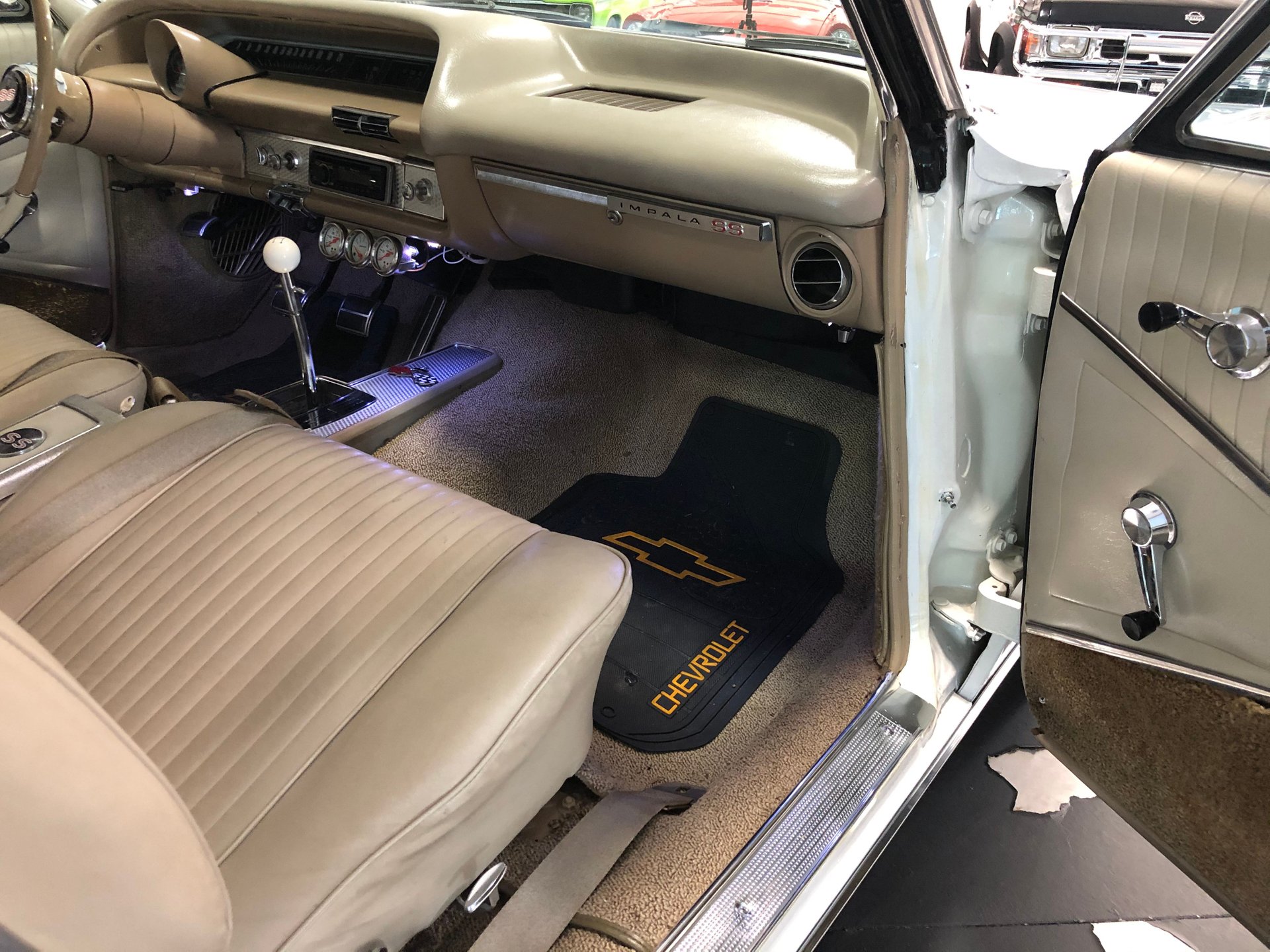 The interior is new fawn Deluxe vinyl on its bucket seats with chrome surrounds and matching rear seat that looks amazing! It has the middle factory console housing the chrome 4-spped shifter with white shifter ball, fawn colored carpet and door panels, SS emblems, plus the sharp Impala SS dash with the factory engine-turned plate and houses all the original gauges including a tachometer plus a set of aftermarket auxiliary gauges underneath.