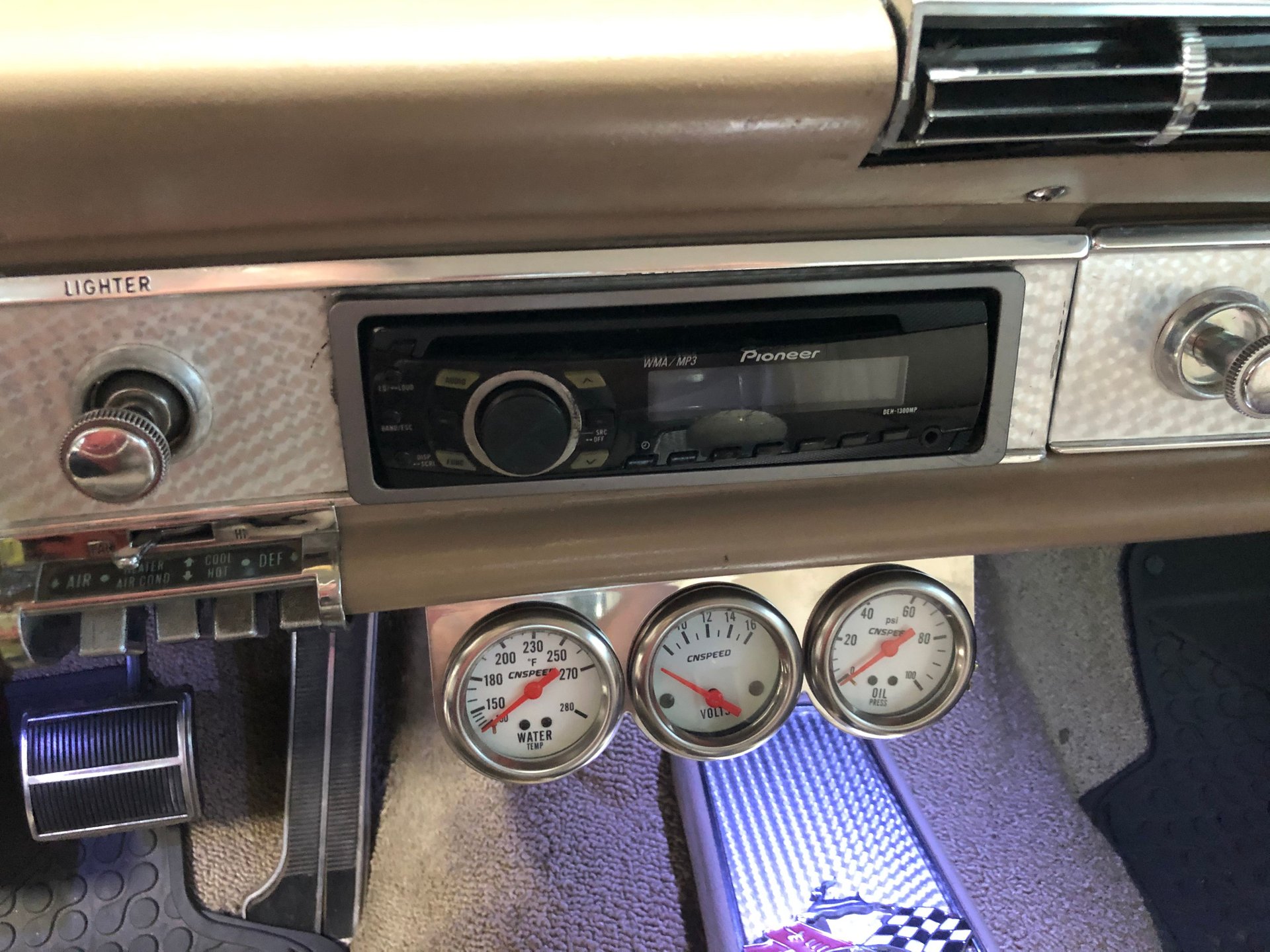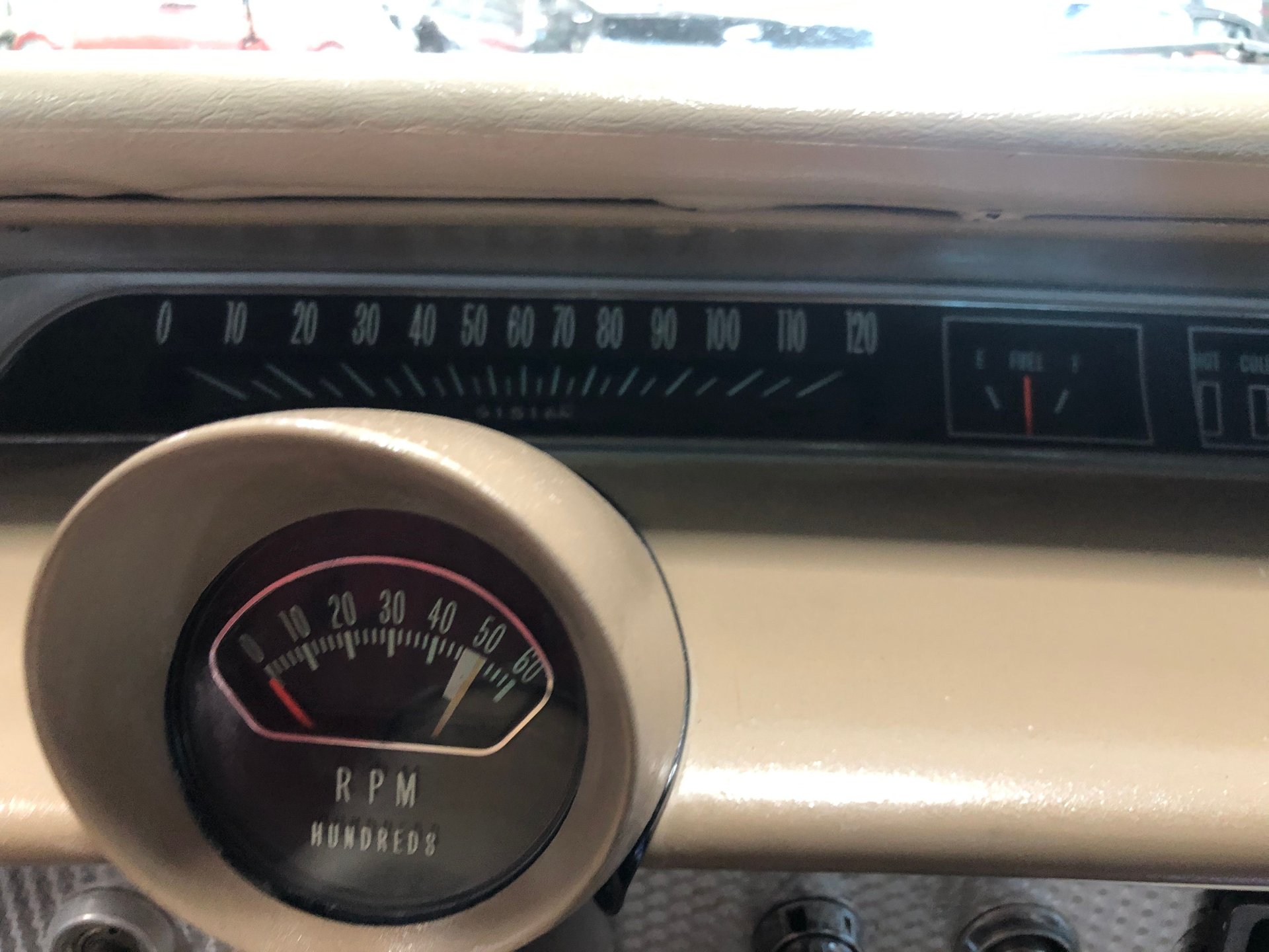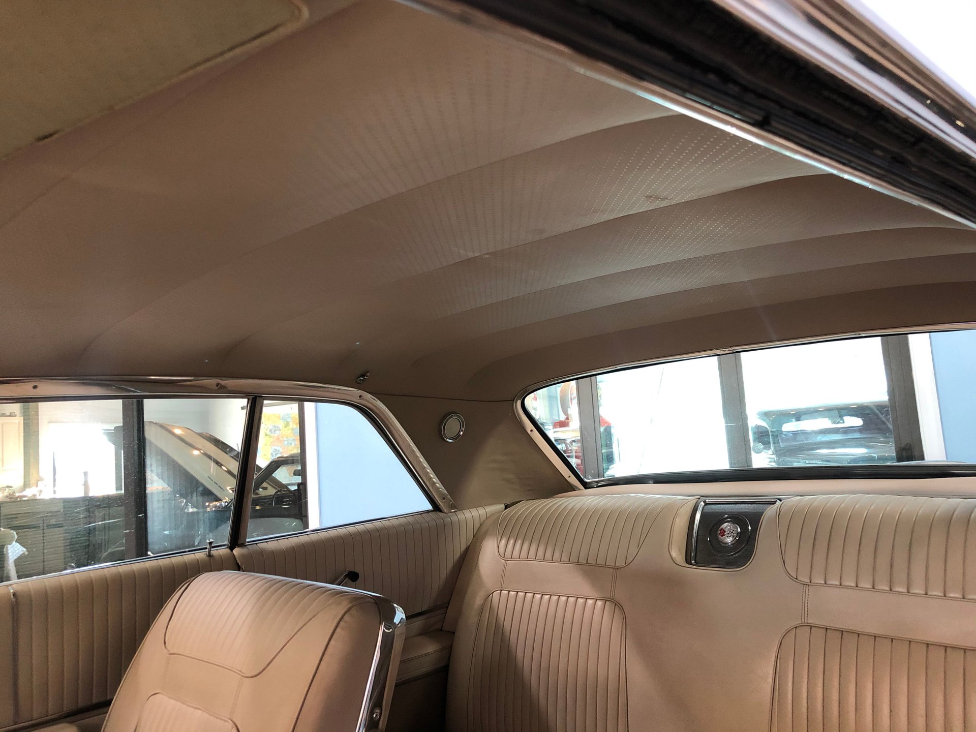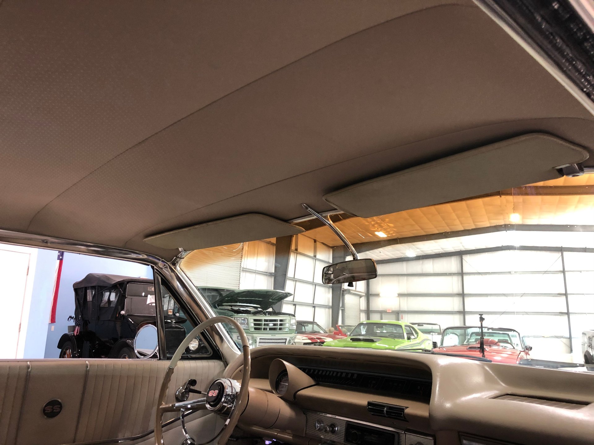 The interior is new fawn Deluxe vinyl on its bucket seats with chrome surrounds and matching rear seat that looks amazing! It has the middle factory console housing the chrome 4-spped shifter with white shifter ball, fawn colored carpet and door panels, SS emblems, plus the sharp Impala SS dash with the factory engine-turned plate and houses all the original gauges including a tachometer plus a set of aftermarket auxiliary gauges underneath.