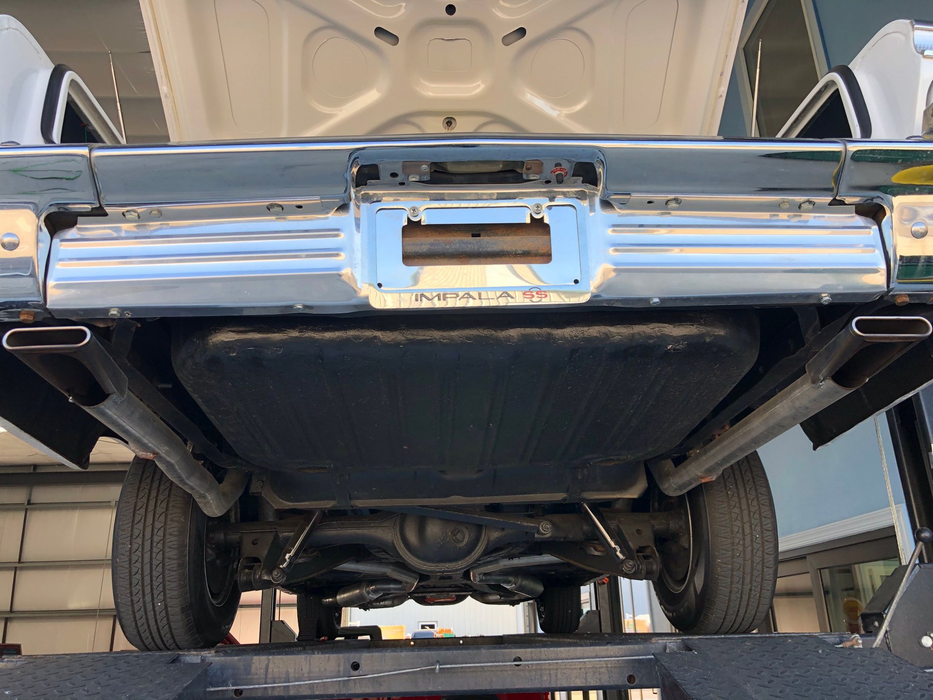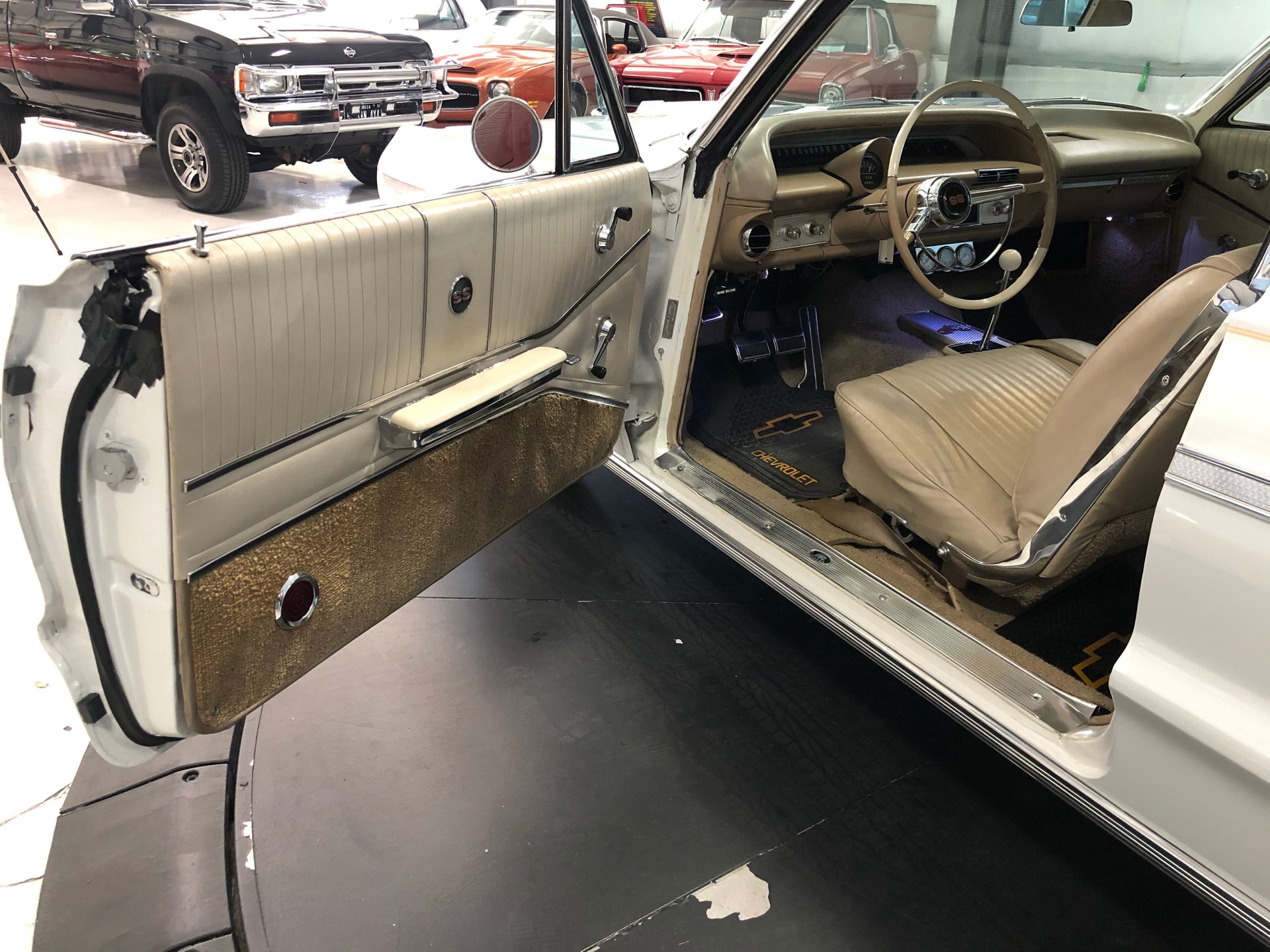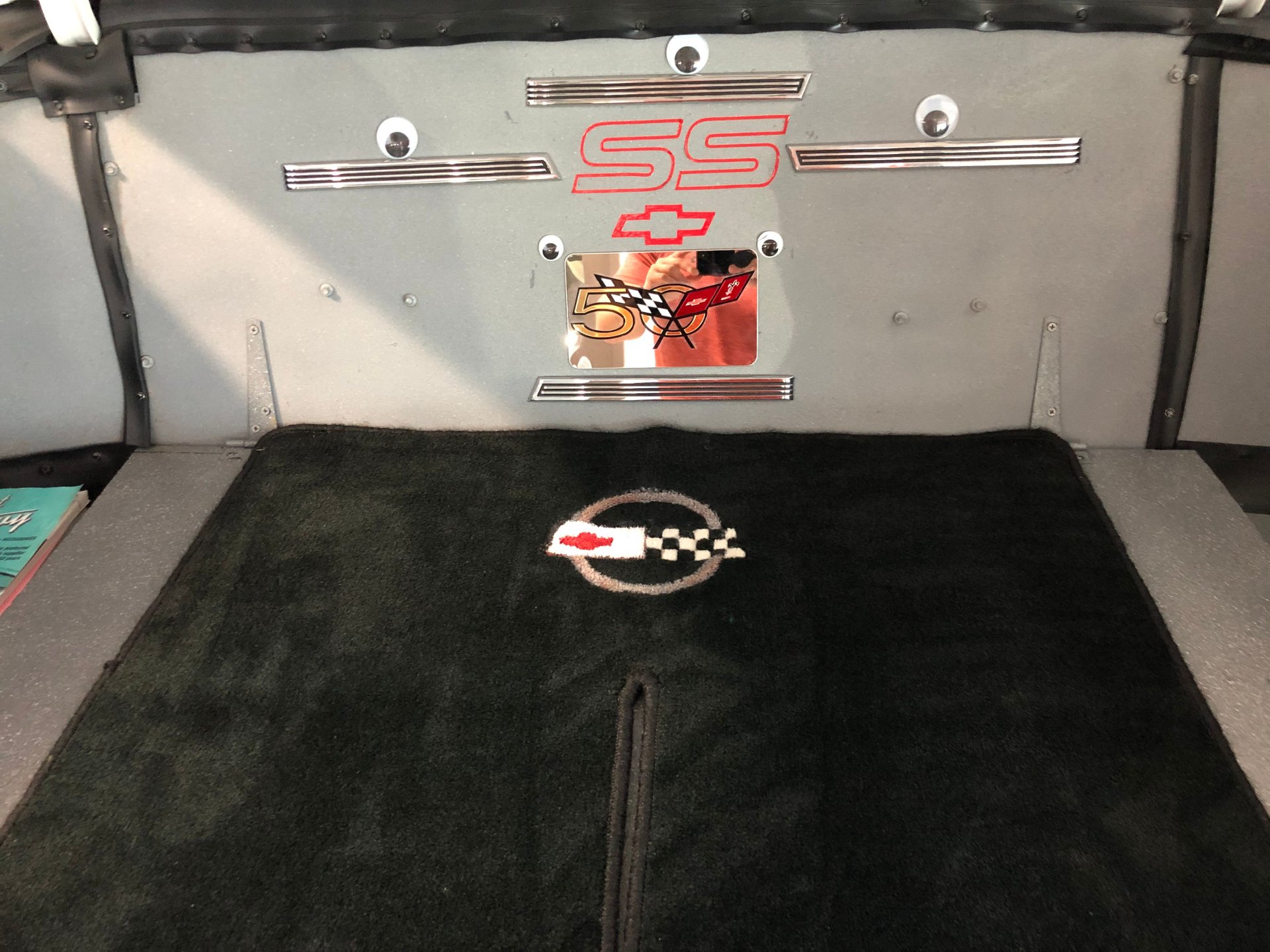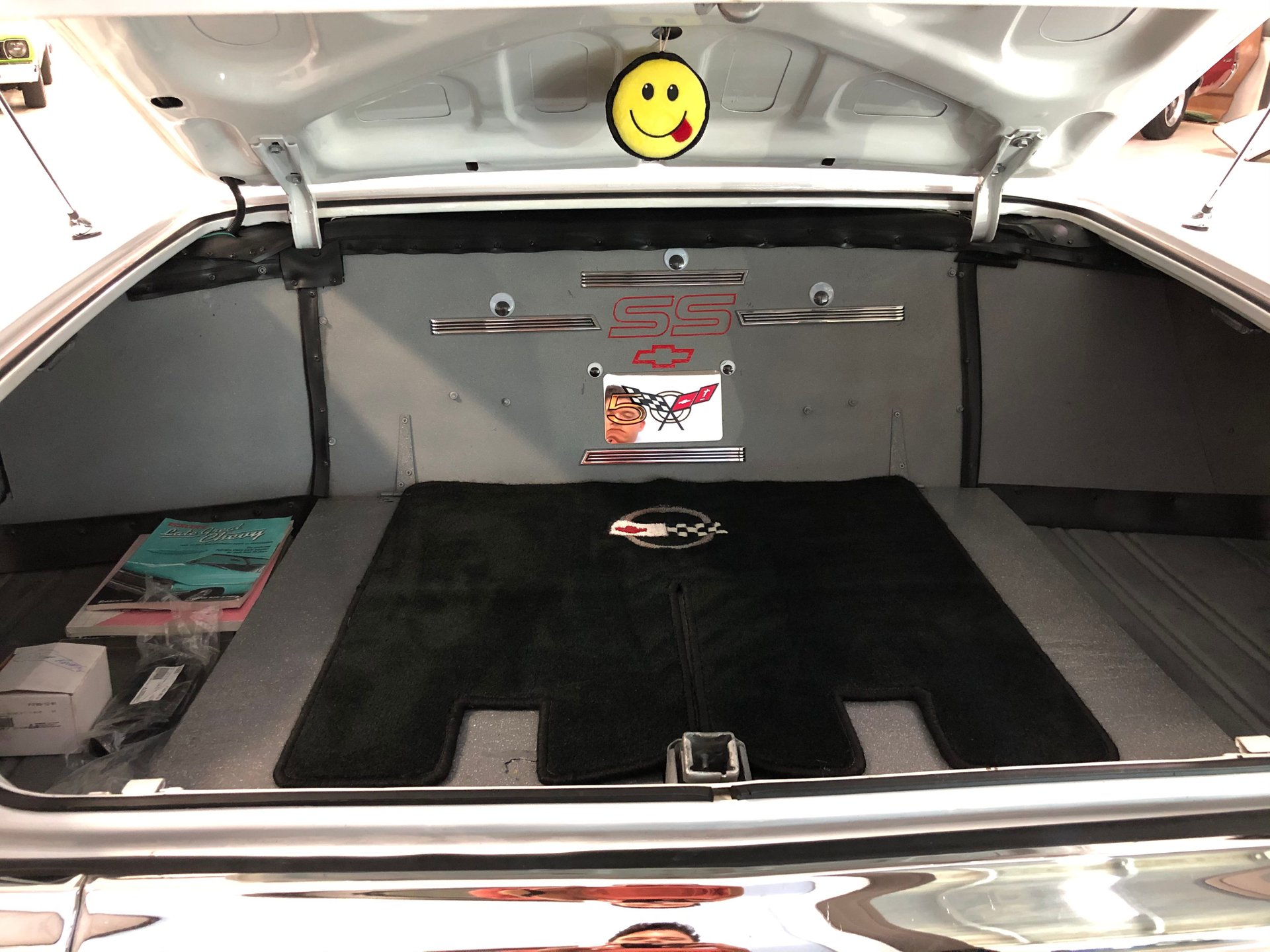 It has factory tinted windows, rear seat speaker, Chevrolet logo floor mats, the unique Impala SS factory two-tone steering wheel, aftermarket stereo radio system with the rear seat speaker, air conditioning, and the trunk looks great too with its dress up kit.