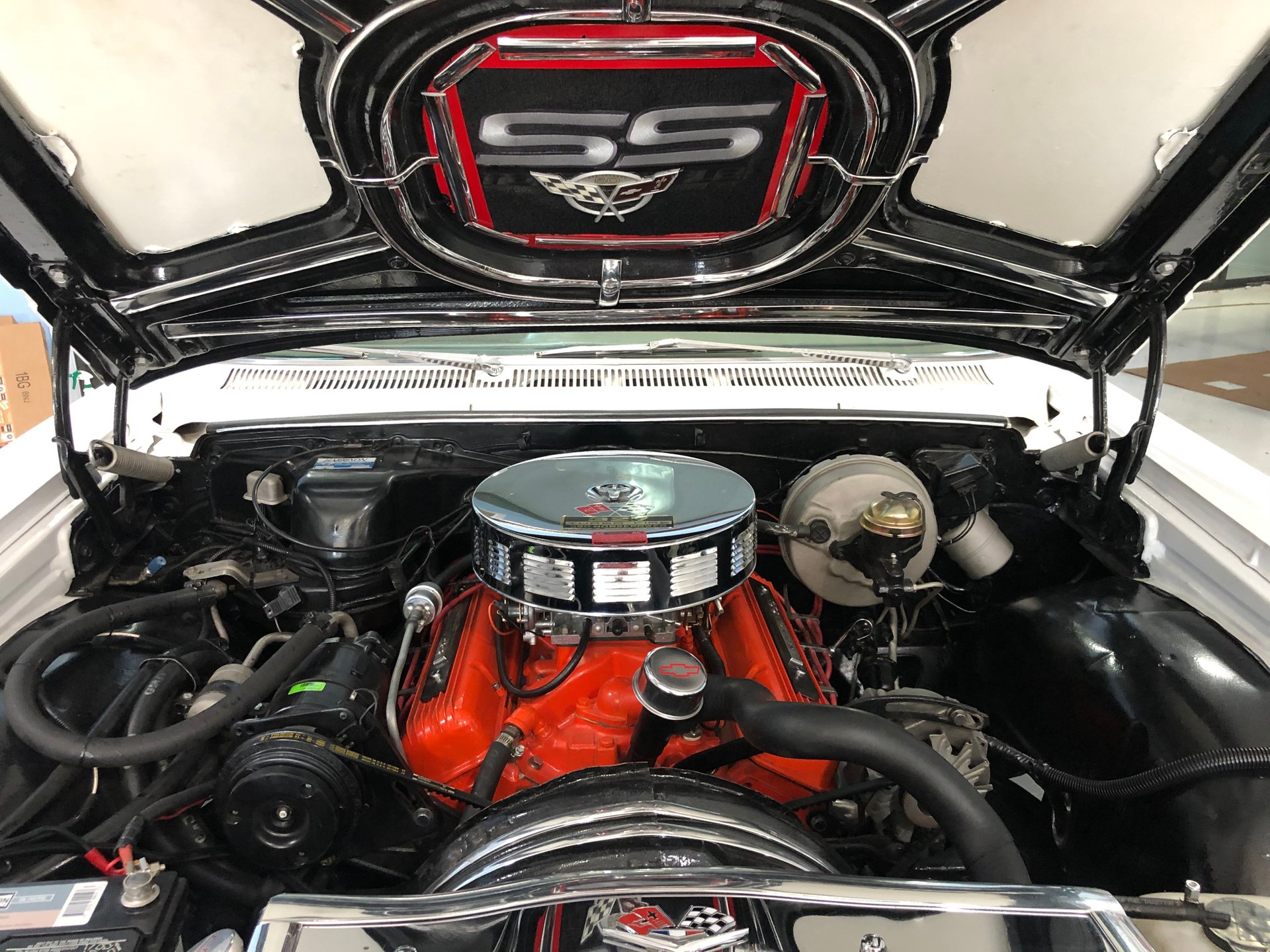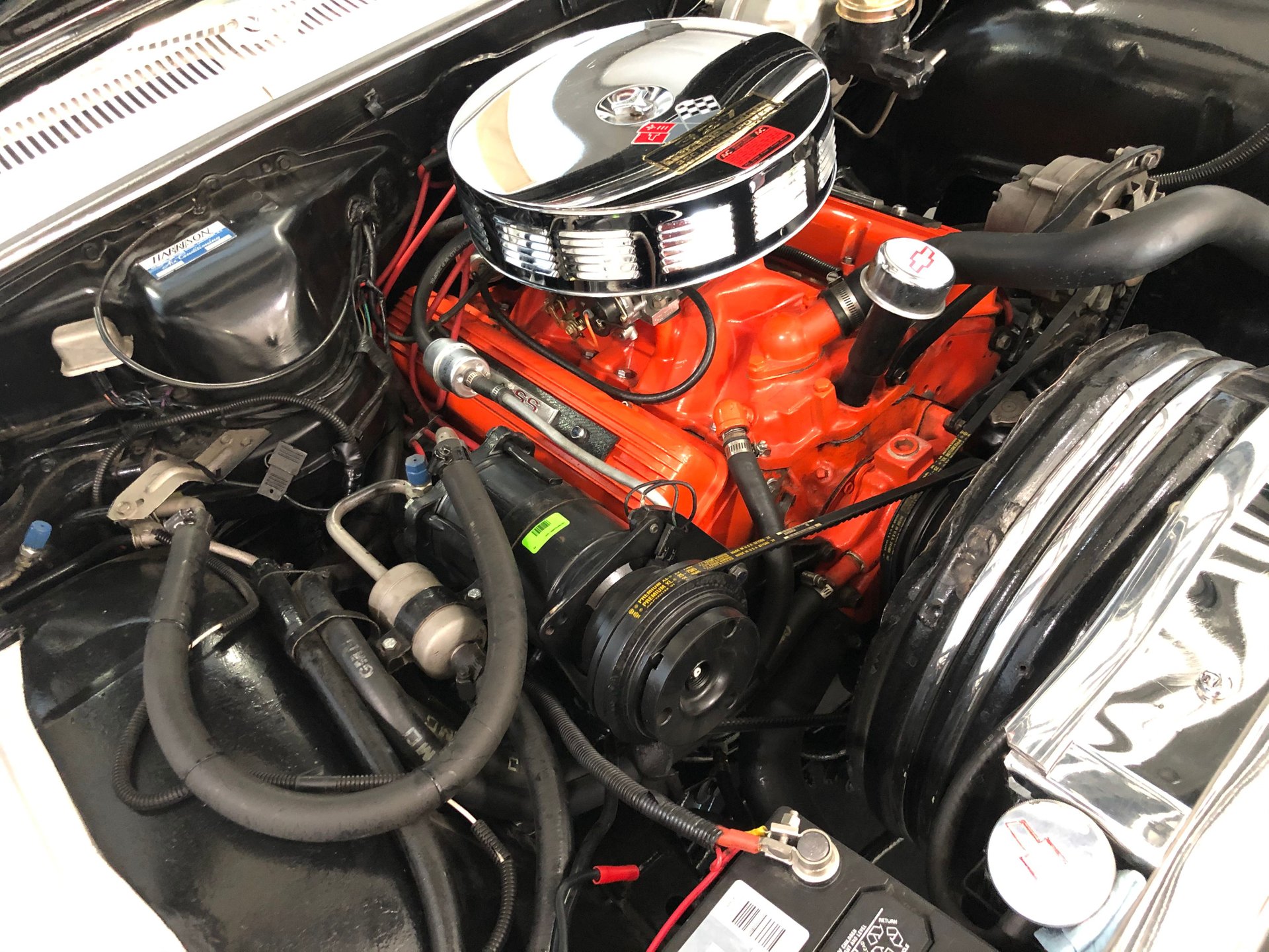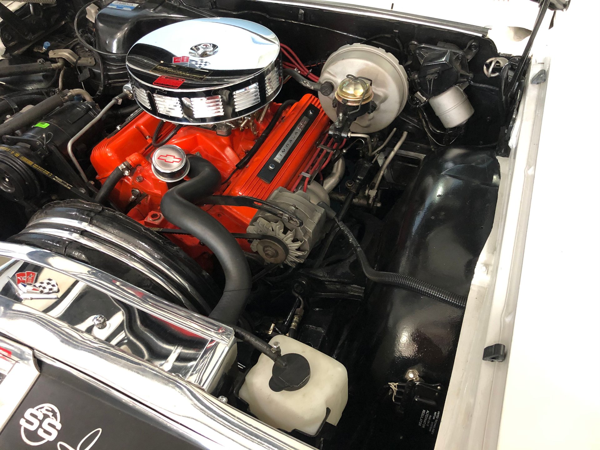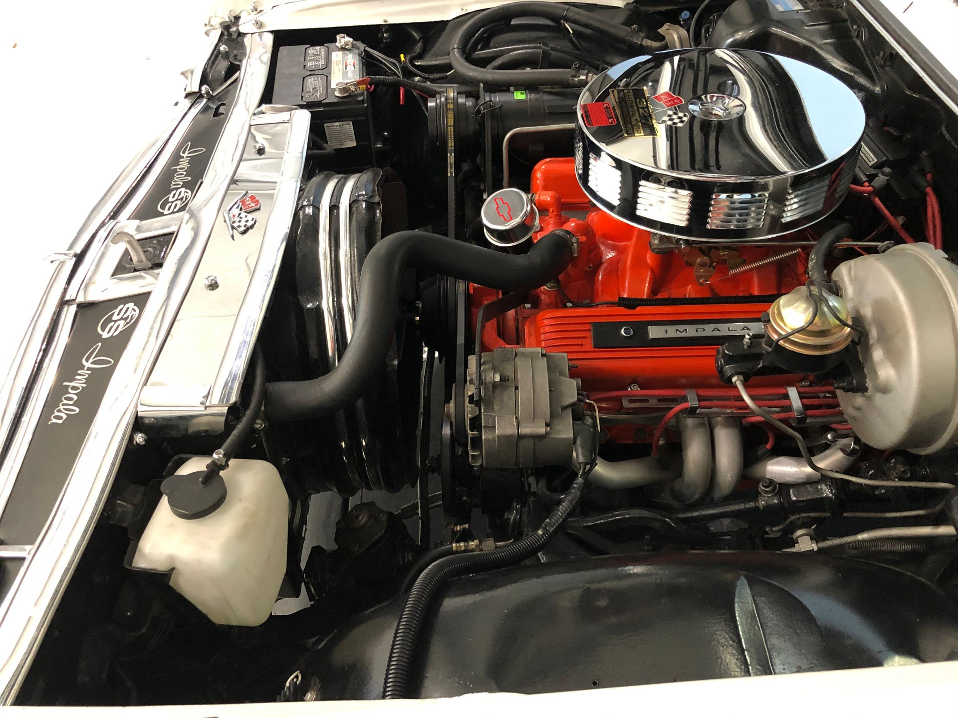 It has new front and rear bumper guards, an SS hood dress up kit, great factory tinted glass, trim, dual antennas, side 327 emblems, and rides on SS Factory Rally wheels tri-spinner hubcaps, and thin whitewall tires.