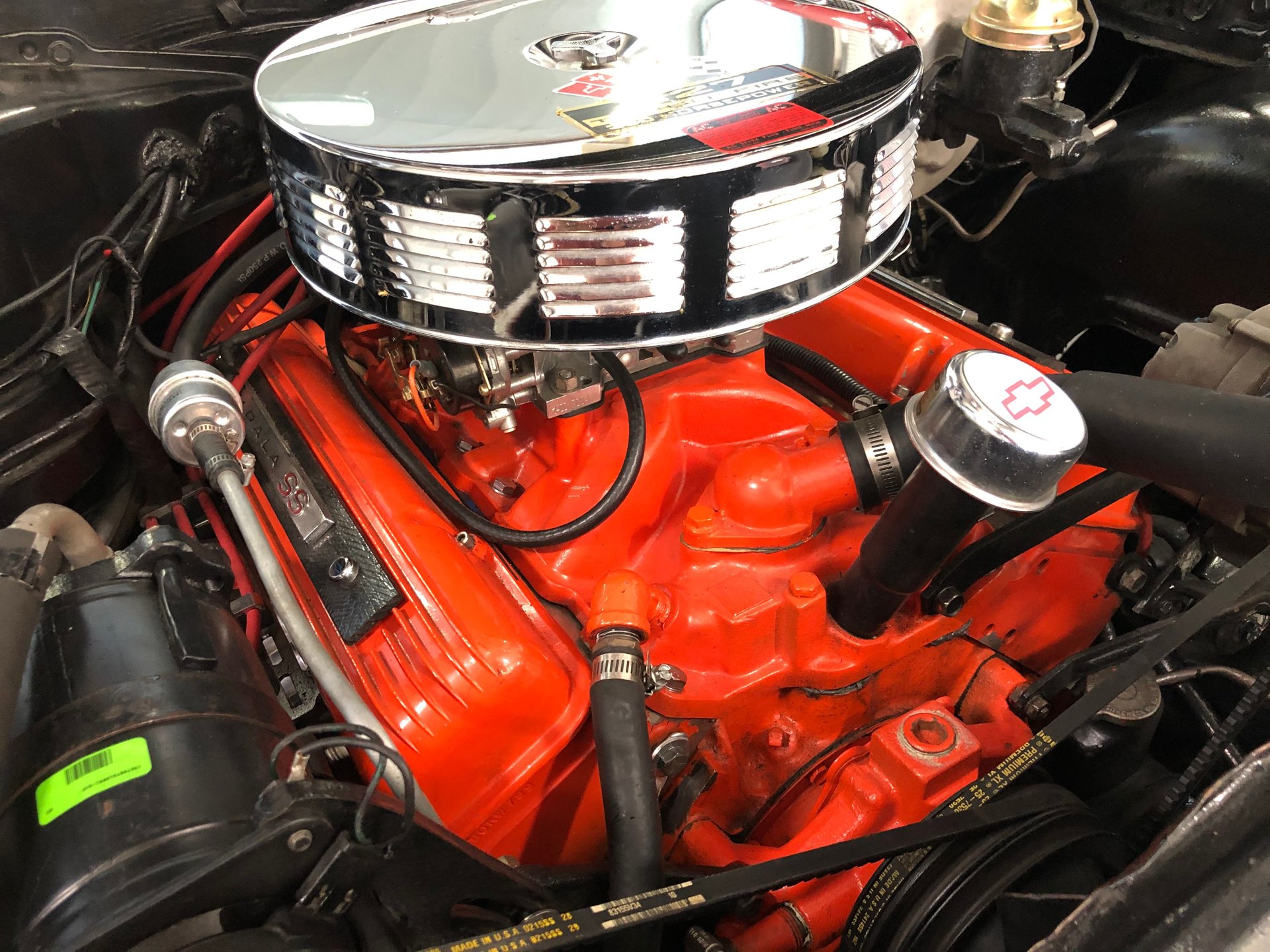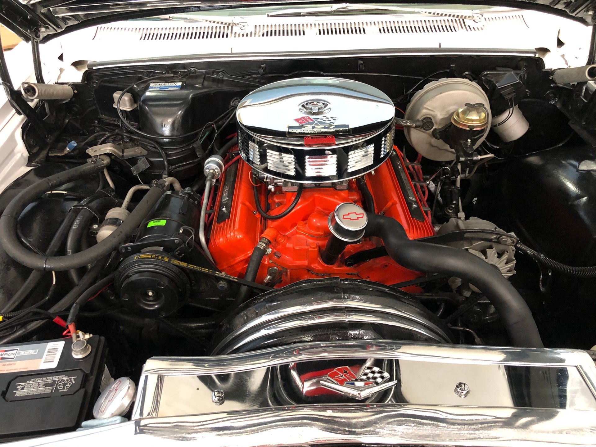 Ours has a 327 cubic inch rated by the factory at 300 horsepower V8 engine with a 4-speed manual transmission, factory air conditioning, power steering, performance distributor and spark plug wires, chrome air cleaner dress up kit with 327 decals, tube headers, factory Chevrolet Orange painted engine block, intake, and valve covers, and all in a well-cared for, clean, and detailed engine compartment.