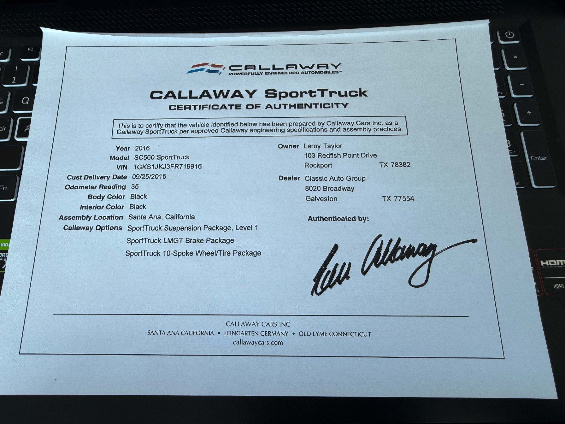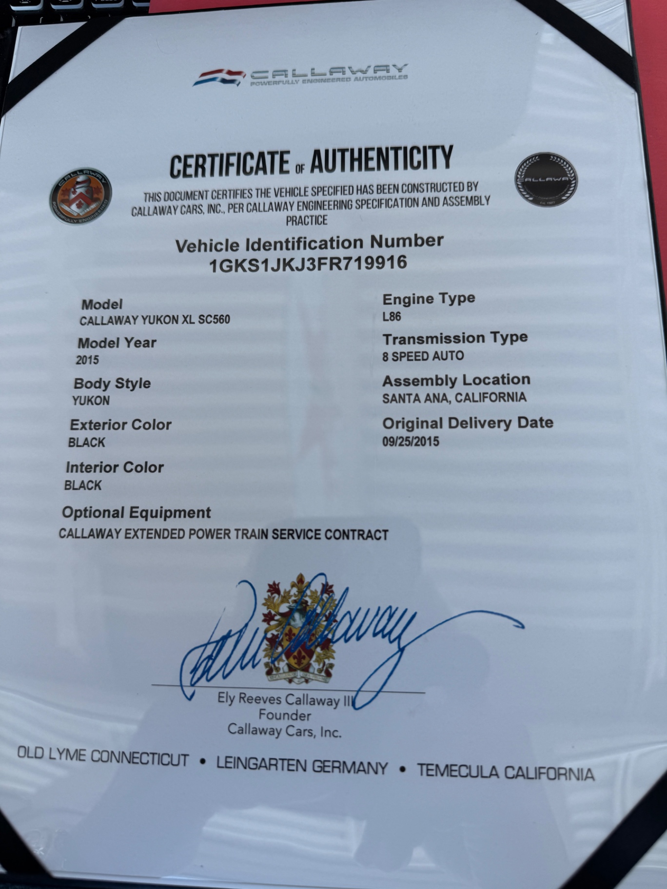 2015 GMC Yukon Callaway SC560 SC560 – 6.2L Engine Displacement – 6.2L/376 cu. in. Maximum Power – 560 hp @ 6200 rpm (SAE) Maximum Torque – 553 lb-ft @ 3800 rpm (SAE) Callaway GenThree Supercharger with TripleCooled™ Intercooler System Callaway Carbon Engine Covers with SC560 Emblems Callaway Honker™ Air Inlet System Callaway Low Restriction Exhaust System Callaway Embroidered Floor Mats Callaway Key Fobs Callaway Badging, Exterior and Interior Callaway Underhood Plaque with Vehicle Identification Number Callaway Sport Truck Authenticity Documentation Package Tan saddle leather Interior is very clean and looks great Power everything Factory dash with all the correct gauges and controls Air conditioning Stereo radio Black sidewall tires Calloway mag wheels