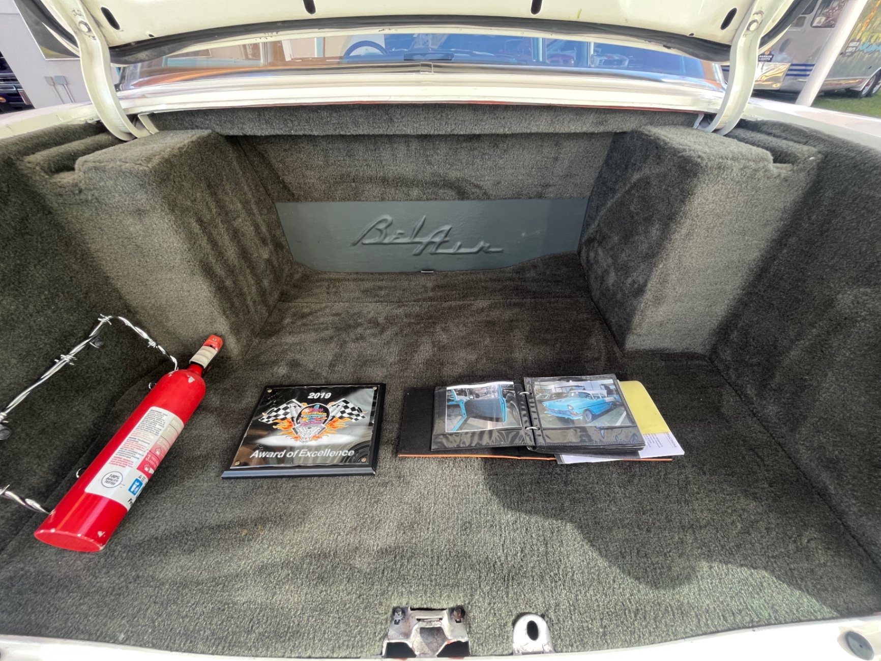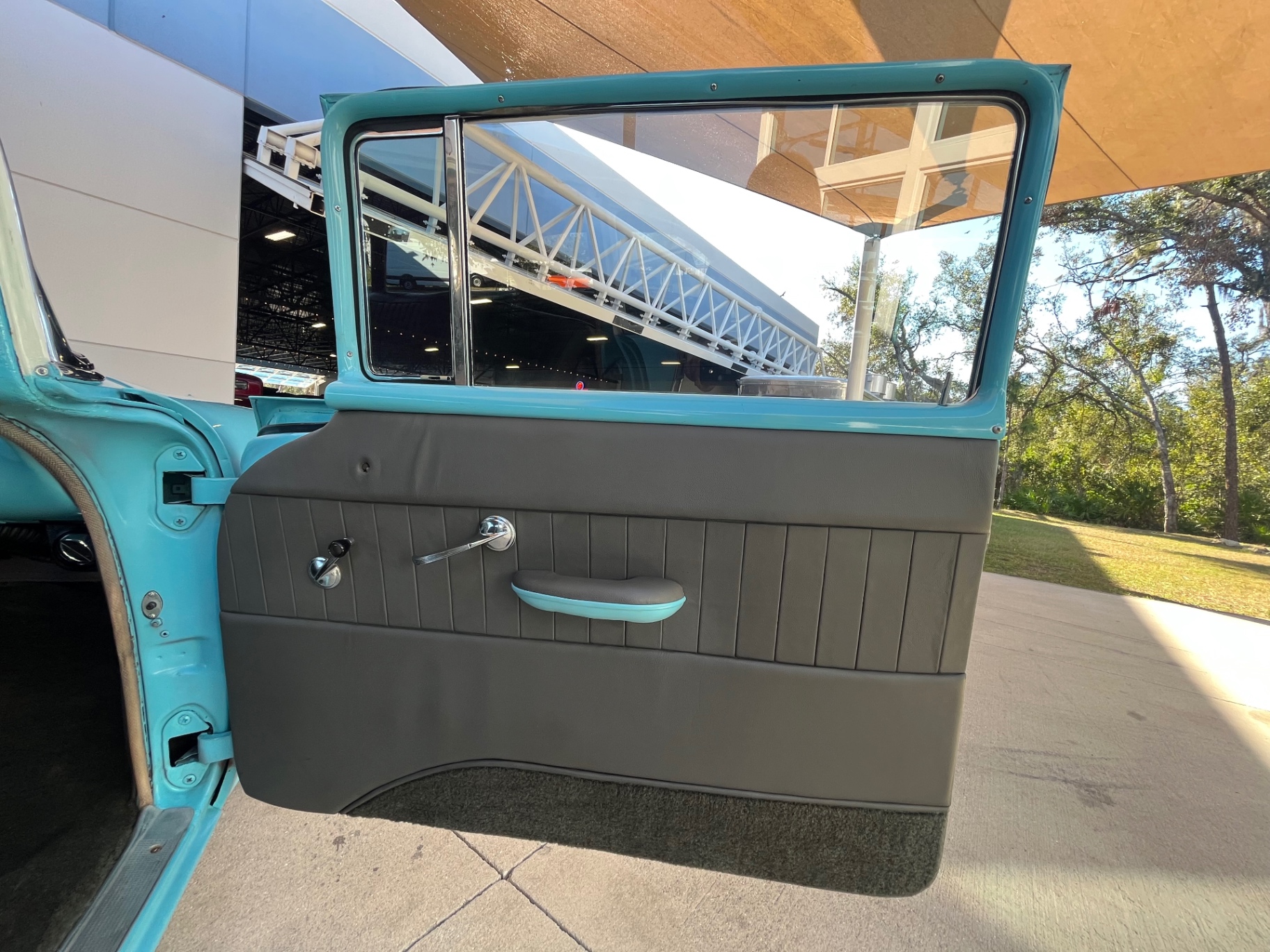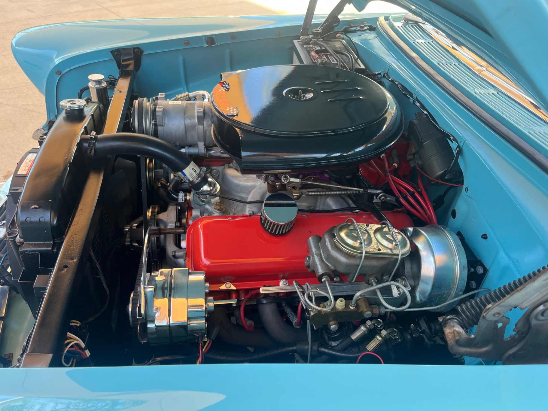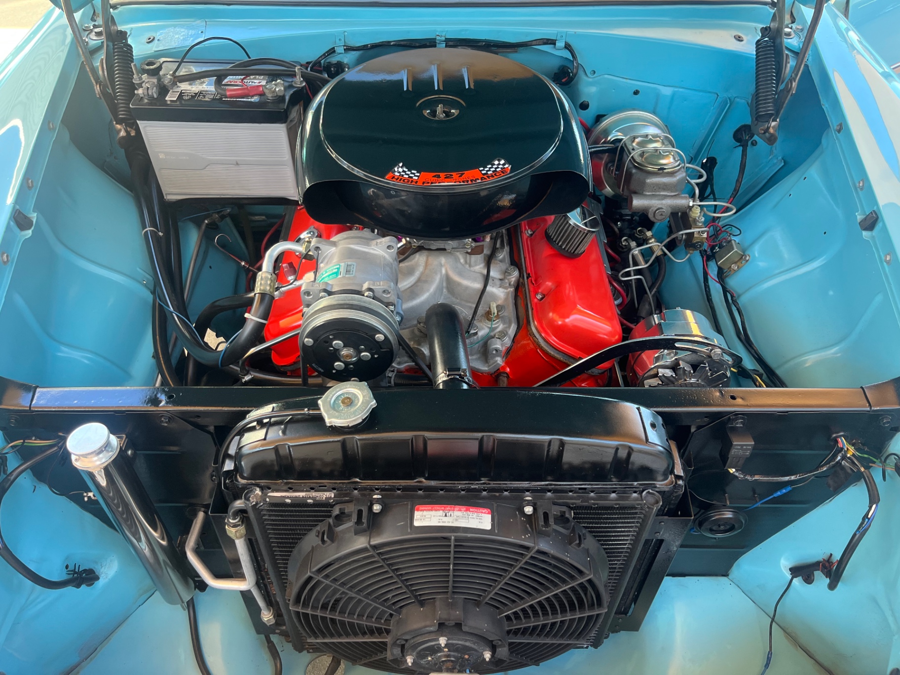 The legendary 56 is powered by none other than the equally as legendary big block Chevrolet 454 cubic inch built V8 engine. The block and heads are painted in Chevrolet orange and topped off with a black painted lid air cleaner, orange painted valve covers, aluminum intake, chrome alternator, performance electronics, tube headers, dual exhaust, power steering and brakes, air conditioning, with the power is routed through an automatic transmission.