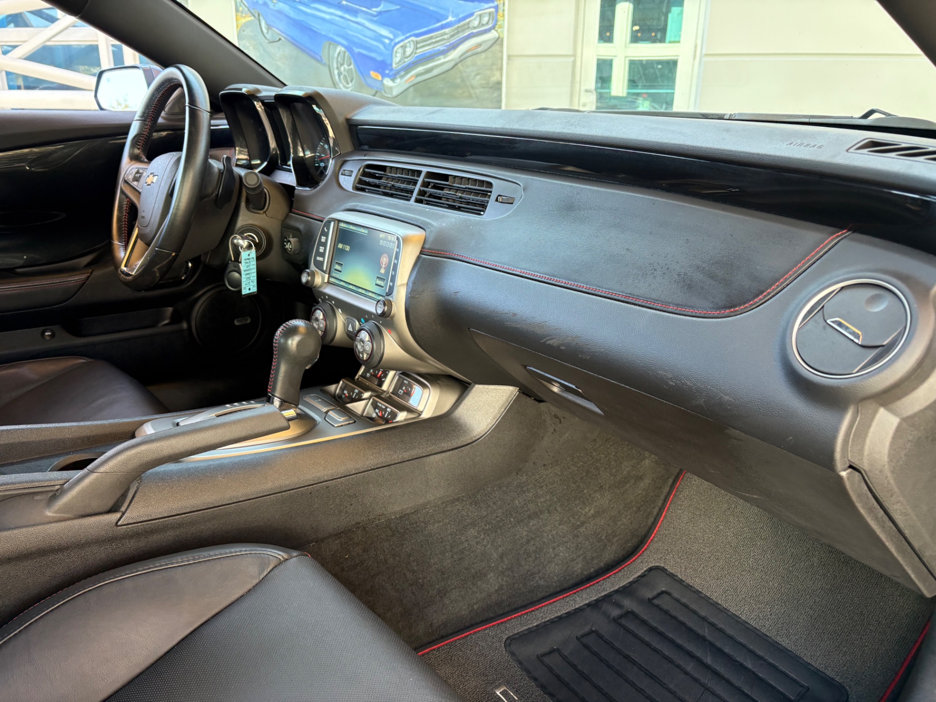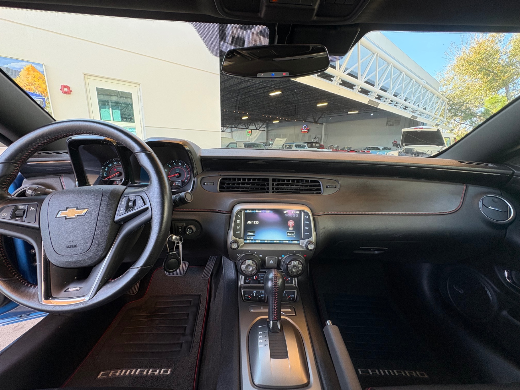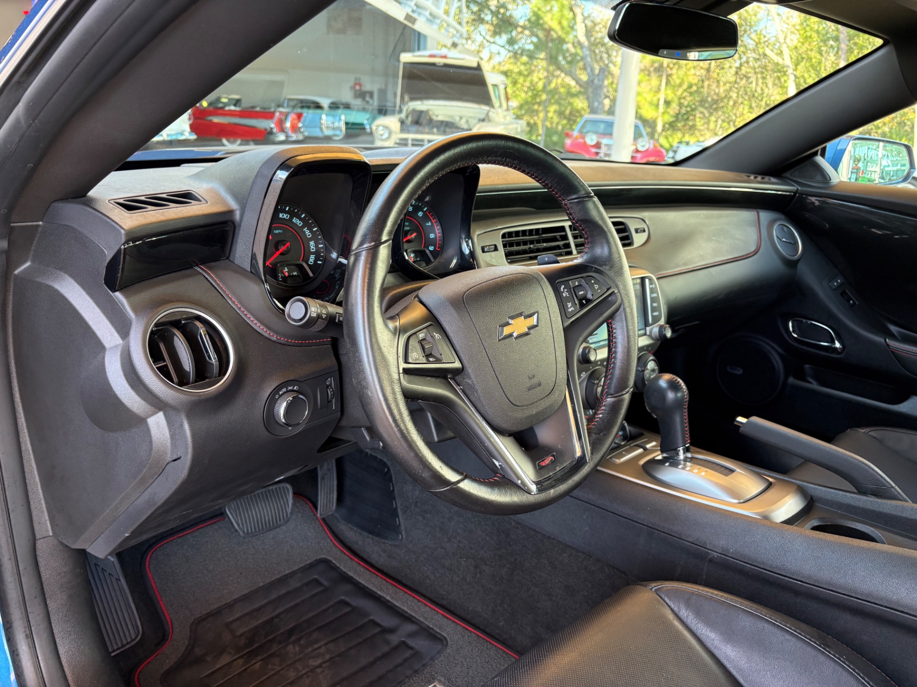 Step inside, and the Camaro’s black interior welcomes you with a blend of comfort and functionality. The cloth seat trim incorporates leather accents, providing a luxurious feel while maintaining the practicality of everyday use. The power-adjustable driver seat ensures that drivers can find their perfect driving position with ease. The leather-wrapped steering wheel features mounted audio controls, allowing for seamless interaction with the vehicle's infotainment system. With features like single-zone manual air conditioning and a six-speaker audio system that includes Bluetooth connectivity, the interior is designed for a modern driving experience, catering to both nostalgia and contemporary needs.