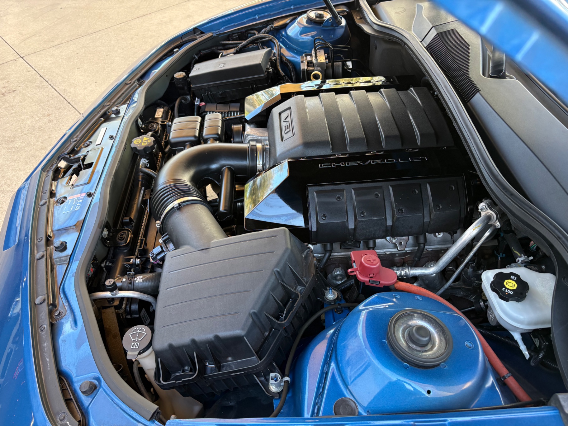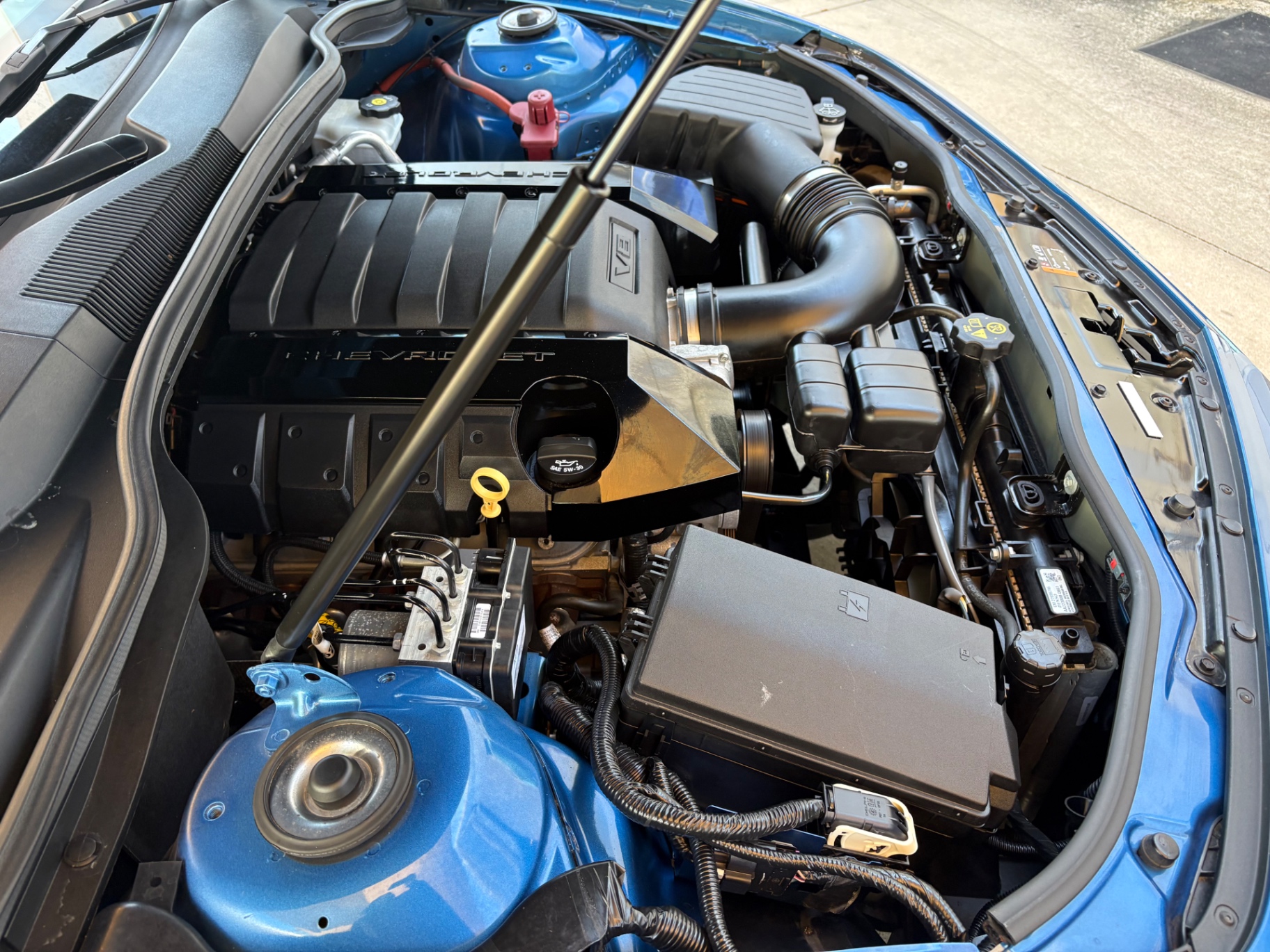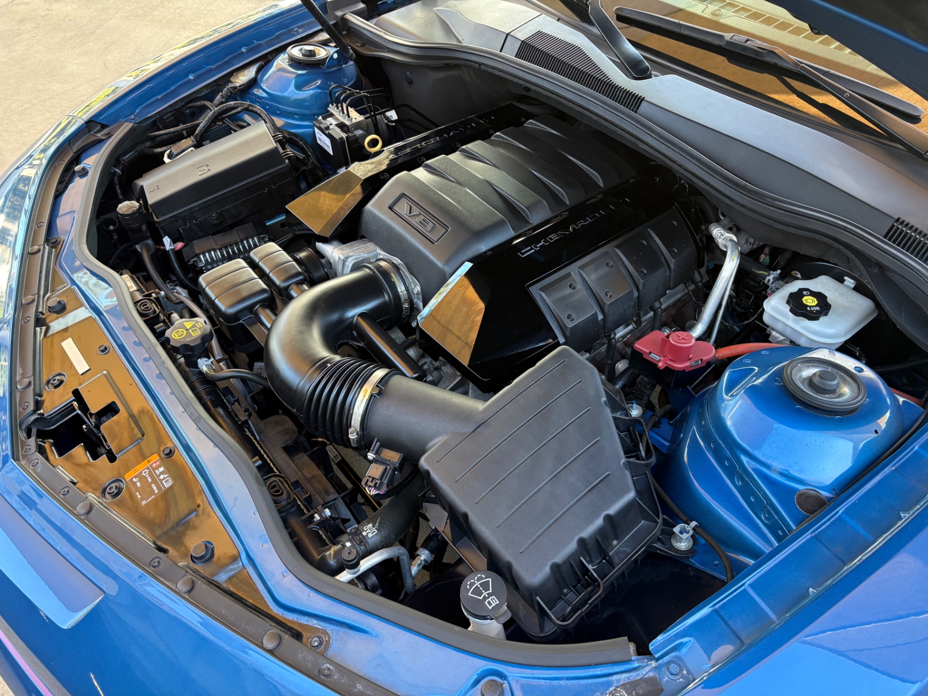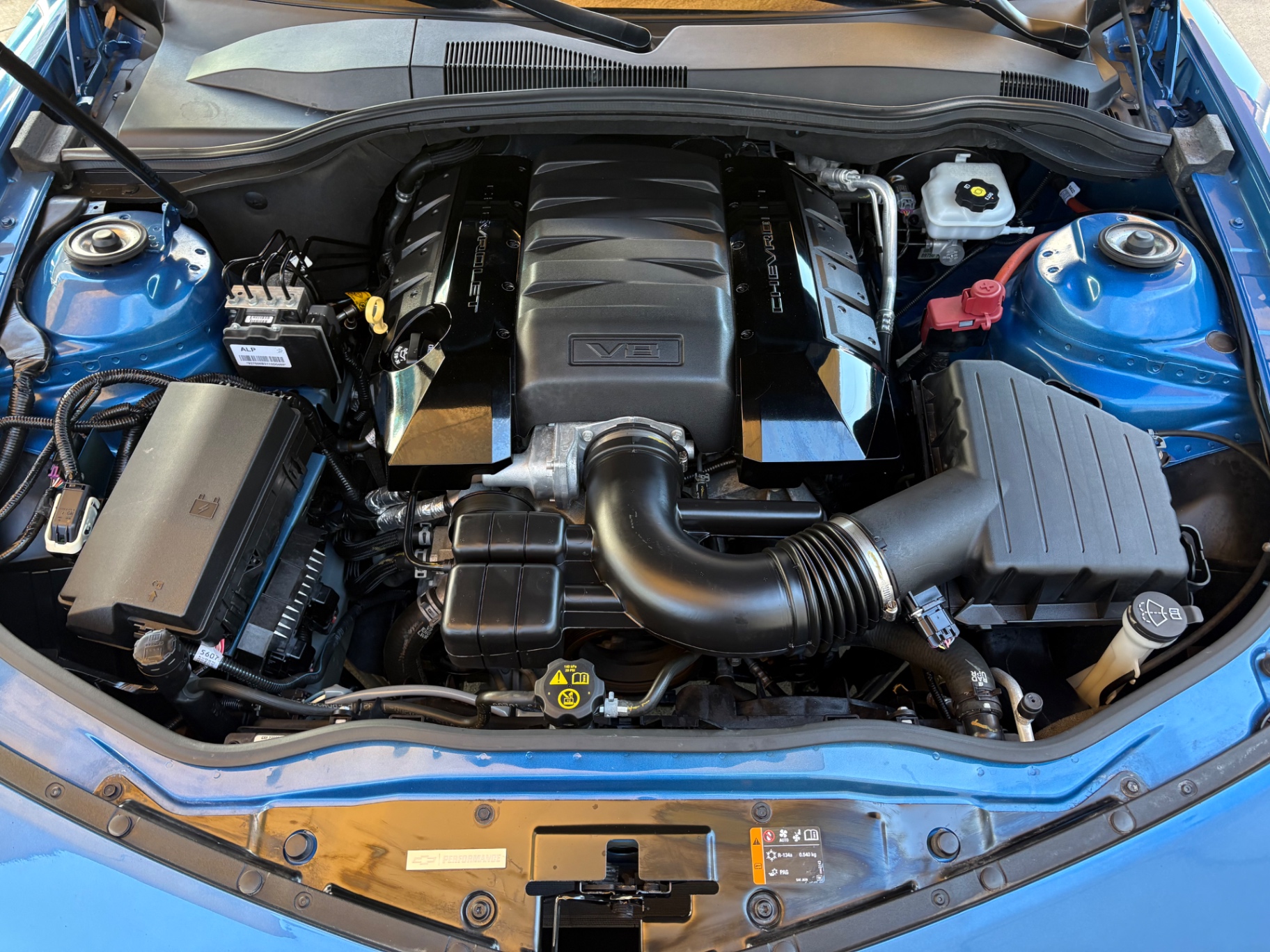 Step inside, and the Camaro’s black interior welcomes you with a blend of comfort and functionality. The cloth seat trim incorporates leather accents, providing a luxurious feel while maintaining the practicality of everyday use. The power-adjustable driver seat ensures that drivers can find their perfect driving position with ease. The leather-wrapped steering wheel features mounted audio controls, allowing for seamless interaction with the vehicle's infotainment system. With features like single-zone manual air conditioning and a six-speaker audio system that includes Bluetooth connectivity, the interior is designed for a modern driving experience, catering to both nostalgia and contemporary needs.