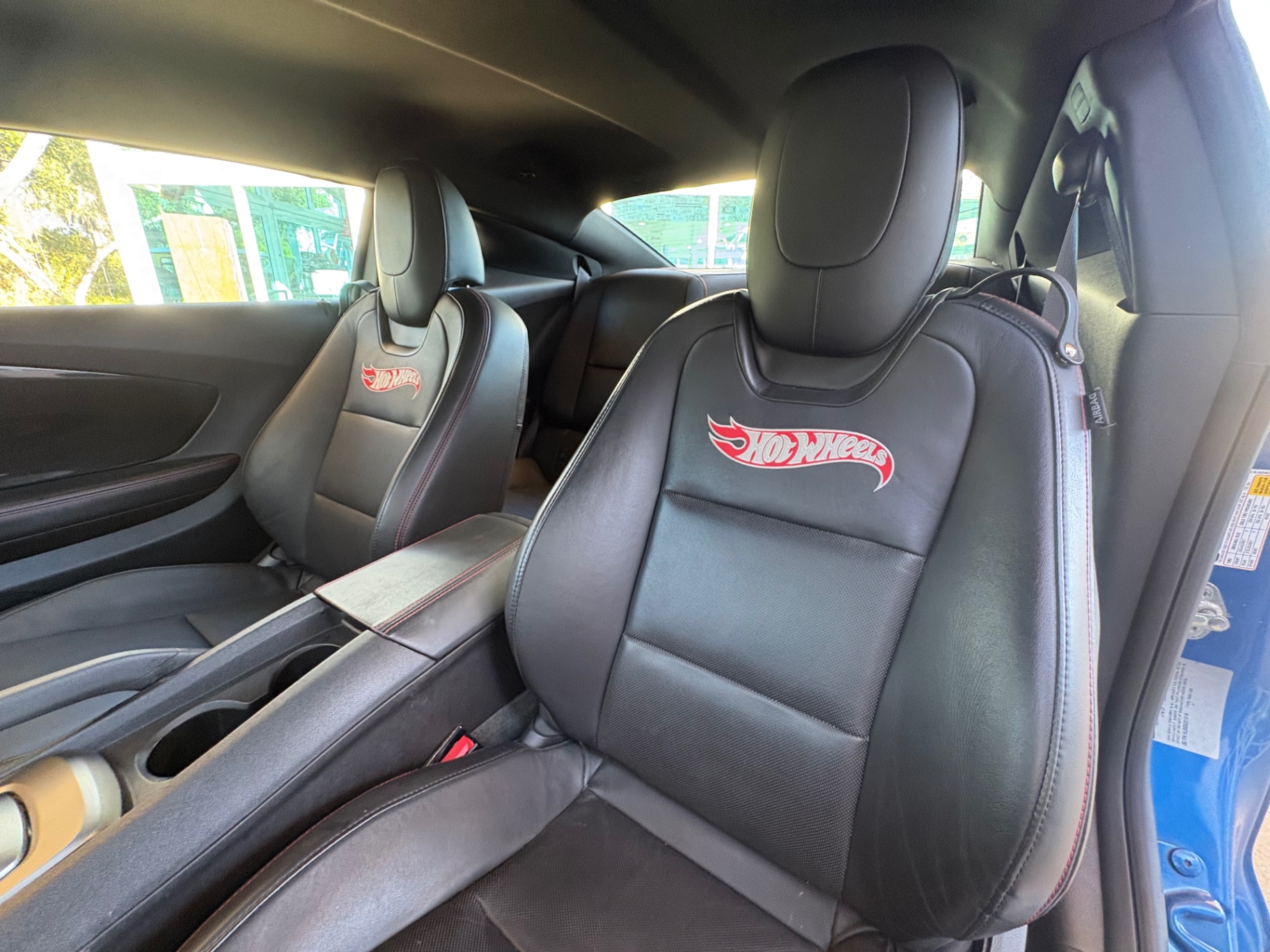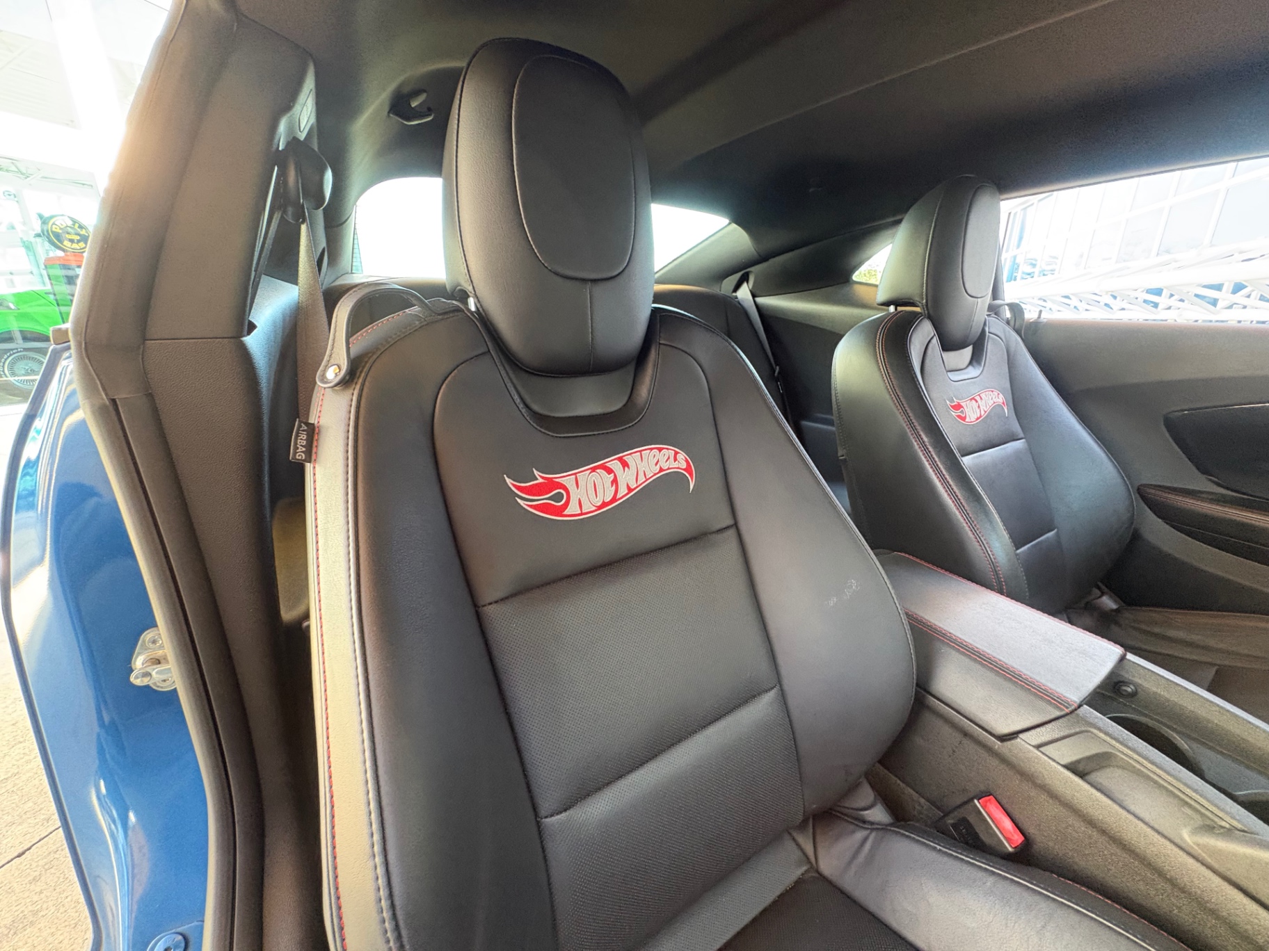 The blue exterior color of the Camaro is noticeable from a distance, and its sporty silhouette is accentuated by sleek lines and aggressive styling. The striking black stripes and unique Hot Wheels badging give this special edition a distinctive touch that sets it apart from standard models. Complemented by 18-inch aluminum wheels that provide a performance-oriented look, the iconic rear spoiler enhances aerodynamics and adds an edge to the overall design. The automatic dusk-sensing headlamps and daytime running lights provide functionality while maintaining the car's sporty appeal.