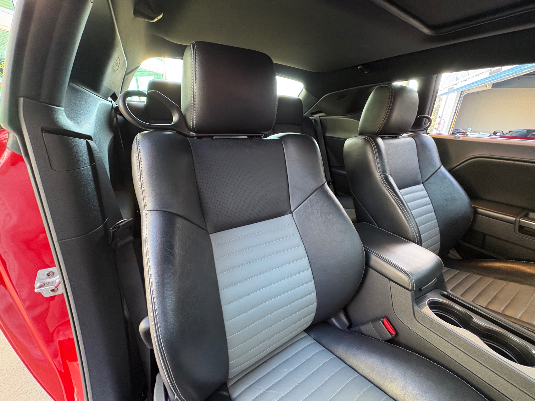 The striking red exterior color is a nod to the classic muscle car heritage and is sure to turn heads wherever you go. This Challenger features dual hood scoops, which not only enhance its aggressive look but also provide functional air intake benefits. The rear body-color spoiler adds to the sporty aesthetics while improving aerodynamic efficiency. Chrome-tipped dual exhaust outlets hint at the power within and produce an exhilarating exhaust note that every muscle car enthusiast craves. The front fog lamps and automatic halogen headlamps ensure visibility during night drives or inclement weather, making this Challenger as practical as it is stylish.