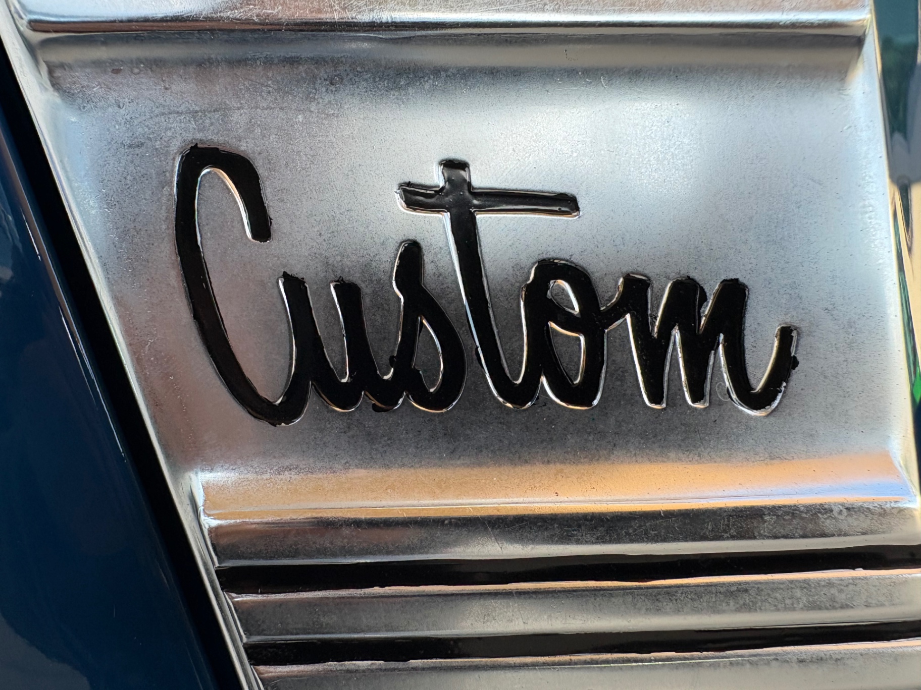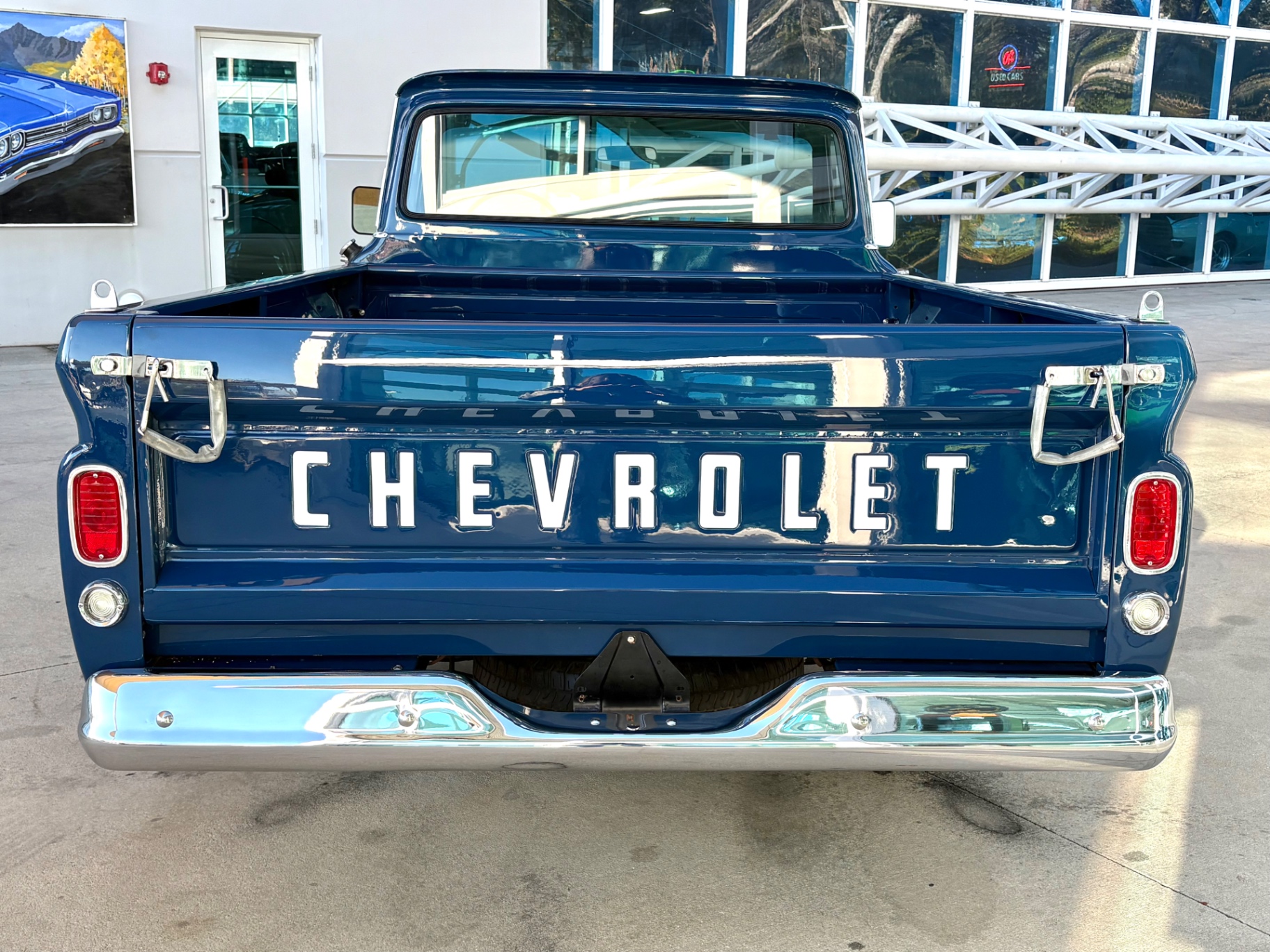 New 350 CID V8 engine, bored .030 over 3-speed manual transmission Ported and polished double hump heads Edelbrock intake 650 CFM 4-barrel carburetor HEI distributor Floor-mounted shifter Center Force clutch with spherical clutch linkage Dark Blue Metallic show-quality paint Anti-corrosion primer with a wet sanded and buffed finish Oak wood bed with Teak stain and 8 coats of Spar marine varnish Polished stainless bed strips Color-matched mid-80s Rally wheels Firestone Firehawk raised white letter tires New upholstery with vinyl material Modern AM/FM/Cassette radio with Kenwood speakers CPP power steering and power front disc brakes Hooker ceramic coated headers 2.5” Flowmaster exhaust system 3” lowering springs with front and rear anti-sway bars LED headlights and taillights Rebuilt rear end Clean Florida title Two-speed electric windshield wipers