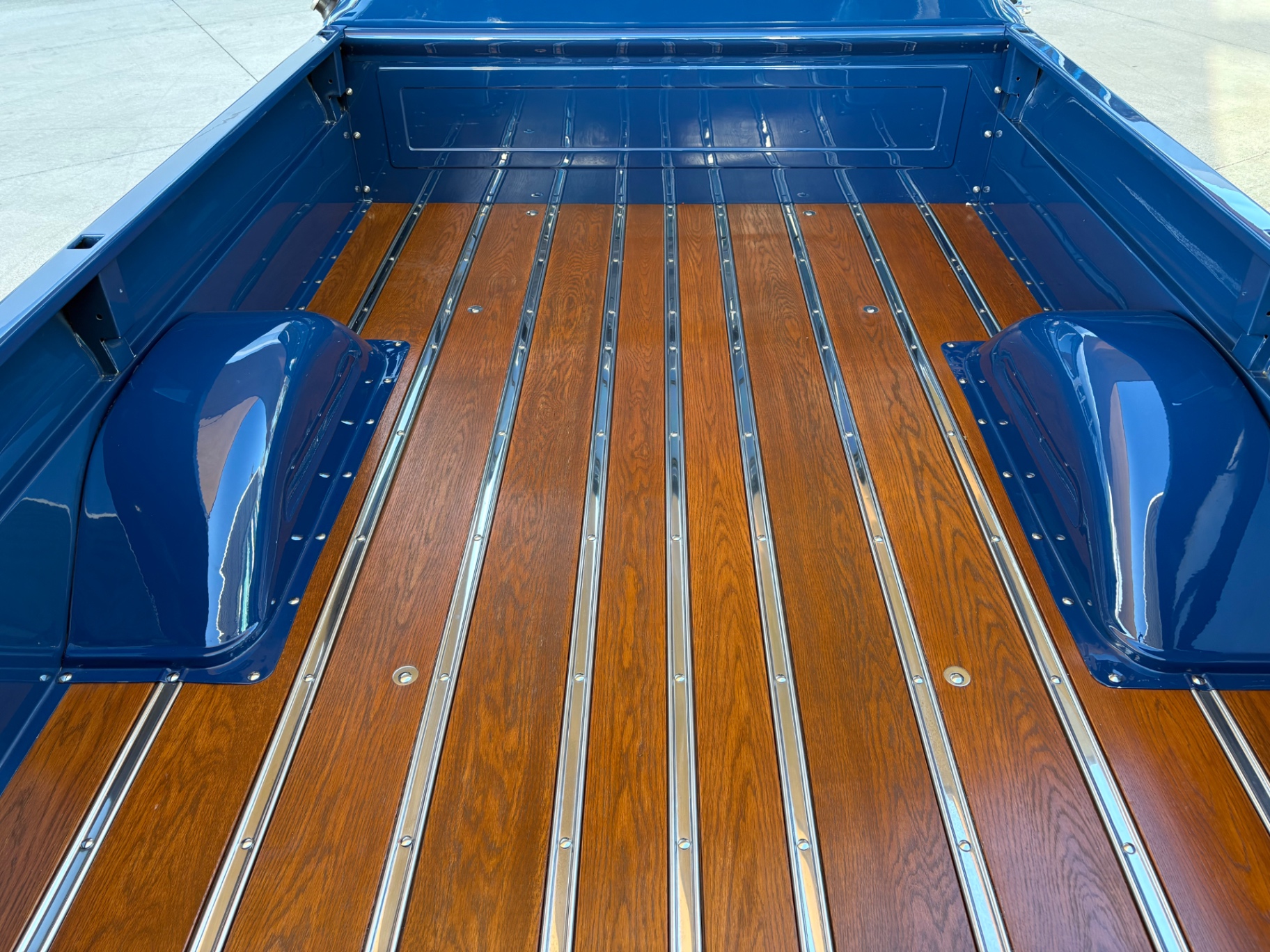 With its stunning dark blue metallic paint, this C10 is a head-turner. The paint process involved stripping the truck to bare metal, applying quality anti-corrosion primer, and achieving a wet sanded and buffed finish that glistens under the sun. The oak wood bed, finished with a rich Teak stain and protected by eight coats of Spar marine varnish, speaks to the craftsmanship that has gone into the restoration. Polished stainless bed strips add a perfect touch of shine, enhancing the truck's robust character.
