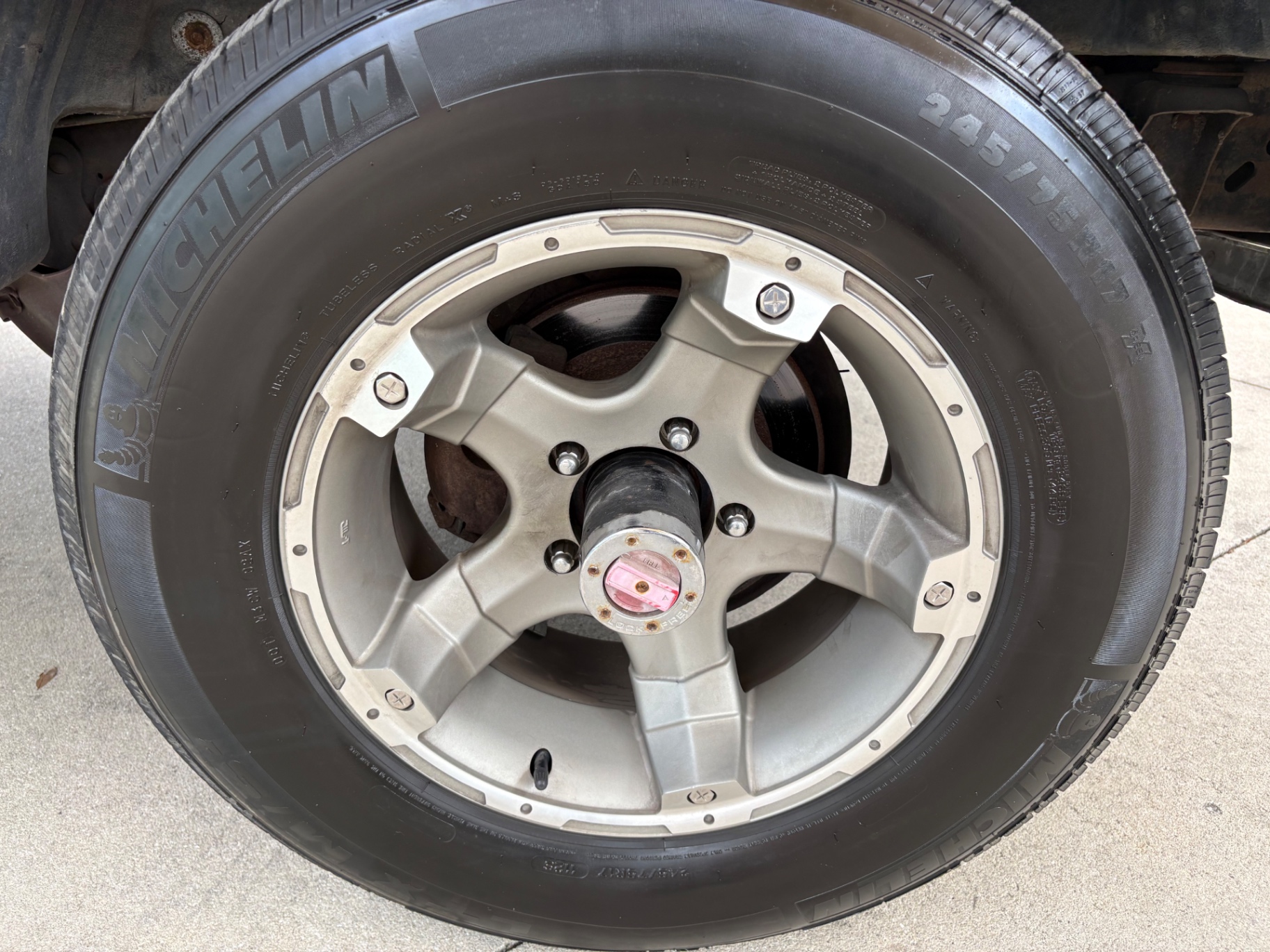 Viper Red is a color that suits the Bronco's proportions well, and the fresh paint job brings out the clean body lines that define the fourth-generation design. The bodywork is straight, and the chrome front and rear bumpers are in good shape — chrome bumpers on a truck this age are often pitted or showing rust, so intact chrome is a meaningful detail. The rear spare tire mount carries a full-size spare with a Ford Bronco branded cover, keeping everything period-correct in appearance. The trailer hitch is installed at the rear, adding practical utility without detracting from the overall look. The wheels and tires are approximately three years old, leaving plenty of service life remaining.