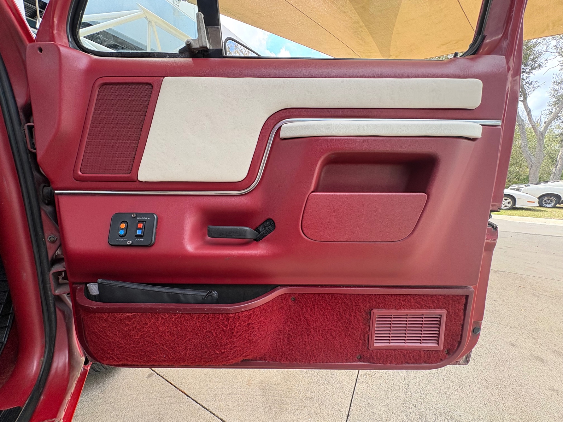 The interior of this 1989 Ford Bronco XLT is finished in red and tan vinyl, which suits the XLT trim level and holds up better over time than cloth in a vehicle that sees sunlight and humidity. The door panels are intact and color-correct, with the power window and lock switches properly positioned and fully operational. The power windows and locks have been completely redone, meaning the switches, wiring, and motors have been addressed — not just the cosmetic trim. The rear window is also functional, which is a detail that often gets overlooked on Broncos of this vintage. When those rear window motors fail, replacement parts can be surprisingly difficult to source, so a working unit is worth noting.