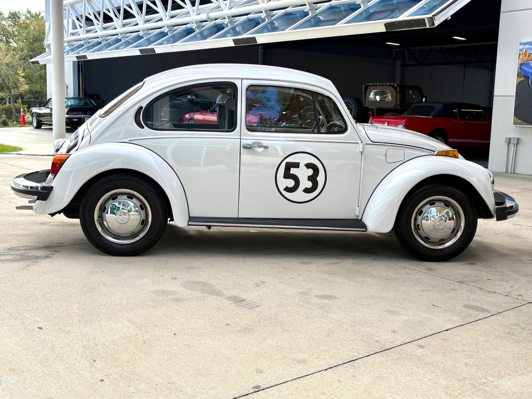 The 1974 Volkswagen Beetle was the last of the classic air-cooled Beetles sold new in the United States, which gives any well-preserved example from this year a specific historical position. This one layers a recognizable and carefully executed Herbie Number 53 tribute on top of that history, creating a car that appeals both to Volkswagen collectors and to anyone who grew up watching the Love Bug films. The mechanical package is honest — an air-cooled 1.6-liter four and a 4-speed manual — which means the car is maintainable with tools and parts that are still widely available. The livery is done right, the chrome is intact, and the interior is clean. It is a complete, drivable presentation with a clear identity.