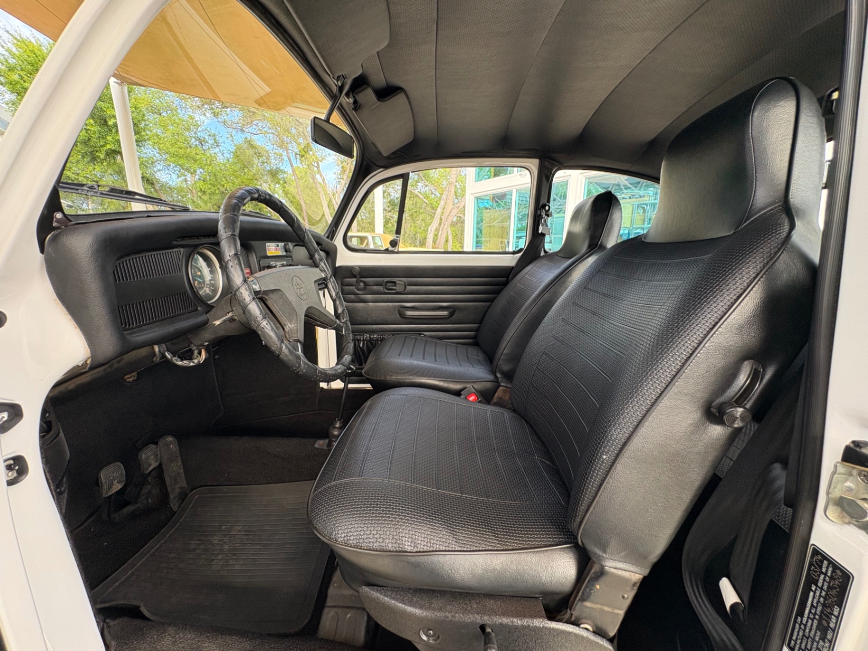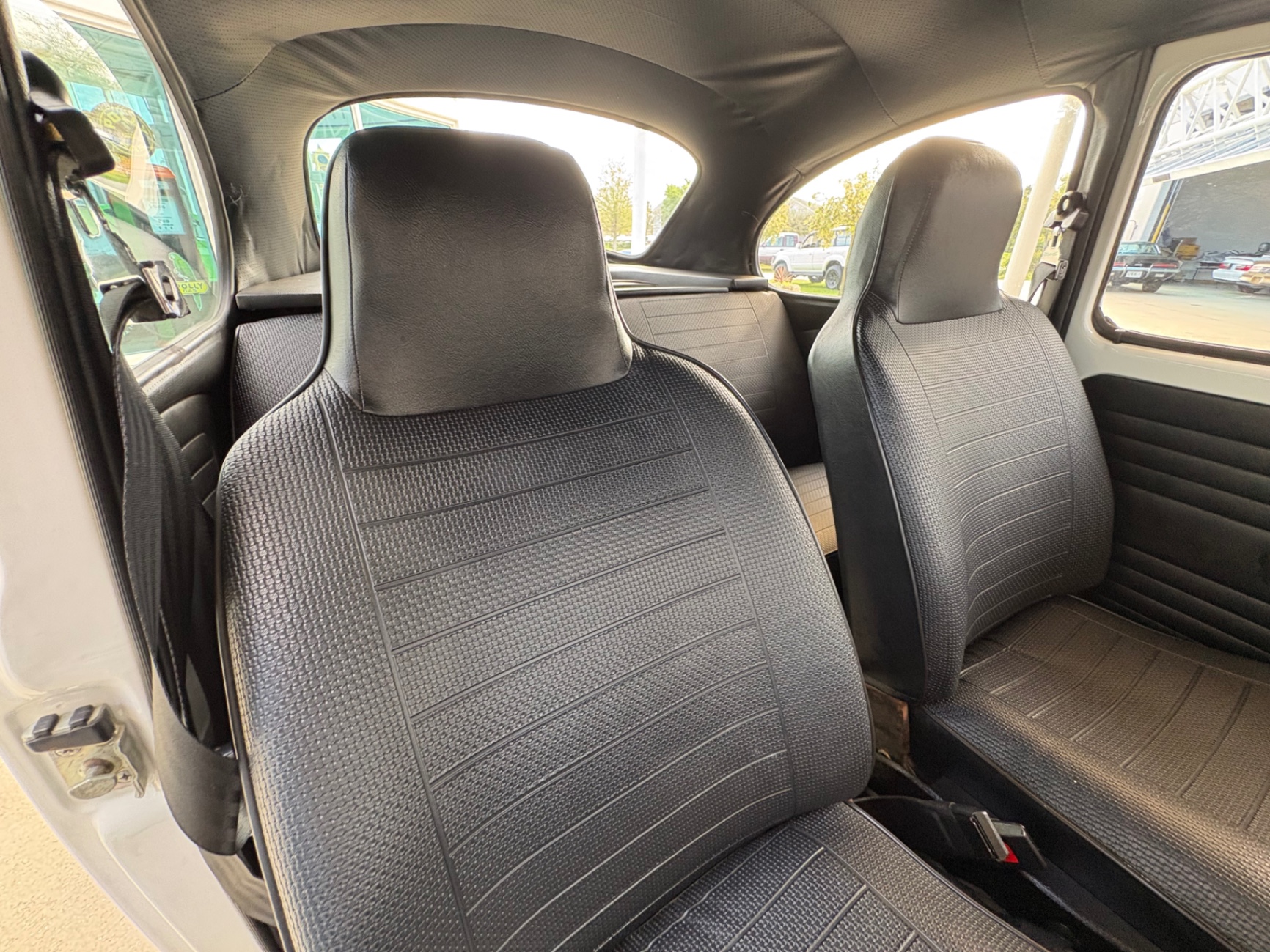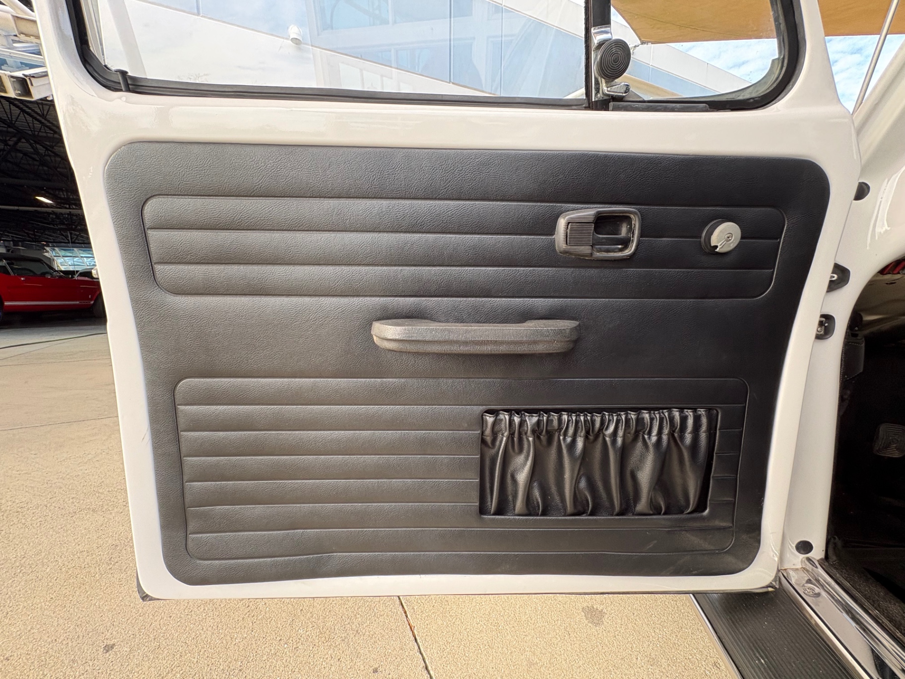 The interior is finished in black vinyl throughout, which was a standard and durable choice for the Beetle in this era. The door panels carry the correct ribbed vinyl pattern with the period-correct accordion-style map pockets sewn into the lower portion — a detail that shows up clearly in the photos and confirms the panels are correct to the car. These pockets were a practical addition that Beetle owners used heavily given the limited storage real estate elsewhere in the cabin.
