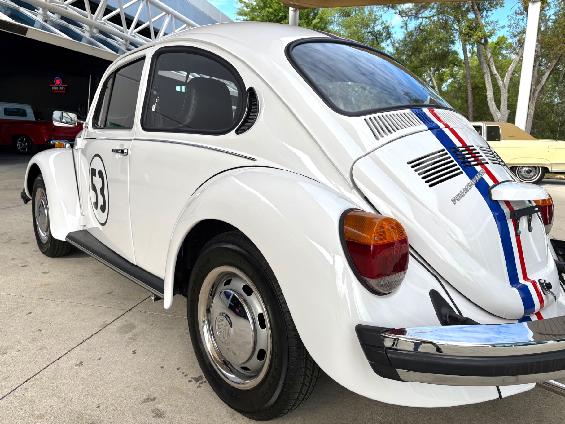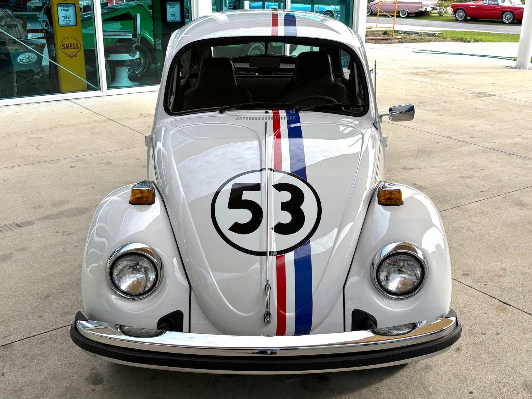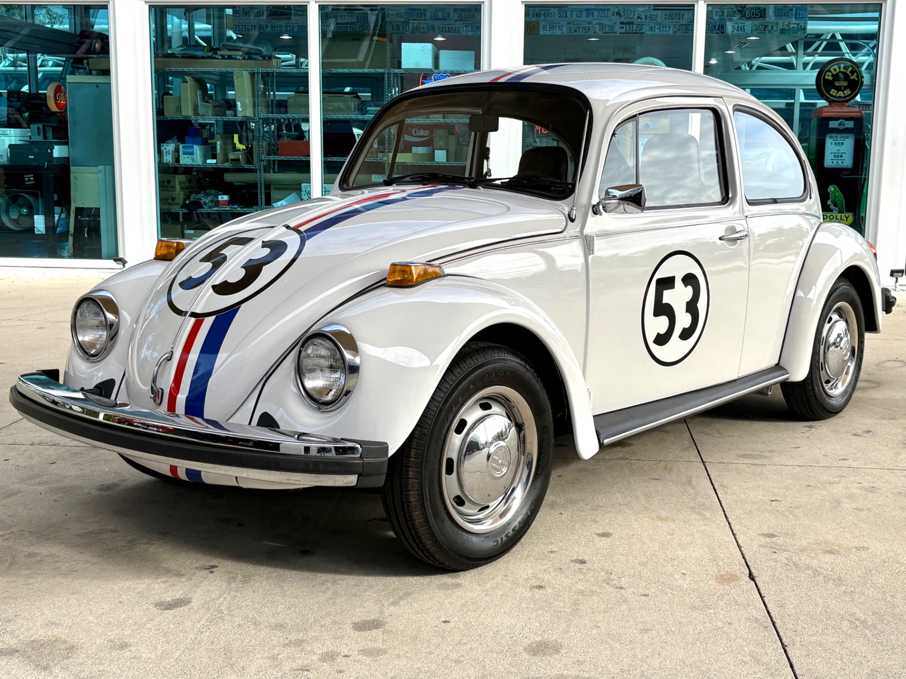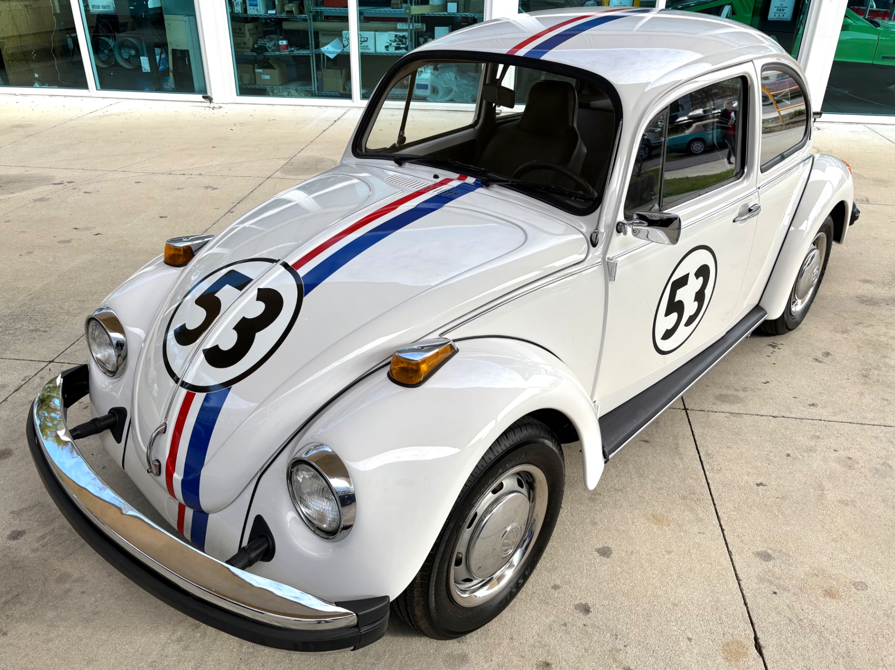 - 1.6L Air-Cooled Flat-4 Engine - 4-Speed Manual Transmission - Herbie Number 53 Tribute Livery - Red, White, and Blue Racing Stripes — Full Length - Number 53 Roundels on Hood, Doors, and Rear - Dual Exhaust Tips - Chrome Bumpers Front and Rear - Wrapped Steering Wheel - AM/FM Radio - Black Vinyl Interior - Door Map Pockets - Front Trunk Storage - Spare Tire Included