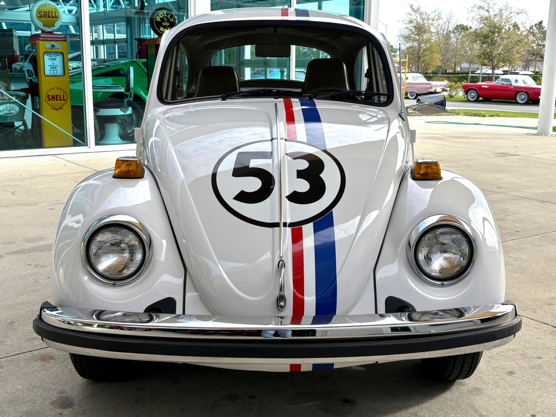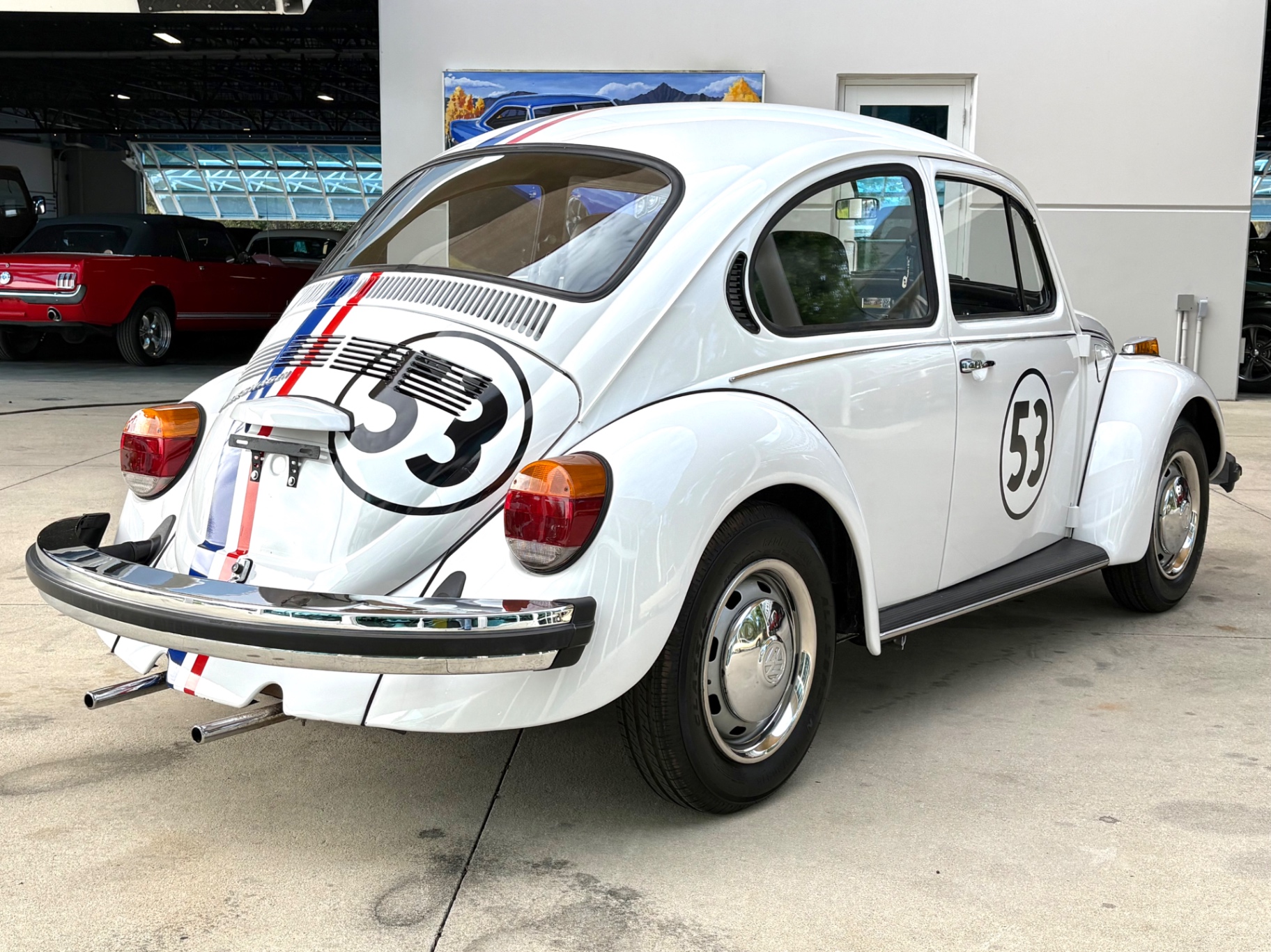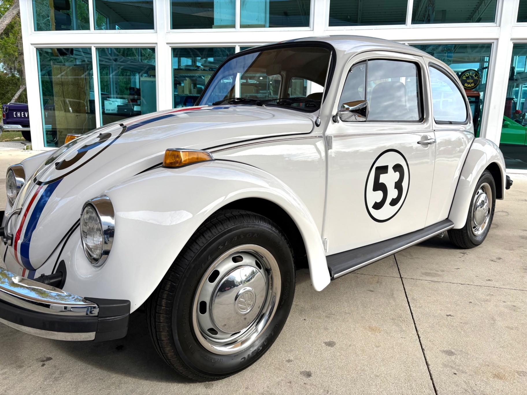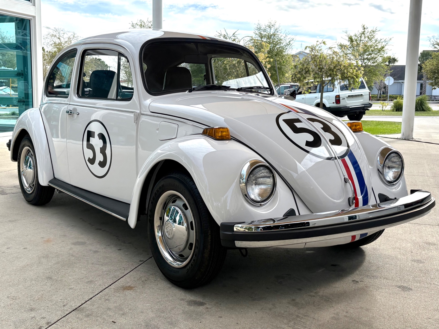 - 1.6L Air-Cooled Flat-4 Engine - 4-Speed Manual Transmission - Herbie Number 53 Tribute Livery - Red, White, and Blue Racing Stripes — Full Length - Number 53 Roundels on Hood, Doors, and Rear - Dual Exhaust Tips - Chrome Bumpers Front and Rear - Wrapped Steering Wheel - AM/FM Radio - Black Vinyl Interior - Door Map Pockets - Front Trunk Storage - Spare Tire Included