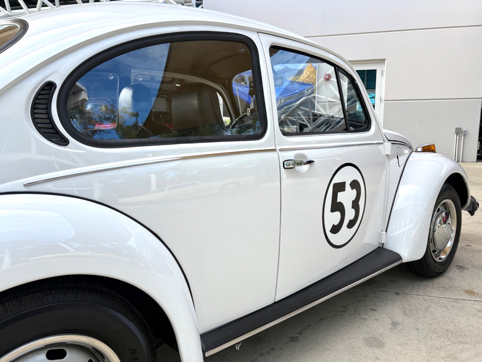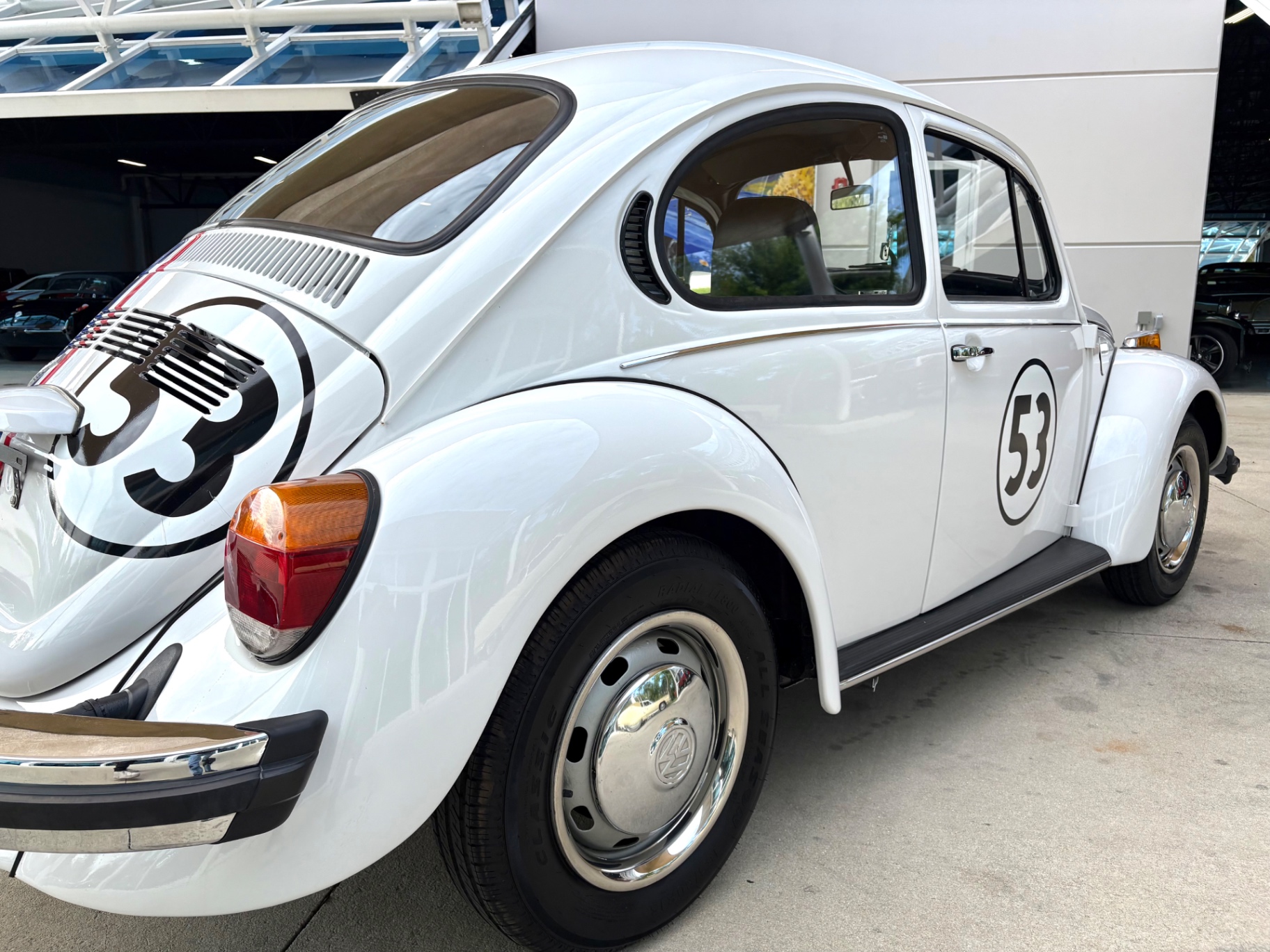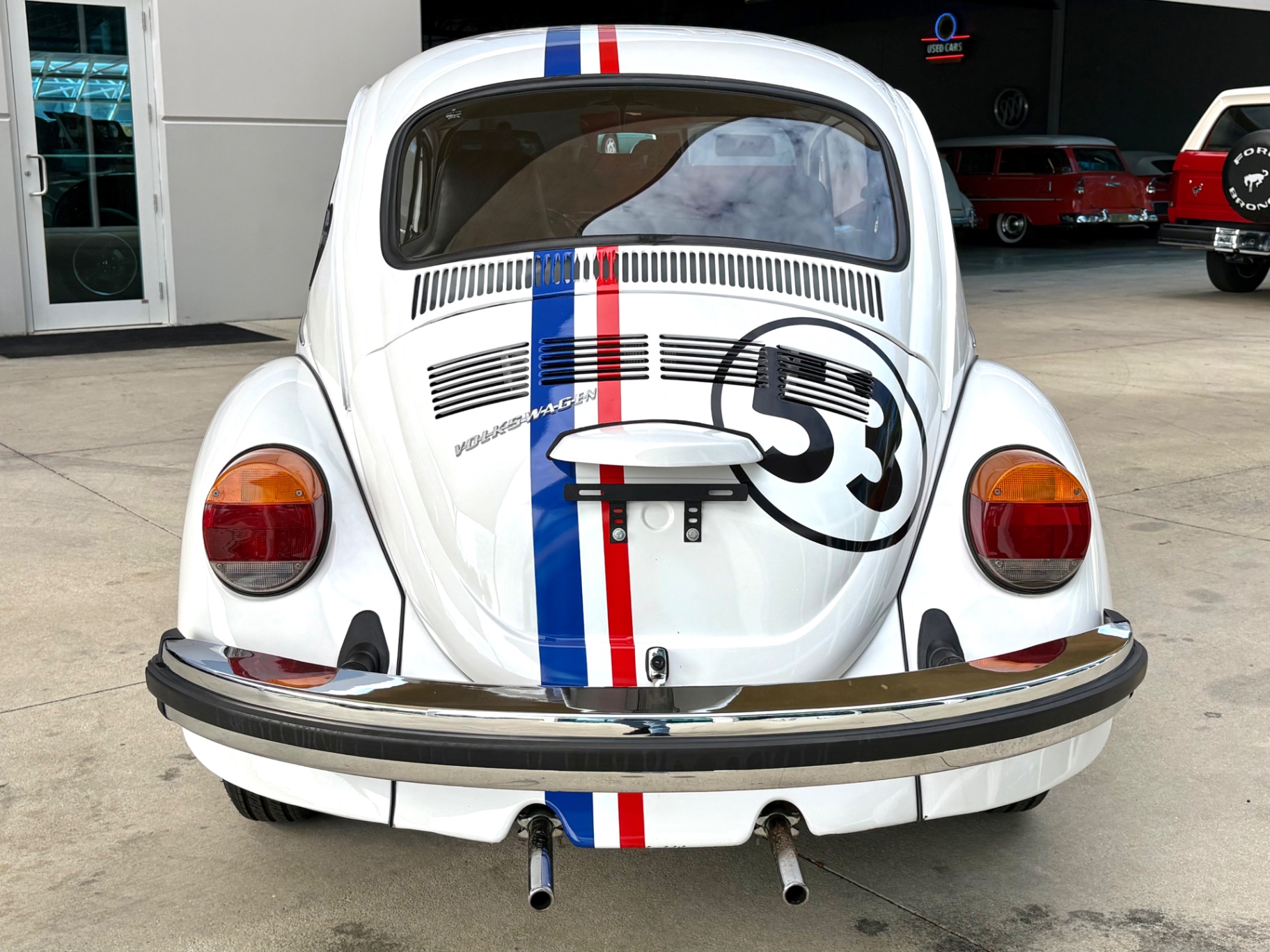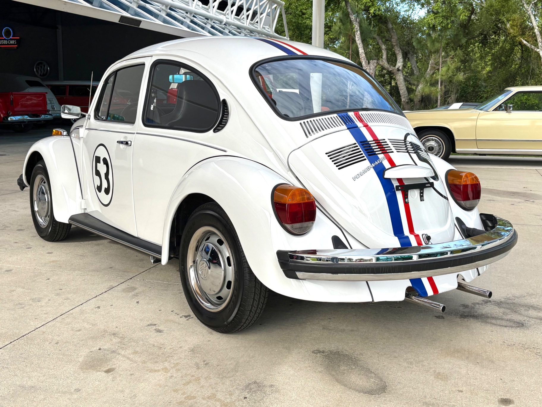 - 1.6L Air-Cooled Flat-4 Engine - 4-Speed Manual Transmission - Herbie Number 53 Tribute Livery - Red, White, and Blue Racing Stripes — Full Length - Number 53 Roundels on Hood, Doors, and Rear - Dual Exhaust Tips - Chrome Bumpers Front and Rear - Wrapped Steering Wheel - AM/FM Radio - Black Vinyl Interior - Door Map Pockets - Front Trunk Storage - Spare Tire Included