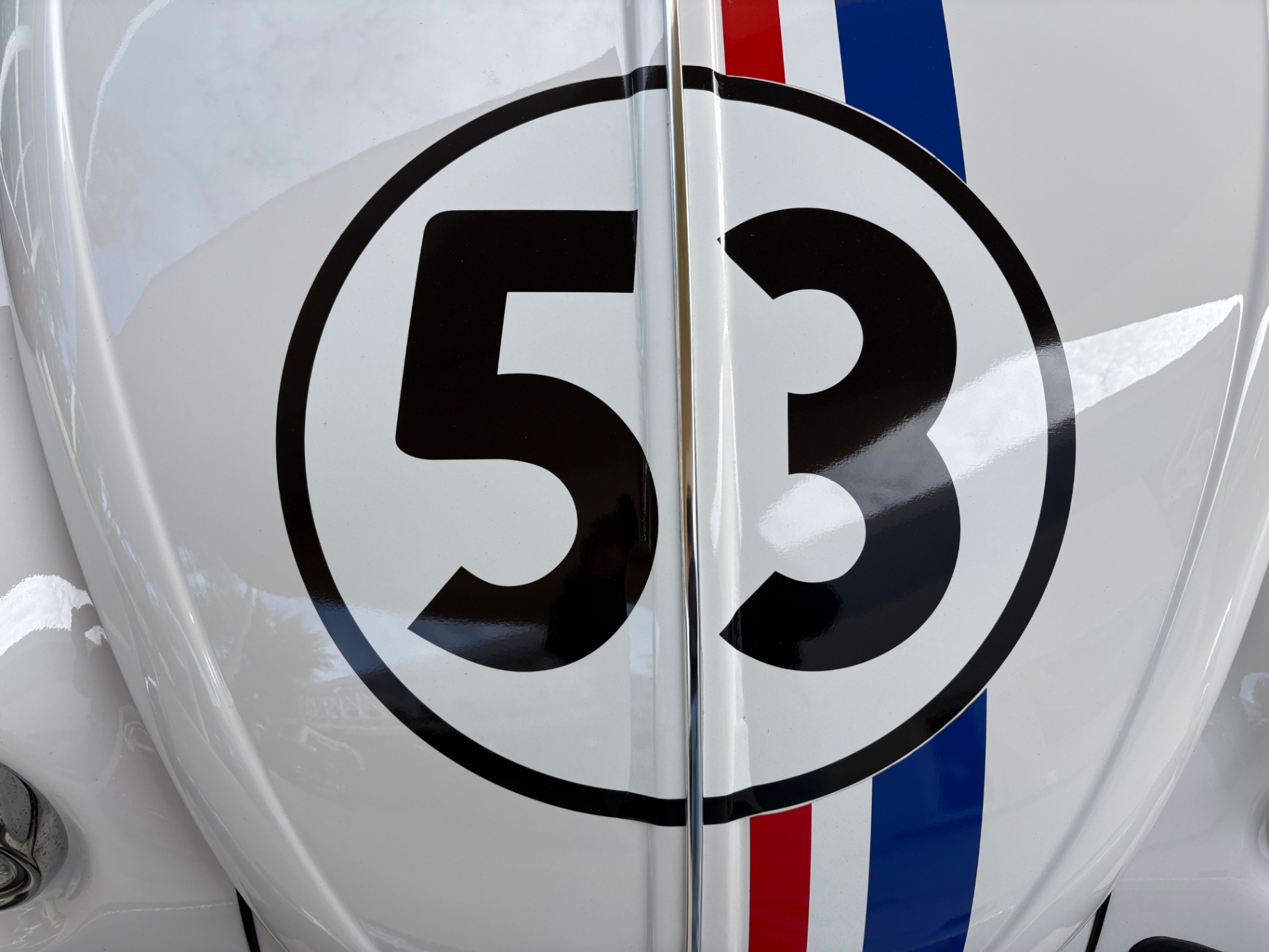 The white base paint provides the correct foundation for the Herbie livery, and the execution here is faithful to the film cars. The red, white, and blue stripes run in three parallel bands from the front valance over the hood, across the roof, and down the engine lid to the rear bumper. The number 53 appears in bold black numerals inside a black-outlined circle on the hood and on both front doors — exactly as it appeared in the Disney productions. The stripes also wrap onto the rear apron and are visible from directly behind the car, consistent with the way the original Disney studio cars were painted.