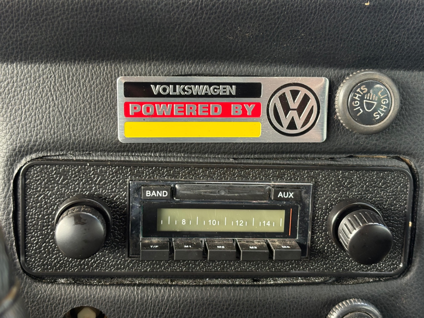 The steering wheel has been wrapped, which improves grip and gives the driver a more tactile connection to the front wheels. The Beetle's steering in this period was unassisted, so feel through the wheel matters. An AM/FM radio is fitted, replacing what would have been a basic factory AM unit or no radio at all. The front trunk — the frunk, as it is commonly called — provides usable storage space ahead of the front axle, which partially compensates for the lack of a traditional rear trunk. The spare tire is included and stows in the front trunk in the standard Beetle location beneath the luggage floor.