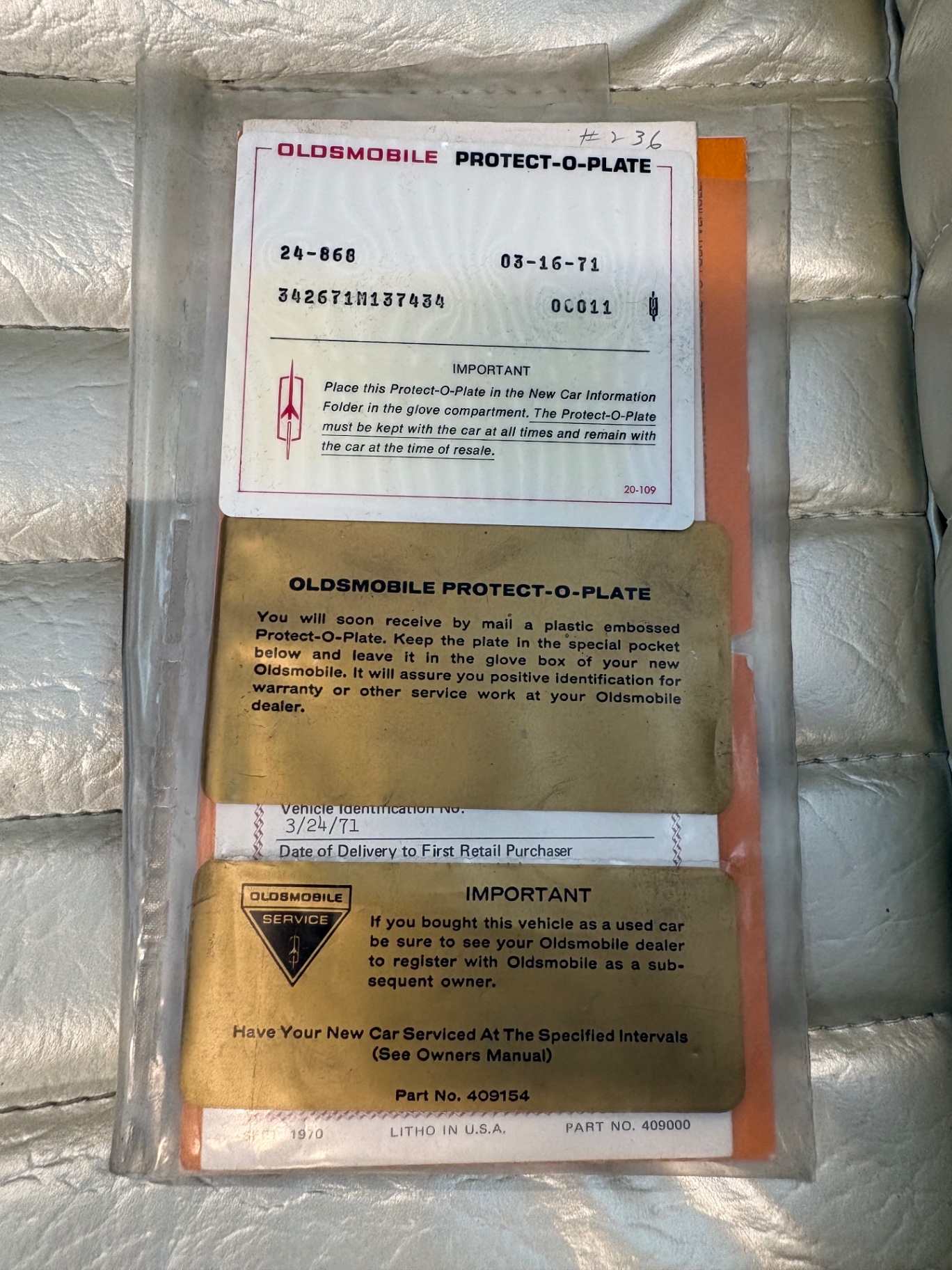 This 1971 Oldsmobile Cutlass Supreme Convertible has been built with a specific goal in mind, and it achieves it. Every major upgrade — the fuel injection, the overdrive transmission, the Ride Tech suspension, the disc brakes, the updated A/C — addresses a real-world limitation of the original car. The documentation, including the Protect-O-Plate and owner's manual, confirms the car's identity and history. The convertible body style on a genuine 1971 Cutlass Supreme is increasingly difficult to find, and one prepared to this level of drivability is rarer still. This is a car you can load up and drive to Key West, up the coast, or across the country without second-guessing the decision.