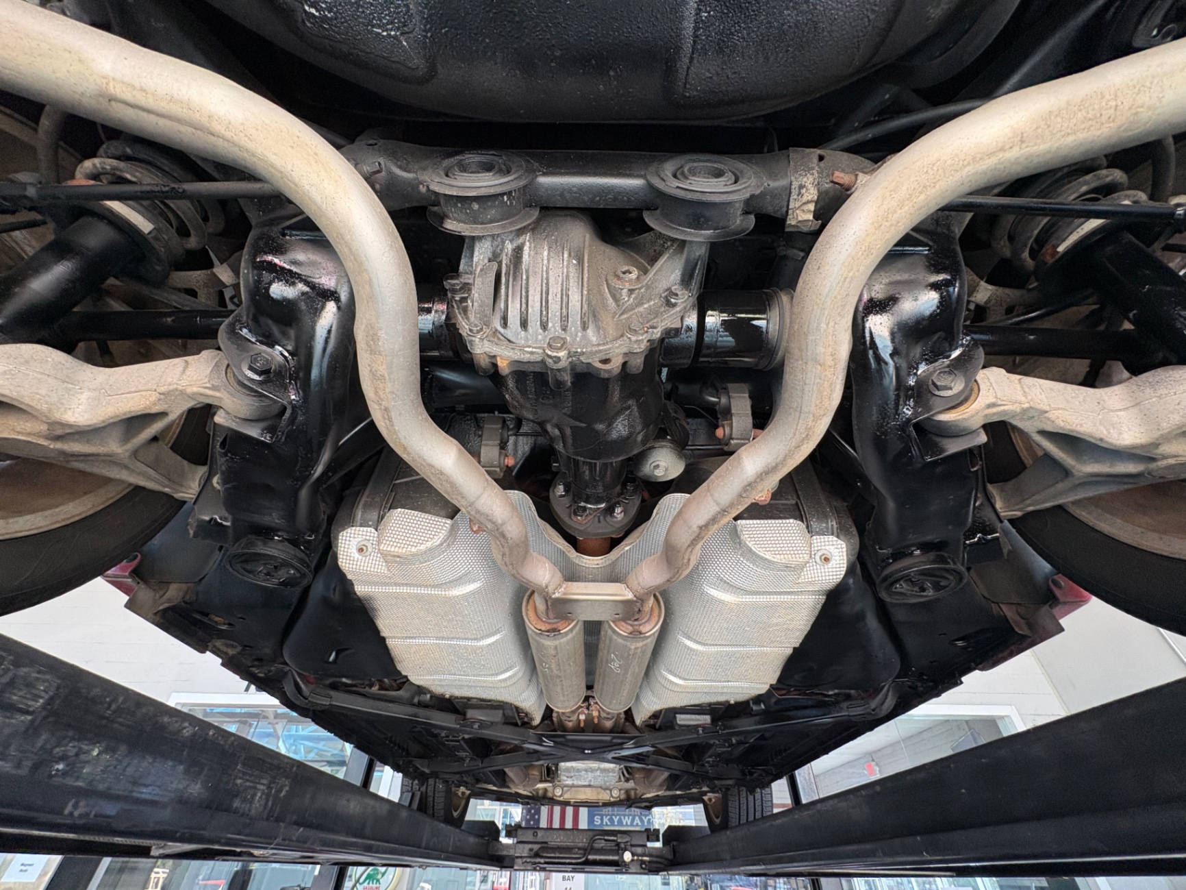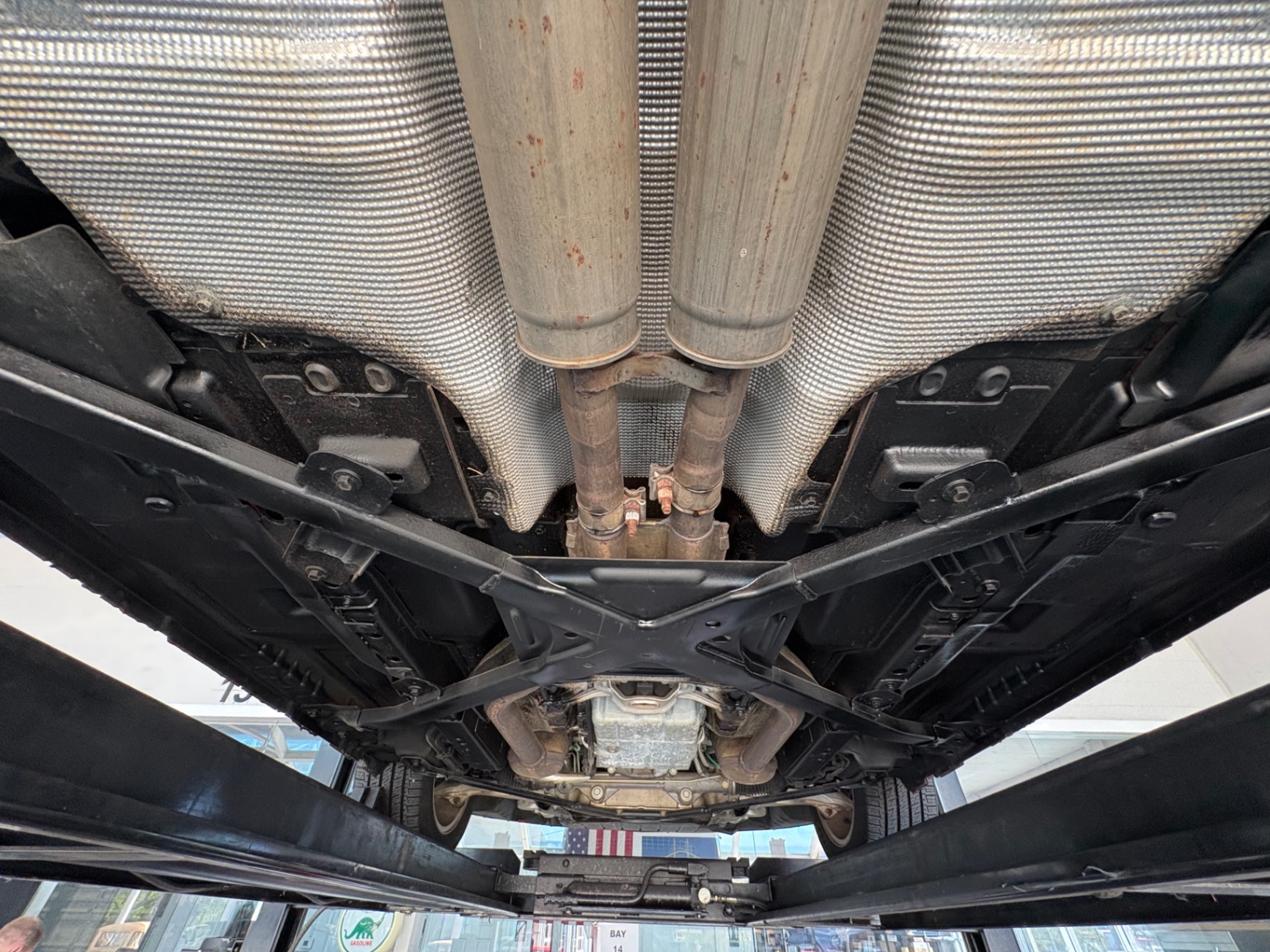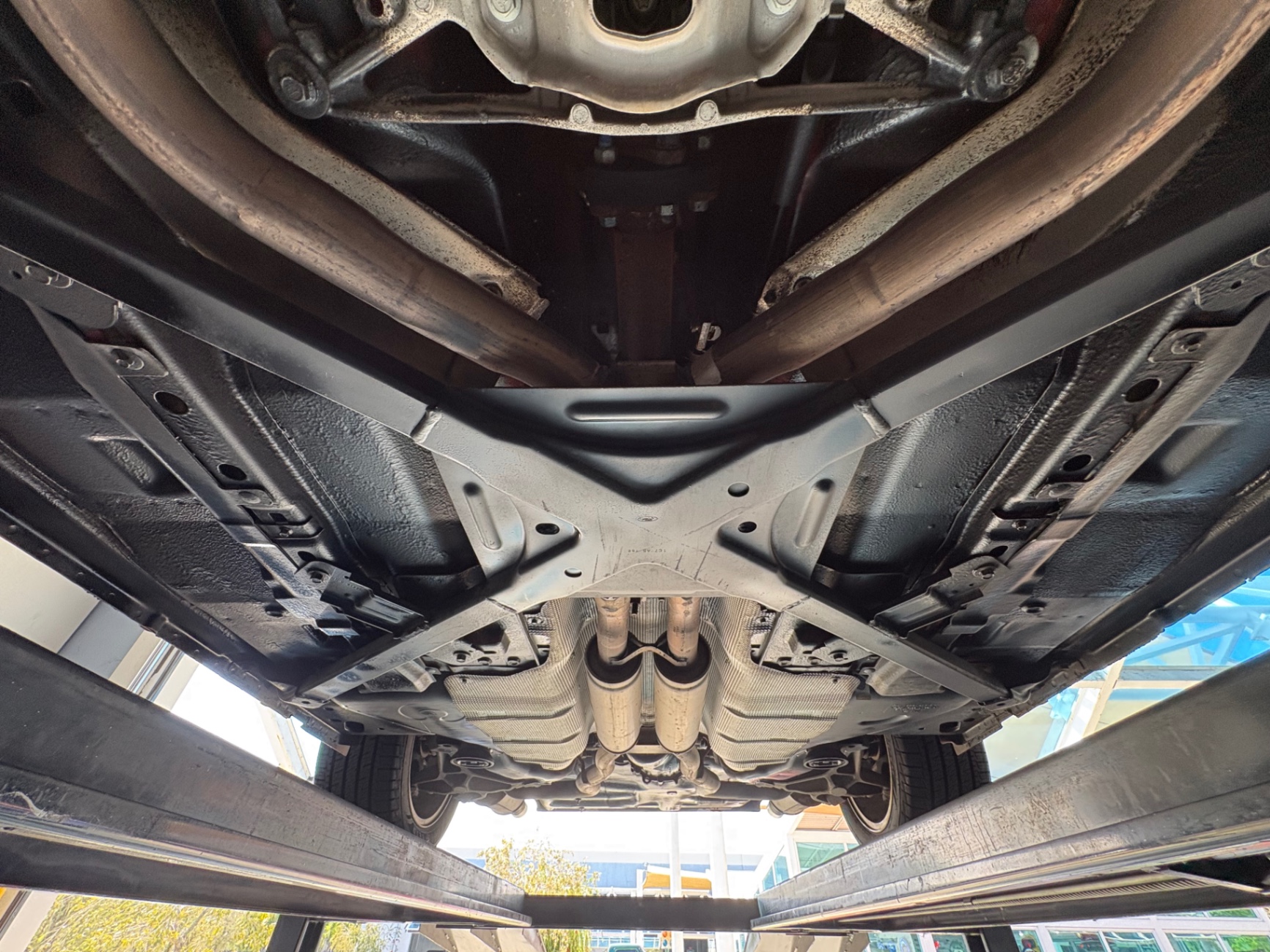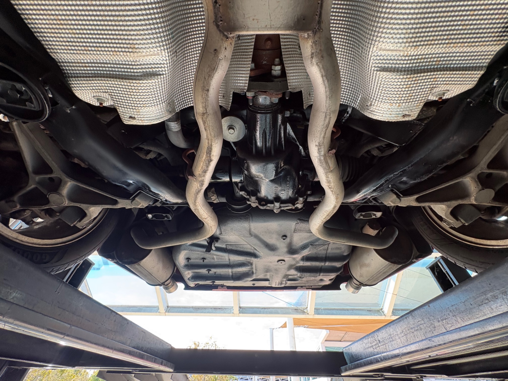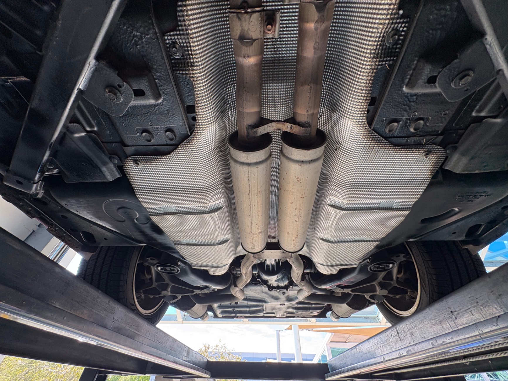 The undercarriage photos show the factory dual exhaust system intact and the suspension geometry in sound condition — a useful reference point for buyers evaluating the car's mechanical health at a glance.