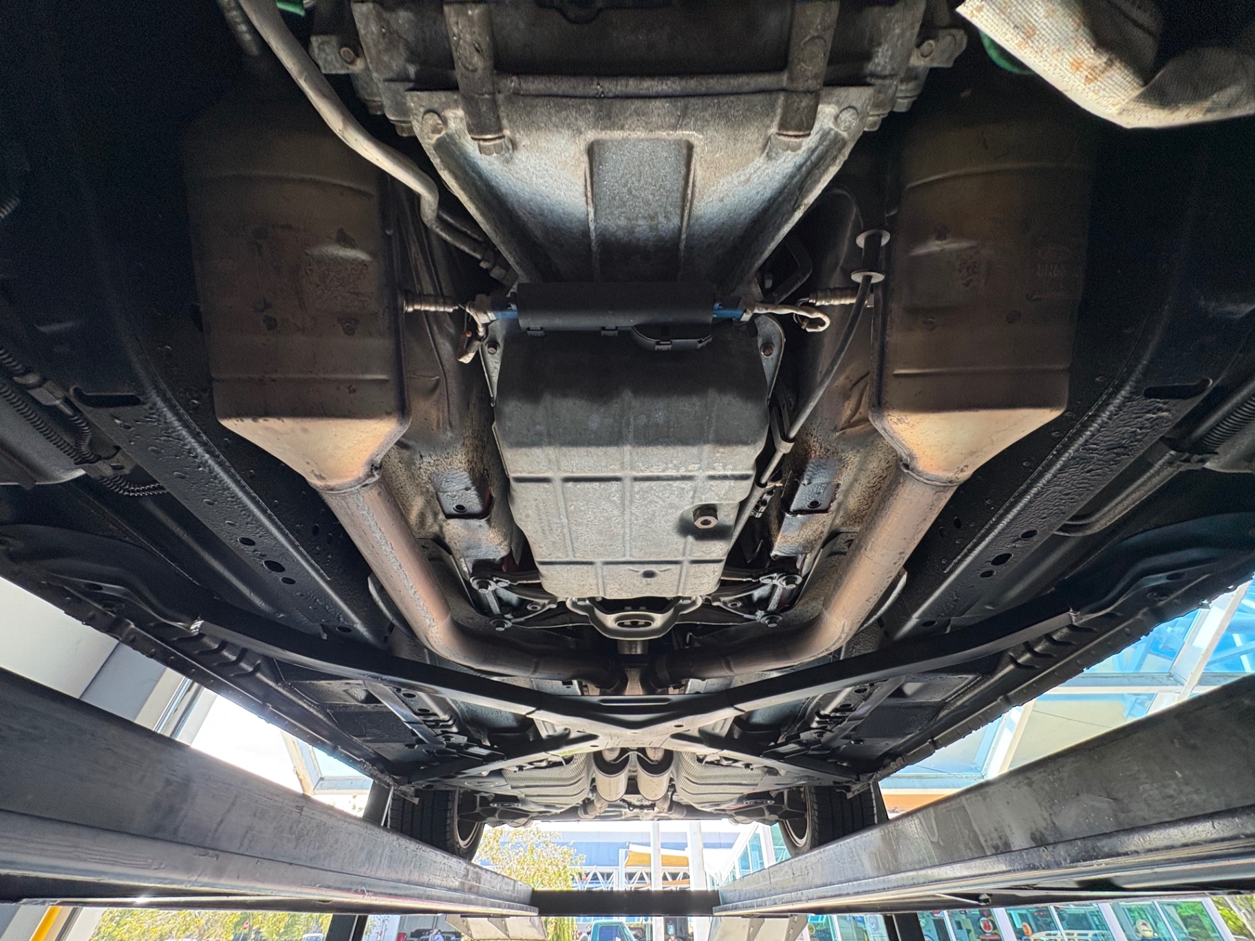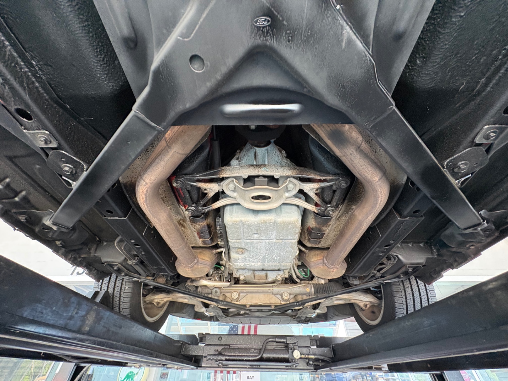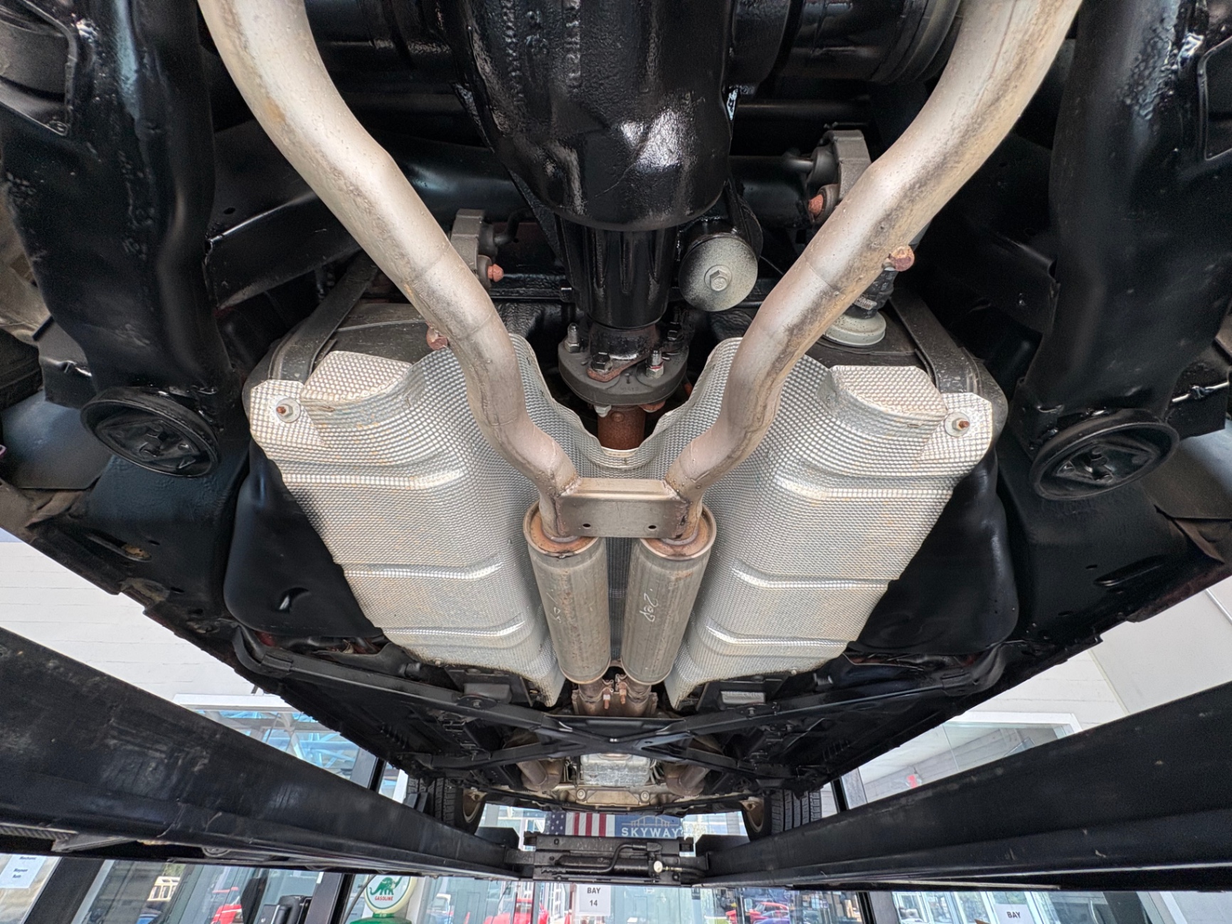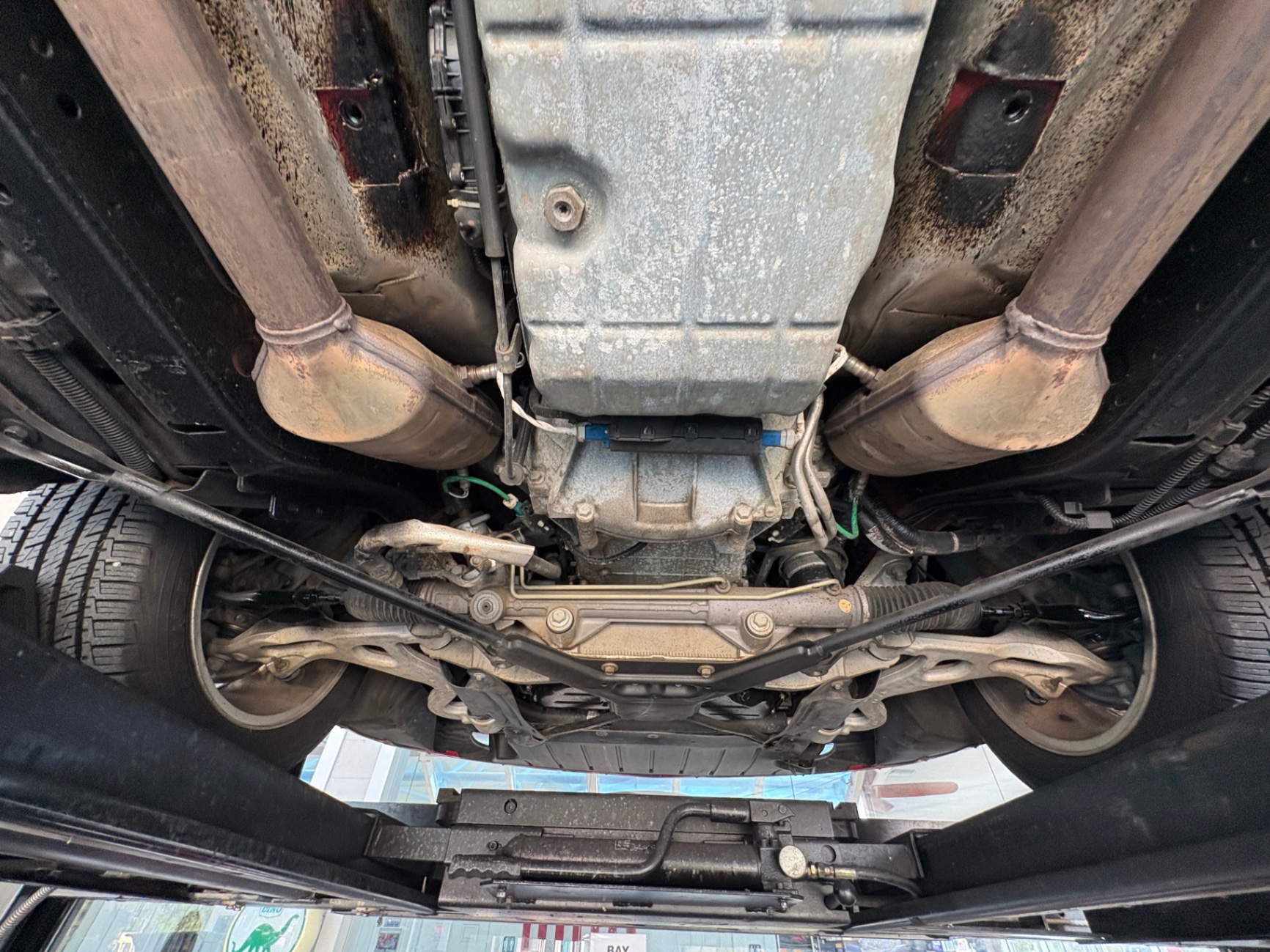 The undercarriage photos show the factory dual exhaust system intact and the suspension geometry in sound condition — a useful reference point for buyers evaluating the car's mechanical health at a glance.