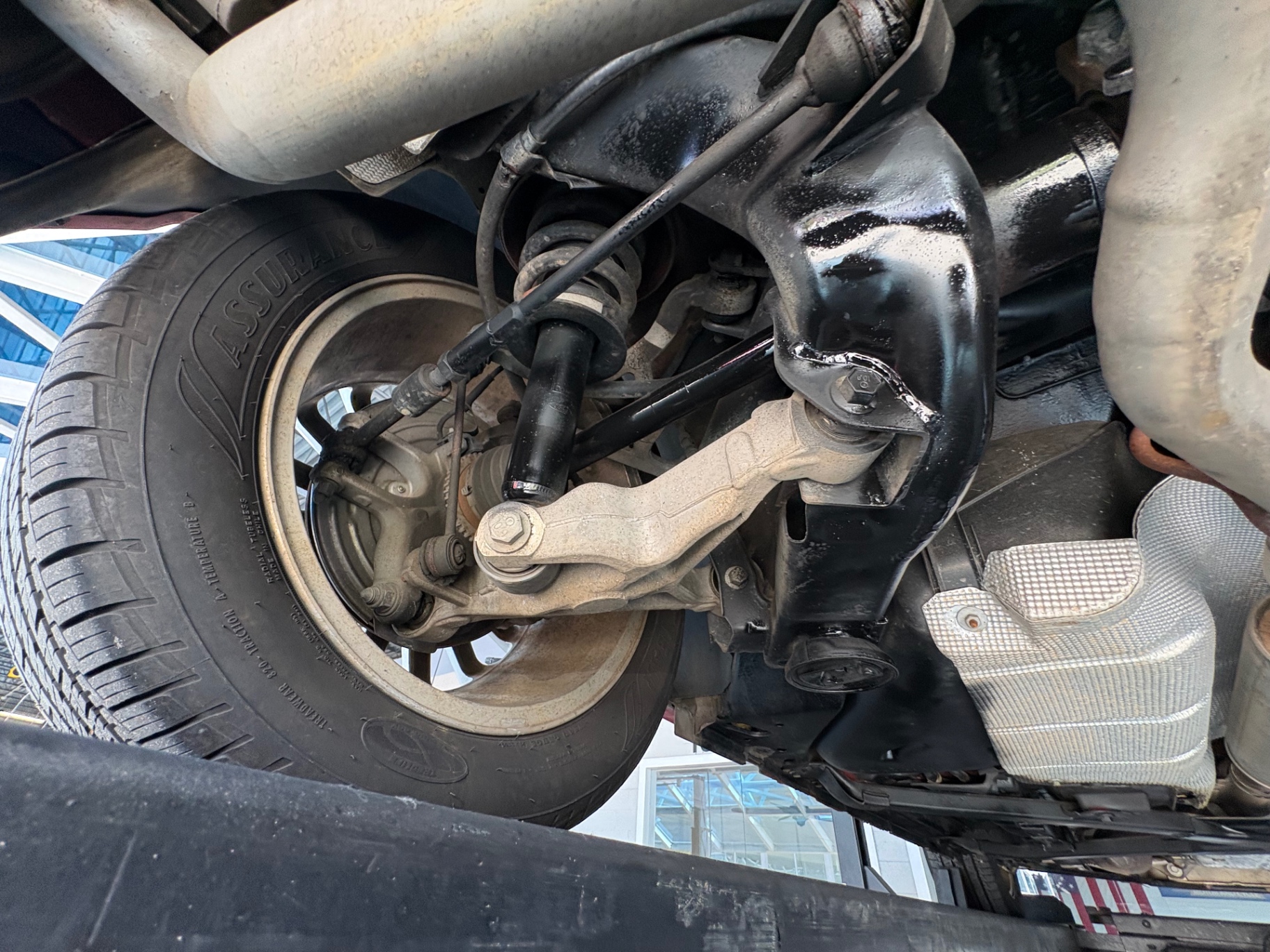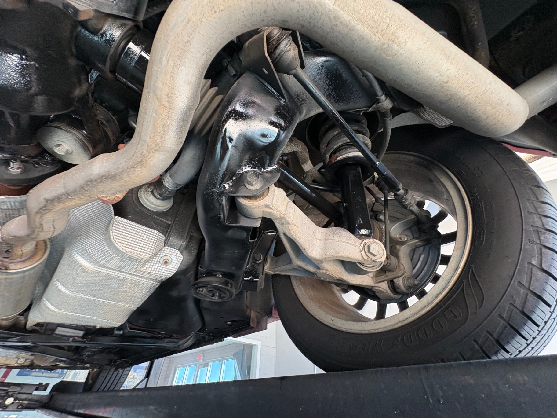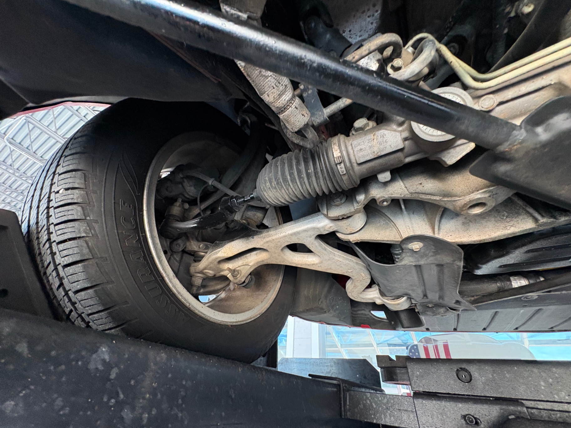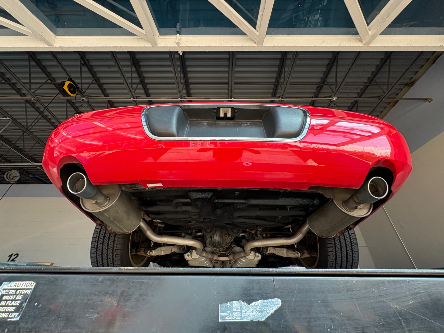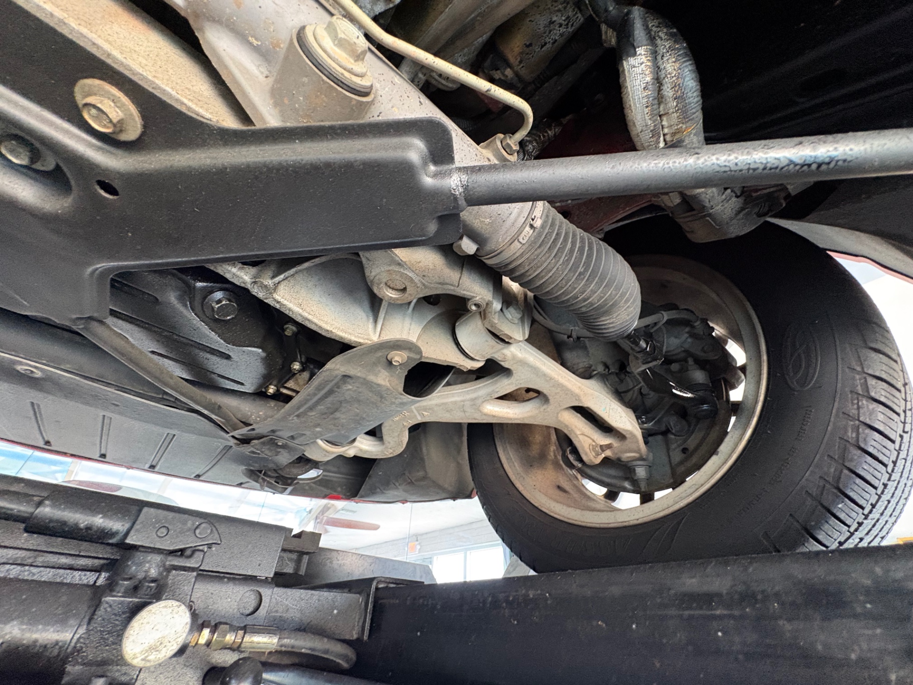 The undercarriage photos show the factory dual exhaust system intact and the suspension geometry in sound condition — a useful reference point for buyers evaluating the car's mechanical health at a glance.