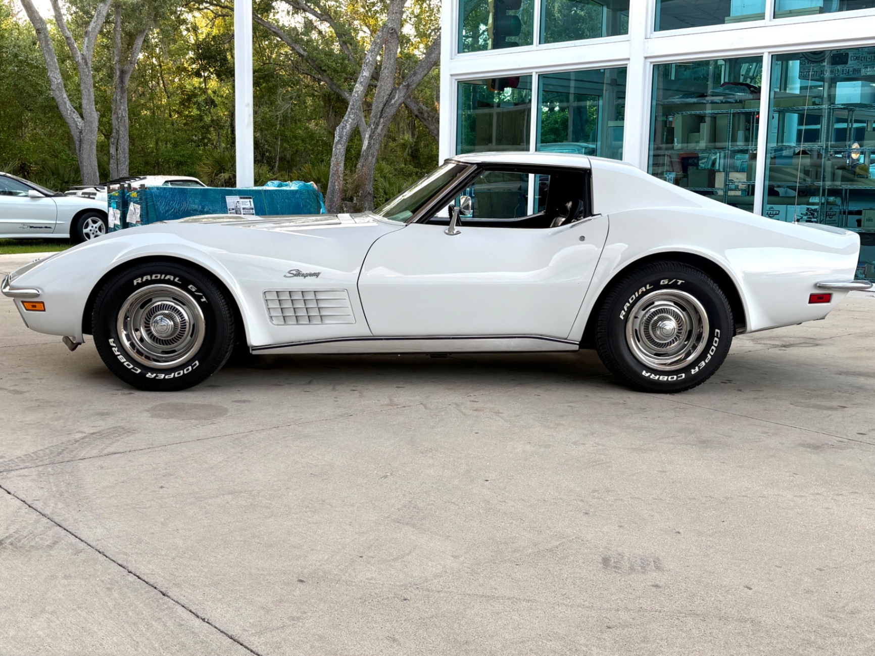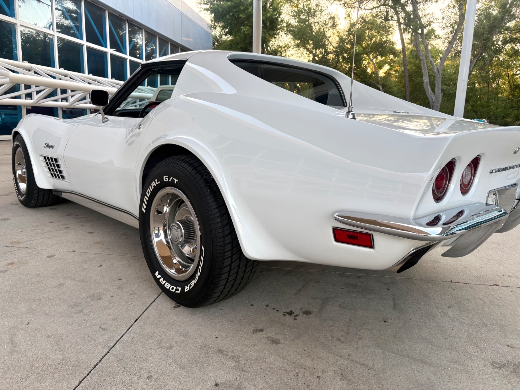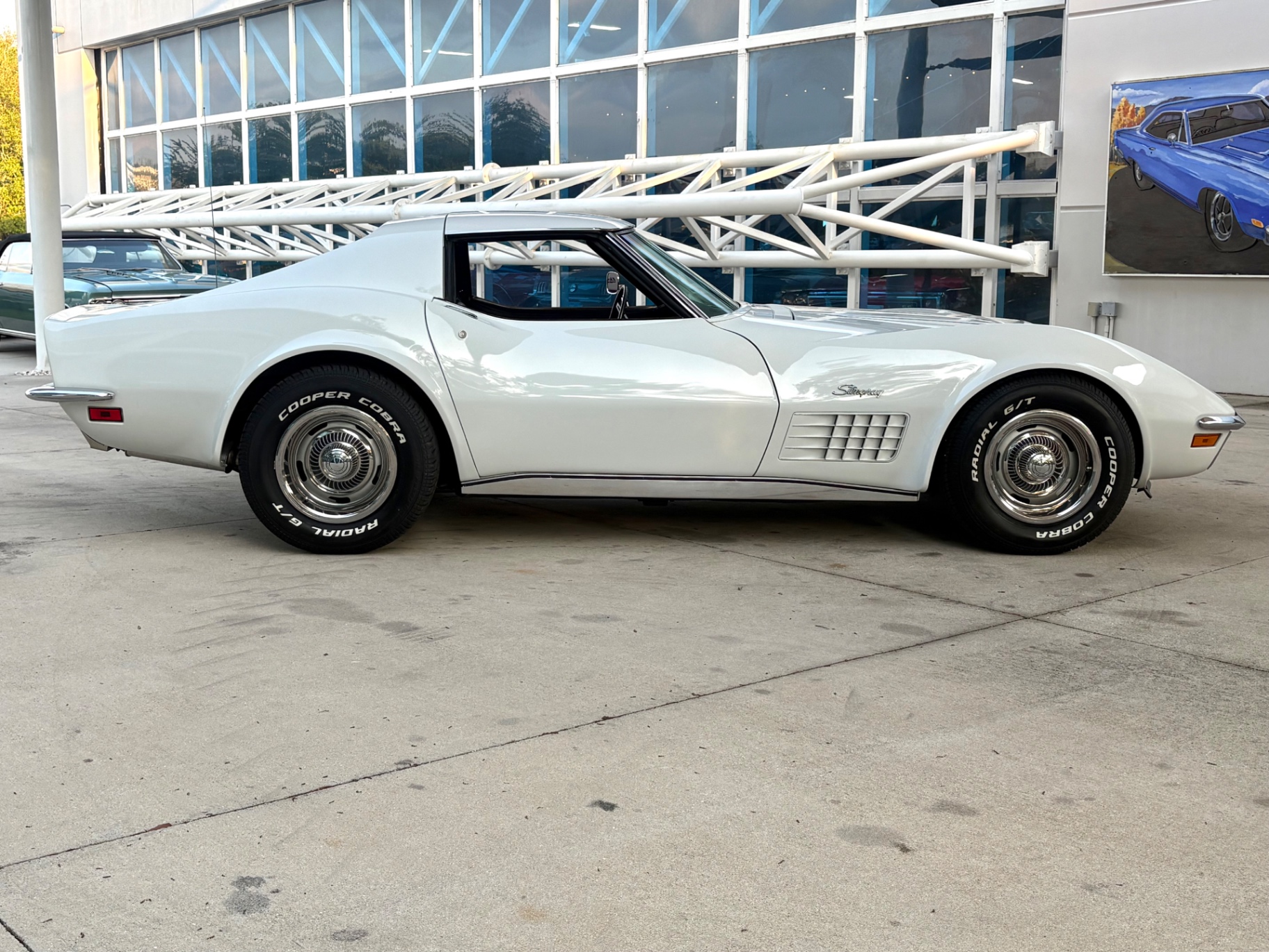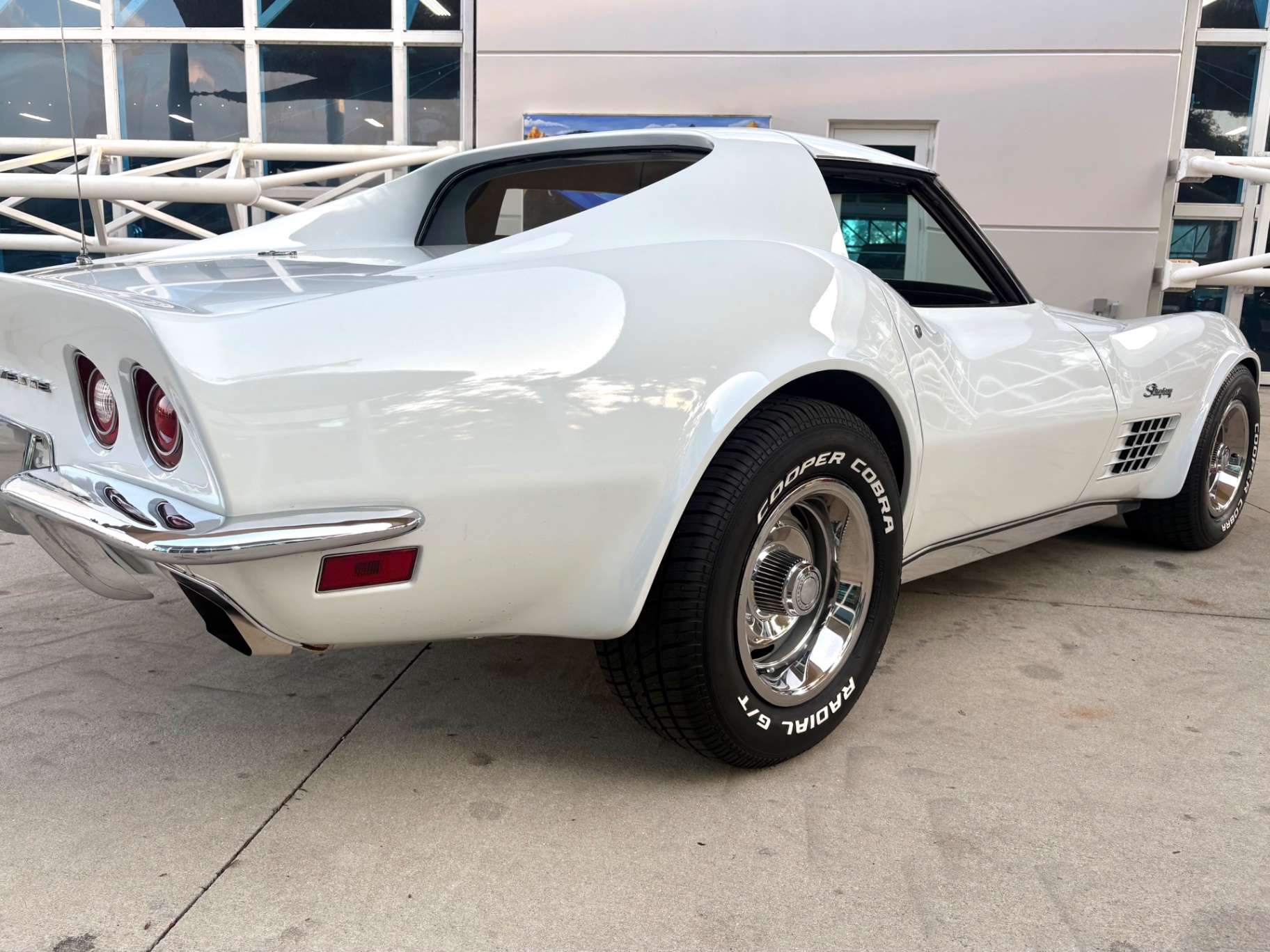 White is a straightforward color choice on a C3 Corvette, and it works particularly well with the body's sculpted fender lines and the contrast of the black interior visible through the glass. The 1972 Corvette Stingray's body design was in its third year of the C3 generation by this point, and the shape had settled into what most people picture when they think of a classic Stingray: the tunneled rear window, the peaked front fenders, the hidden headlights, and the aggressive side gill vents behind the front wheels.