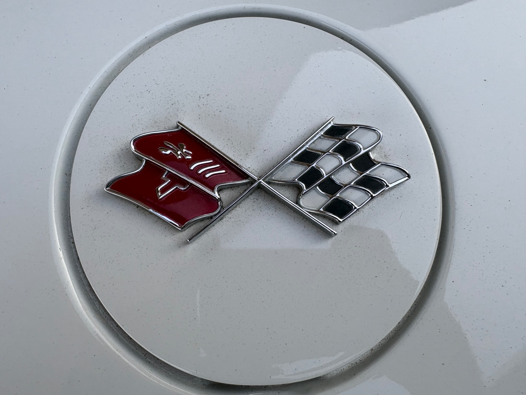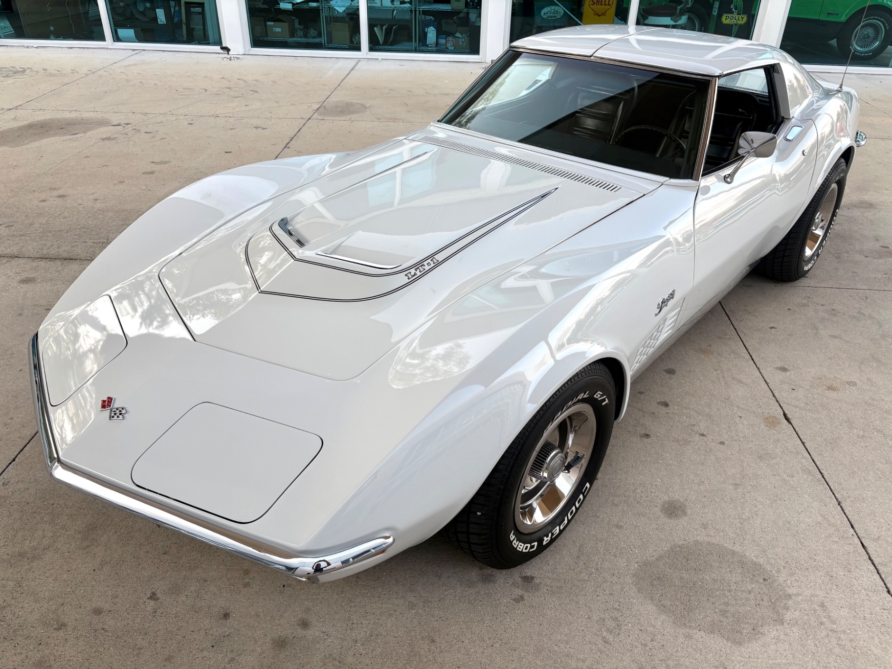 The LT-1 hood sits atop all of this with its raised center section and functional scoop profile, giving the white exterior a more aggressive stance than a standard hood would provide. Whether or not the engine underneath matches the hood's origins, the visual effect is period-correct and consistent with how Chevrolet's performance Corvettes of the era were presented.