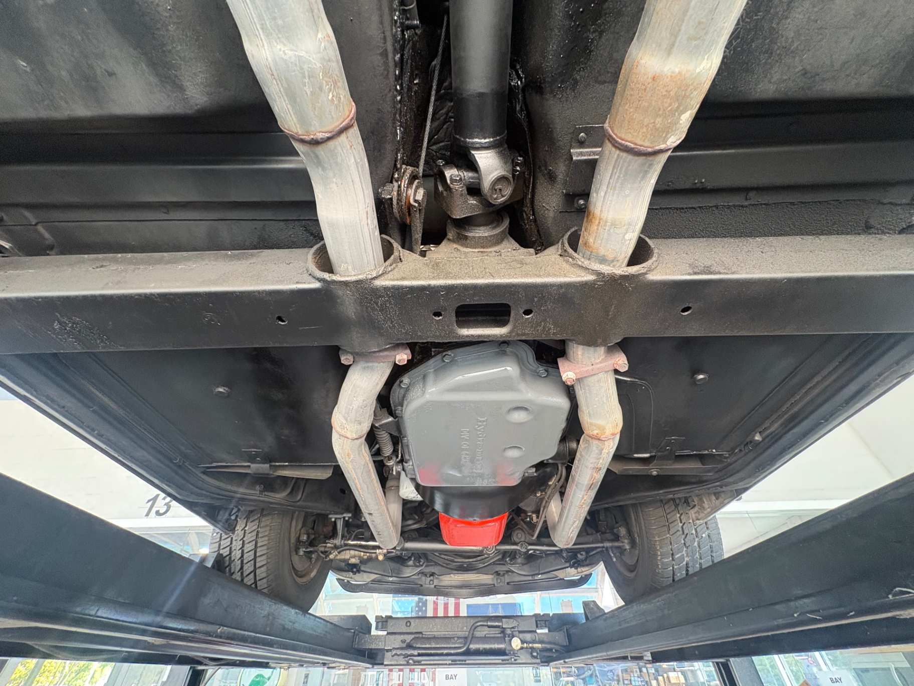 Under the hood sits the correct 350 cubic inch V8 for this VIN, backed by an automatic transmission. The engine bay presents well, with red-painted valve covers and a polished air cleaner assembly that are visually consistent with how these cars left the factory. Dual exhaust exits through the iconic squared-off rear tips that are characteristic of the C3 Corvette, and the system appears clean from the underside photos.
