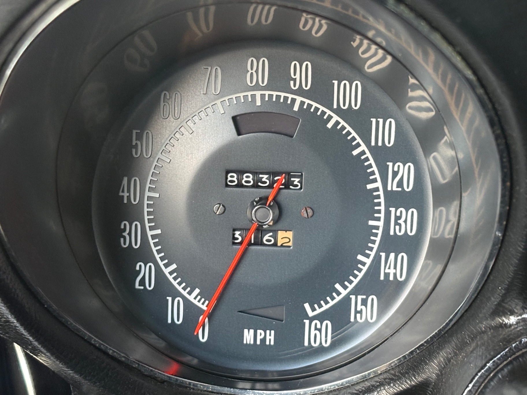 The center console houses the shifter for the automatic transmission and contributes to the tight, purposeful feel of the C3 interior. The Corvette Sport steering wheel — a three-spoke design with a smaller diameter than the standard wheel — gives the driver a more direct connection to the car and was a popular option on performance-oriented builds. The tachometer and 160-mph speedometer are both present in the instrument cluster, the latter being a Corvette-specific piece not shared with other GM models of the era. That speedometer is a detail that Corvette buyers notice, and its presence confirms this car was optioned with the performance gauge package.