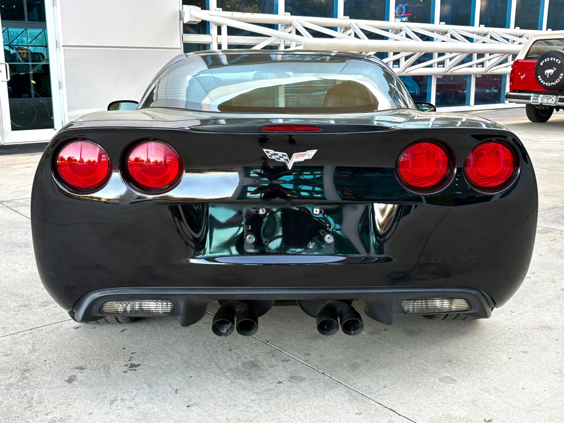 The chrome 5-spoke wheels are the correct factory-style C6 wheel that pairs well with the black exterior and give the car a finished, clean look without moving into aftermarket territory. The quad exhaust tips — four round outlets visible in the undercarriage and rear photos — are one of the C6's most recognizable visual signatures when viewed from behind. The rear panel, taillights, and Corvette badging are all intact and correct. There is no license plate frame cutout or front bracket installed, which is consistent with a garaged, carefully kept car.