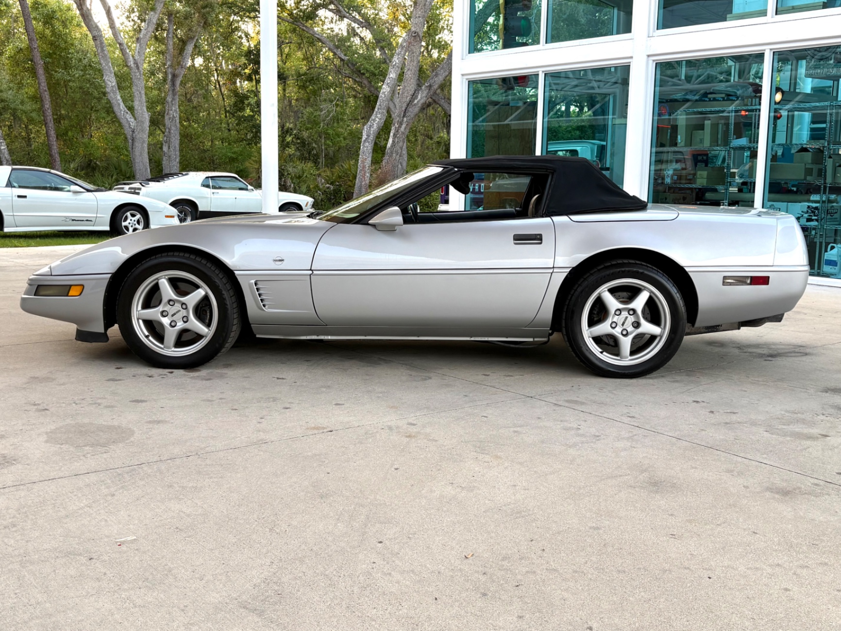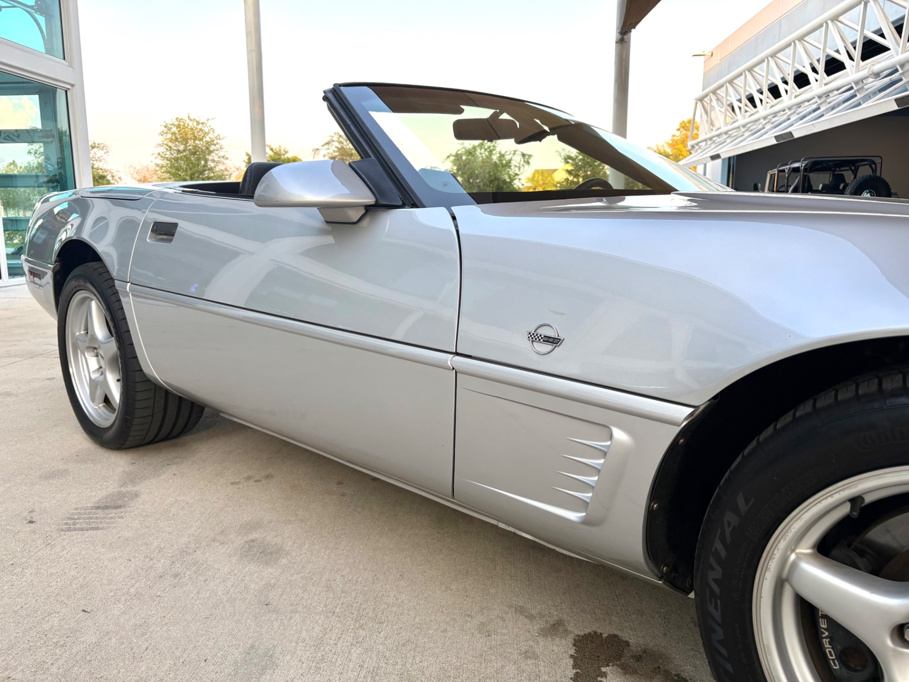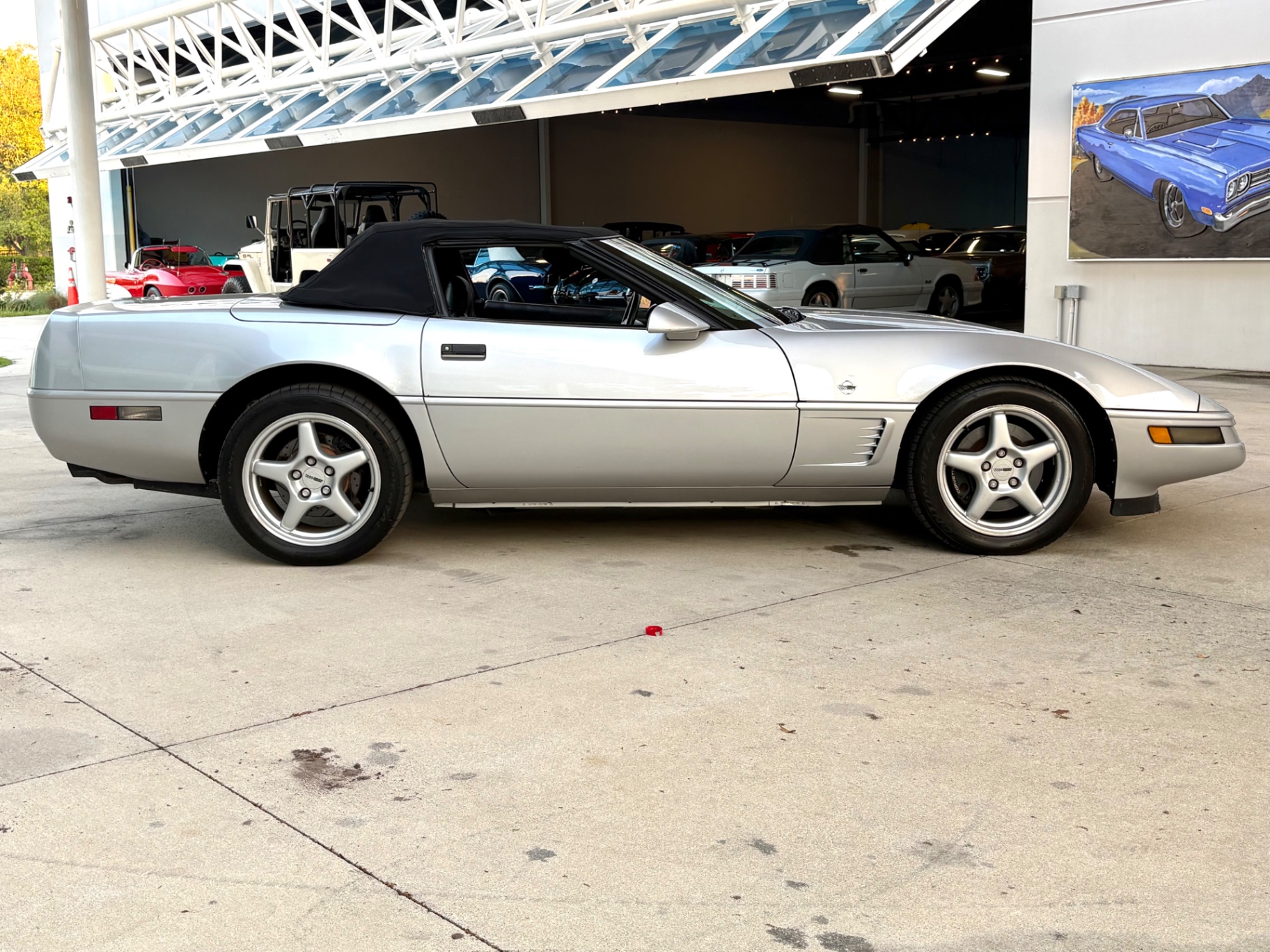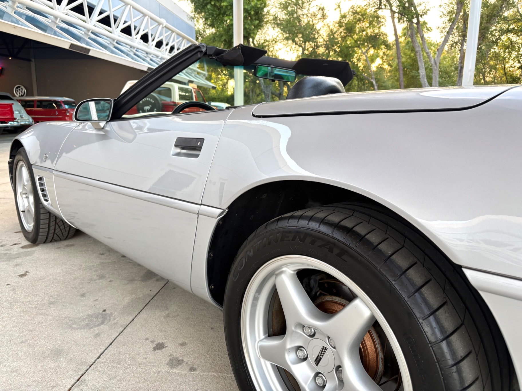 Silver was a popular color on the C4 Corvette and remains one of the cleaner choices on this body style. The fourth-generation Corvette's long hood, recessed headlights, and sculpted rear end were the work of a design process that began under Dave McLellan's engineering leadership and reflected the aerodynamic priorities of the era. The convertible body adds visual lightness compared to the coupe, and without the targa top or removable roof panel, the profile is cleaner from certain angles.