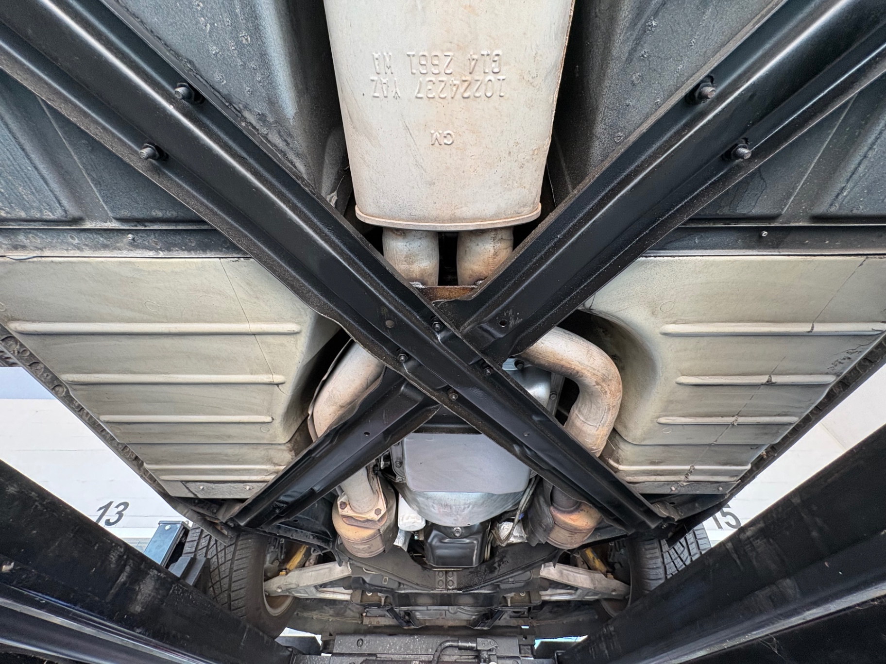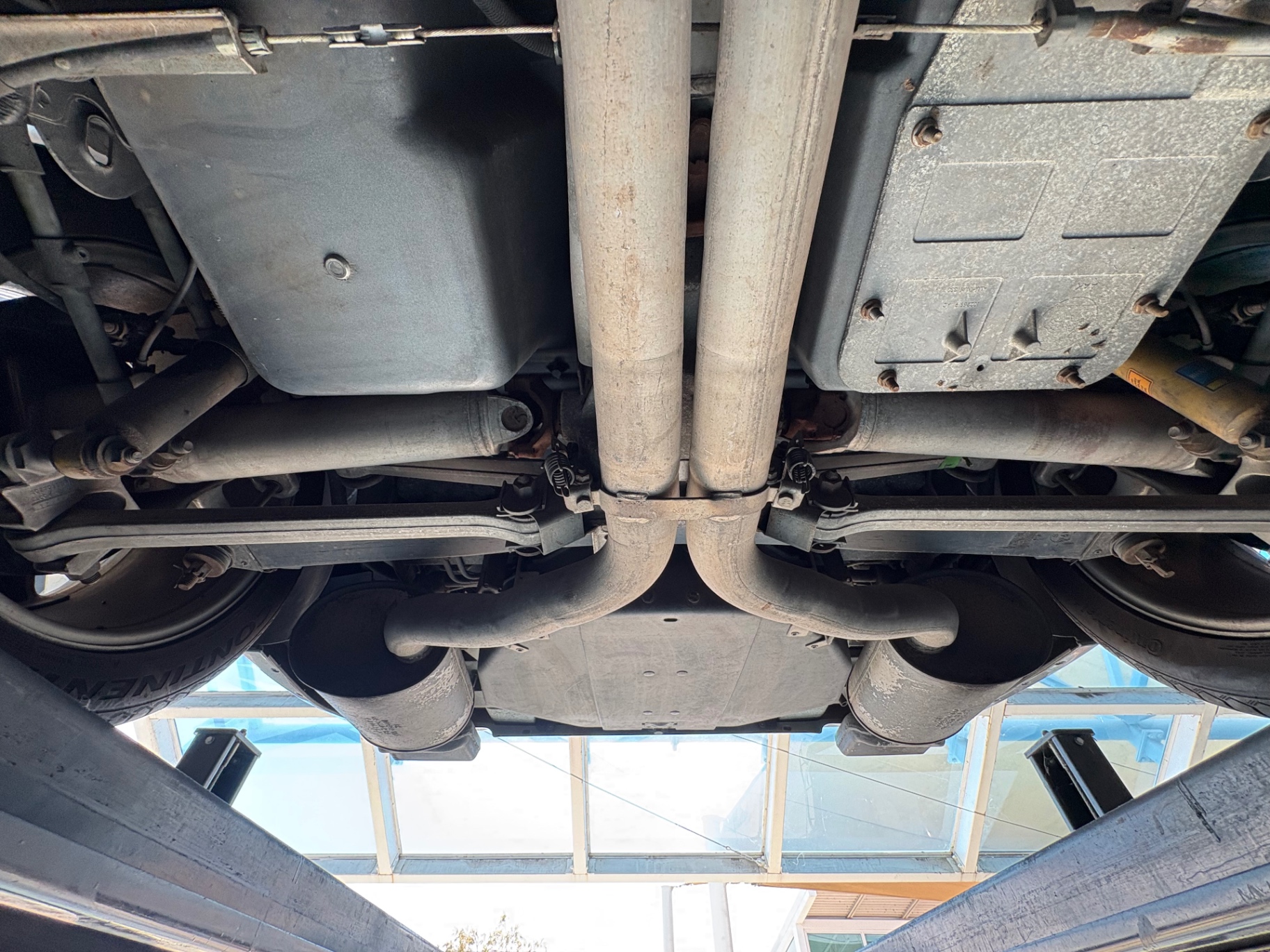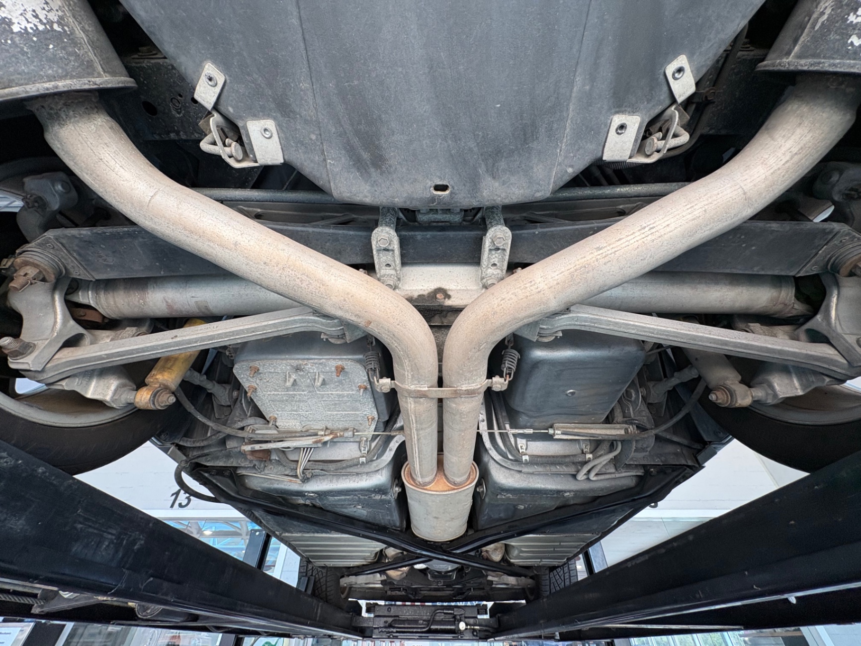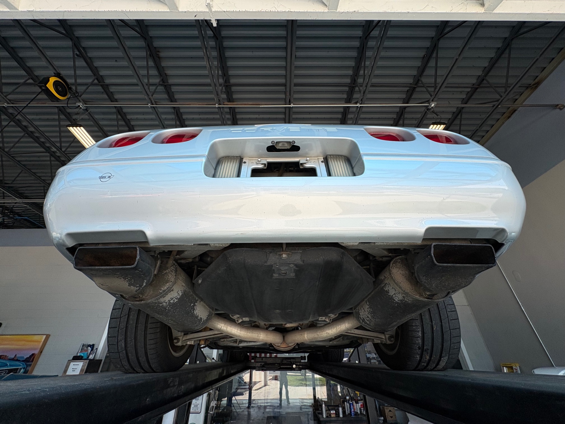 The dual exhaust exits through rectangular tips tucked under the rear fascia, a signature look of the C4 generation. The undercarriage photo included in this listing shows the car was put on a lift for inspection — the exhaust routing and underbody structure are visible and worth examining for any buyer who wants to verify condition before committing.