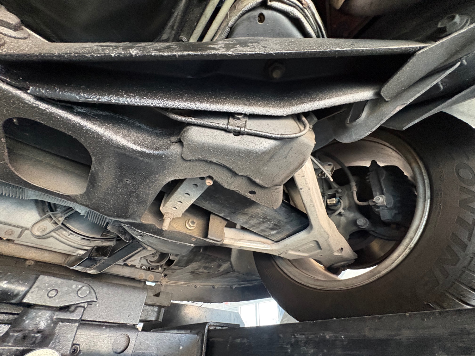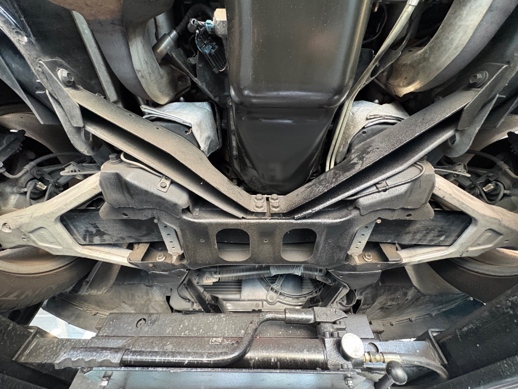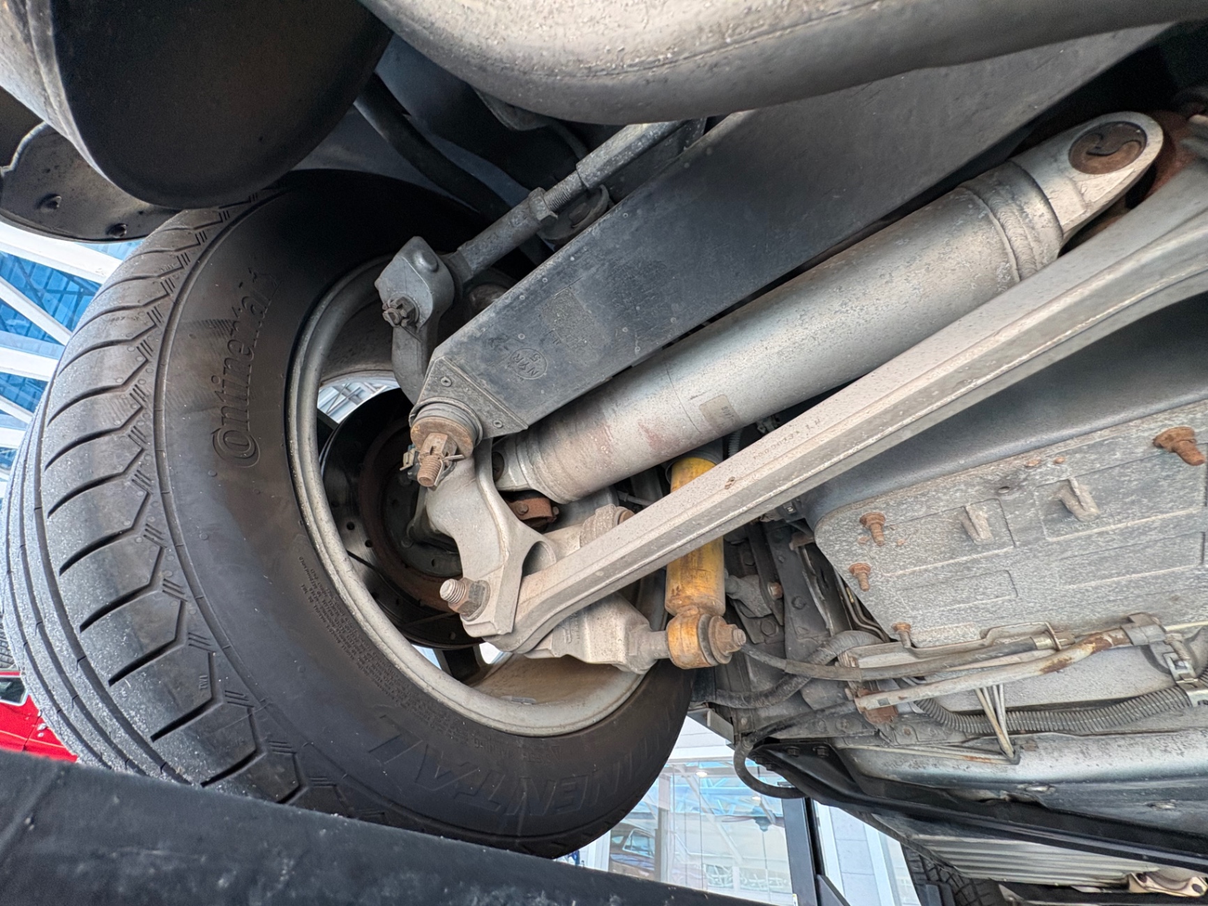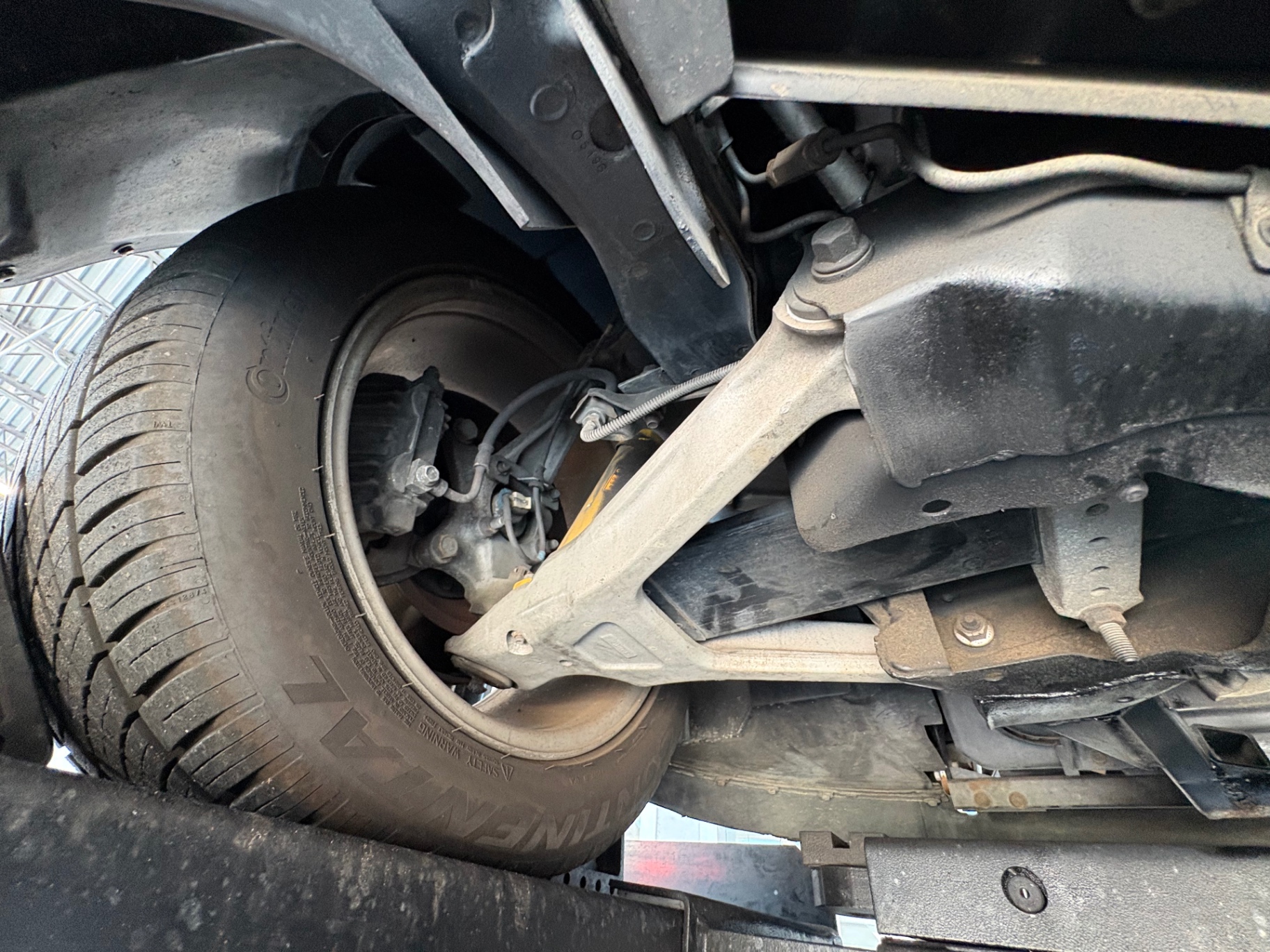 The dual exhaust exits through rectangular tips tucked under the rear fascia, a signature look of the C4 generation. The undercarriage photo included in this listing shows the car was put on a lift for inspection — the exhaust routing and underbody structure are visible and worth examining for any buyer who wants to verify condition before committing.