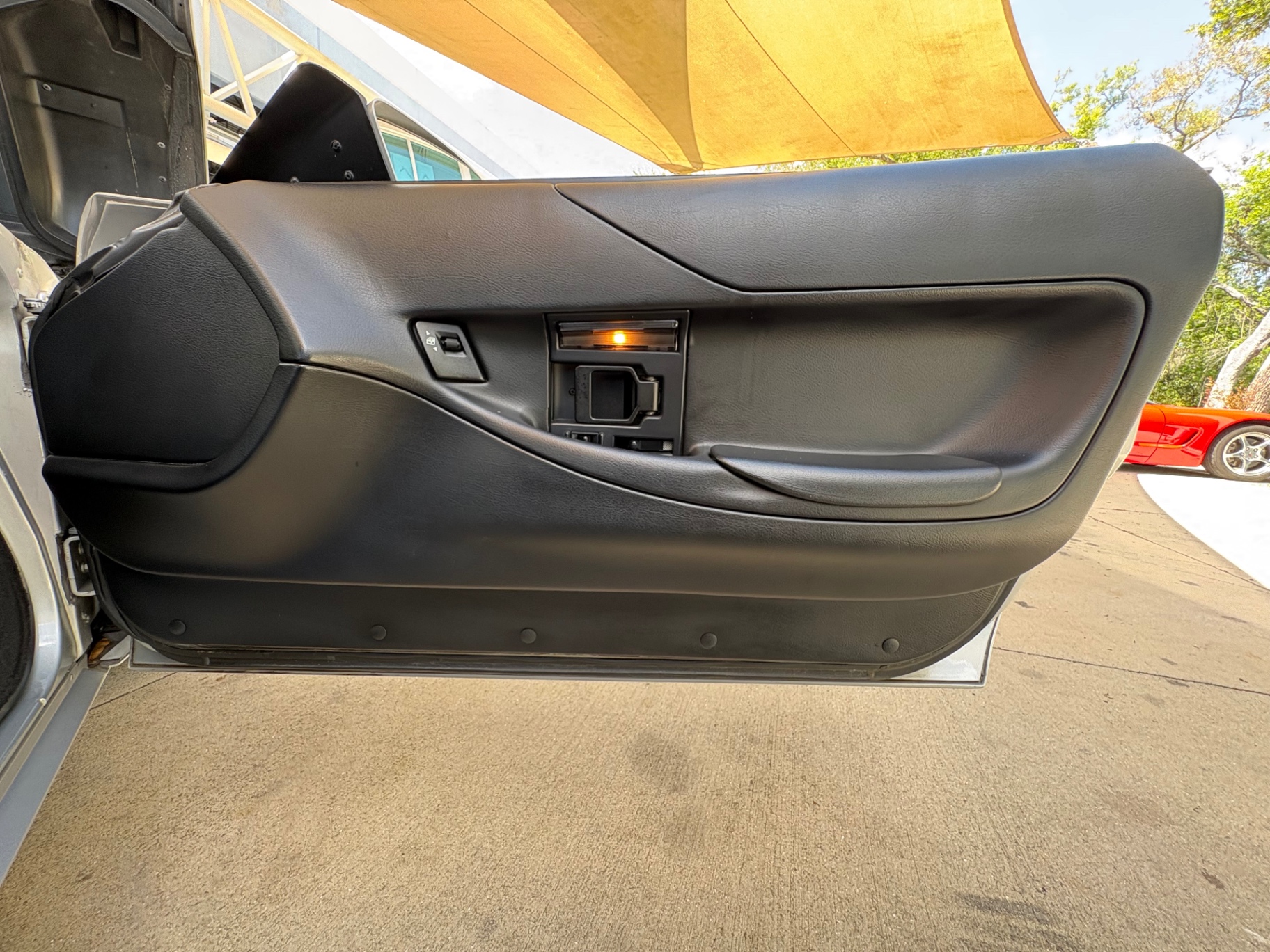 Air conditioning is present and functional, which matters in a car that will see Florida roads. Power windows operate from controls mounted in the door panel, which shows clean in the photos. The black interior holds up well visually against the silver exterior and the black soft top — the color combination is consistent throughout.