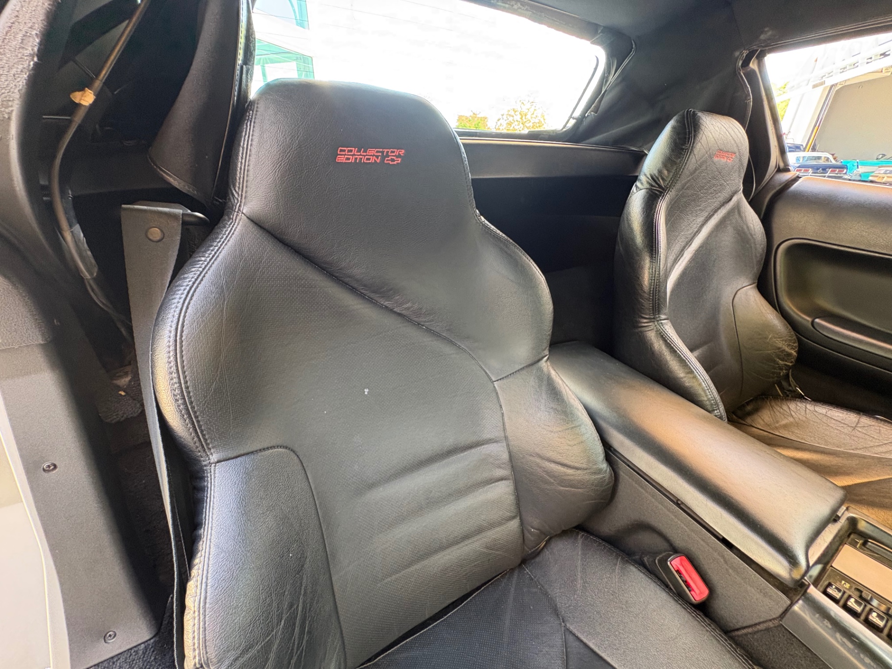 The 1996 Chevrolet Corvette's cockpit was driver-focused by design. The black leather bucket seats sit low in the fiberglass body, and the center console runs the length of the cabin between driver and passenger — a layout that reinforces the car's two-seat sports car identity rather than compromising it.