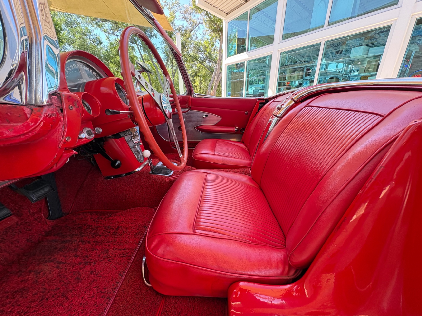 The interior of this 1961 Corvette is trimmed in red vinyl throughout, matching the exterior color in a combination that was very much in the spirit of the era. Chevrolet offered color-matched interior options on the 1961 Corvette, and red on red was one of the more assertive choices a buyer could make. The vinyl has held up well and presents cleanly in the photos.