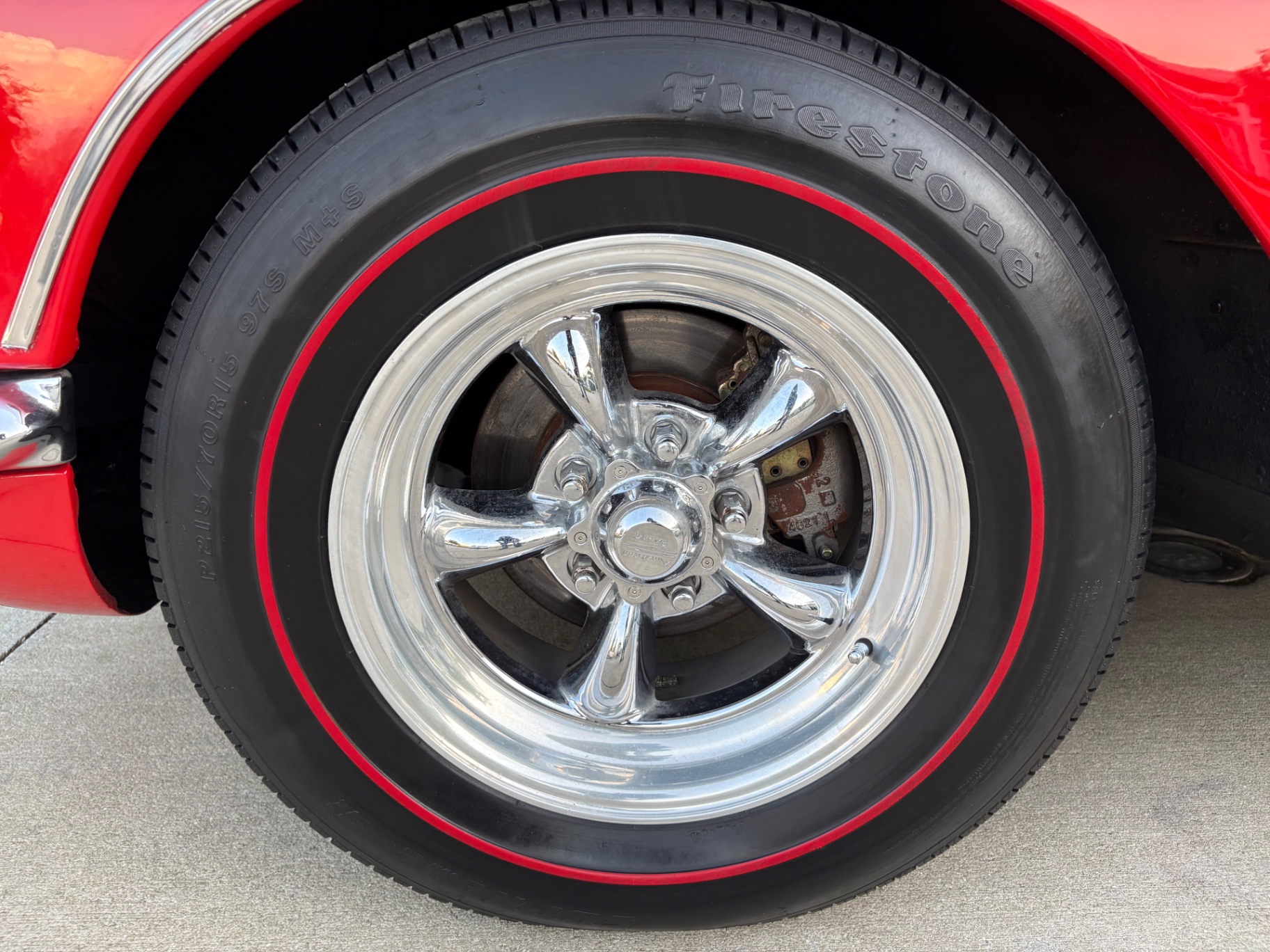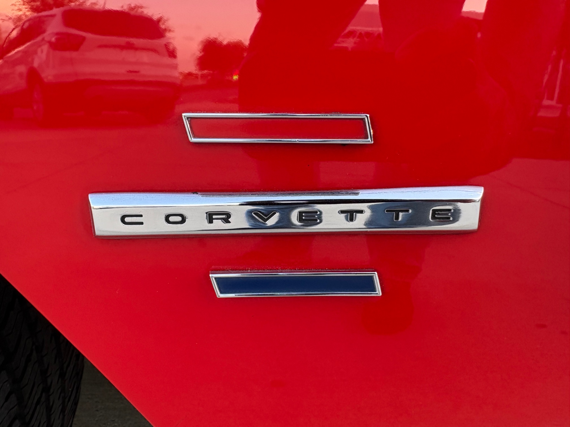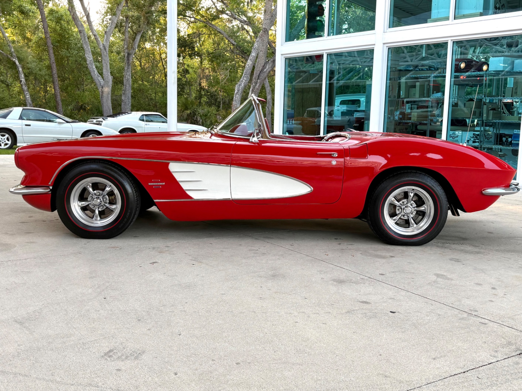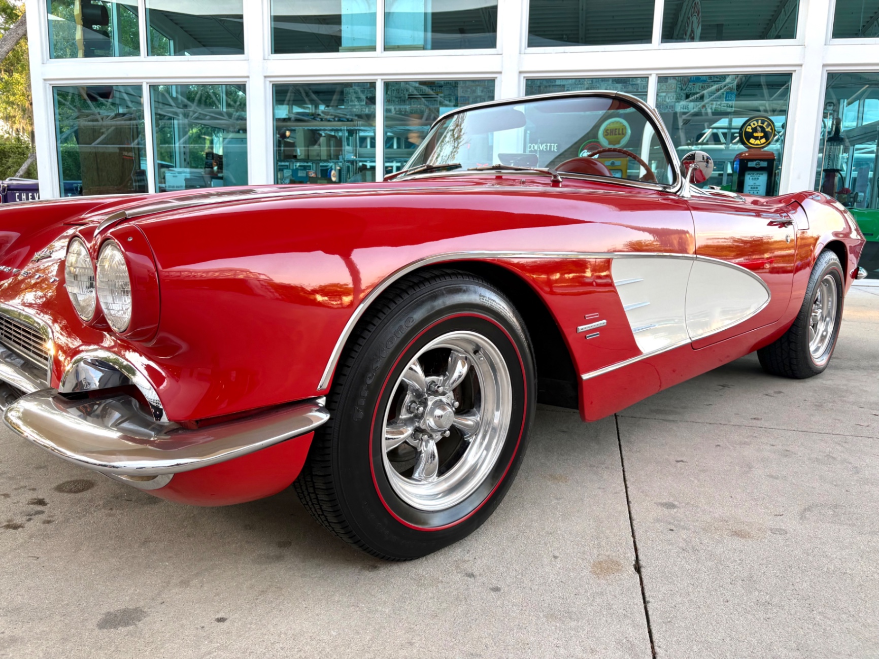 - 283ci V8 with dual four-barrel carburetors - 4-speed manual transmission - Dual K&N air filters on the dual quad carb setup - Corvette script valve covers - Aluminum radiator upgrade - Electric cooling fan - Custom alloy wheels - Red-line tires - Red exterior finish - White cove body trim - Chrome bumpers - Red vinyl interior - Bucket seats - Center console shifter