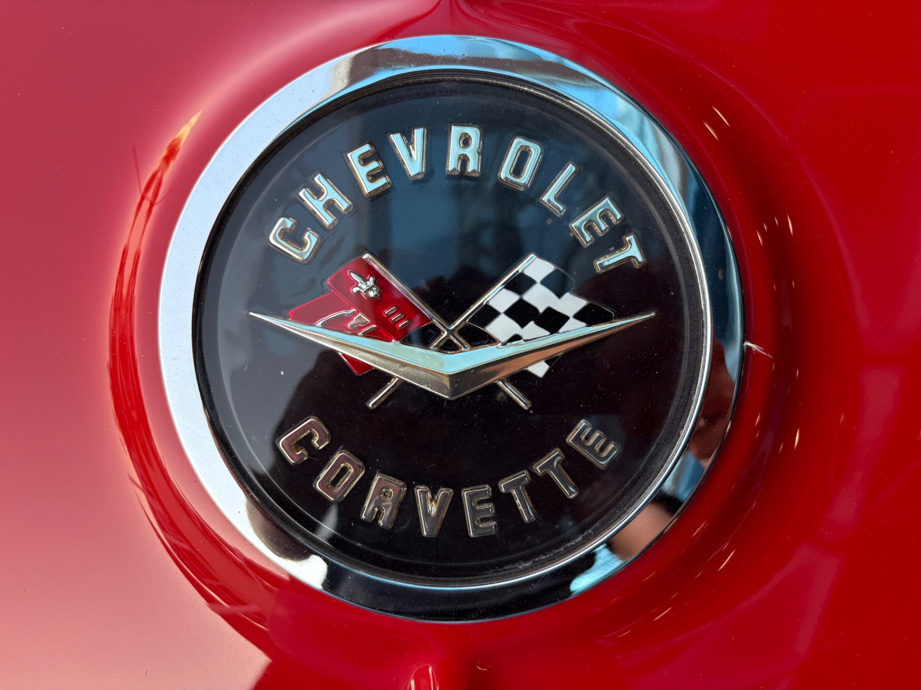 White cove body trim fills the side coves — the sculpted recesses that run along the mid-body of the C1 from 1956 onward. Chevrolet offered the option to paint these coves a contrasting color from the beginning, and the red-and-white combination on this car is one of the most traditional and visually correct pairings for the model. It breaks up the body mass in exactly the way the designers intended.