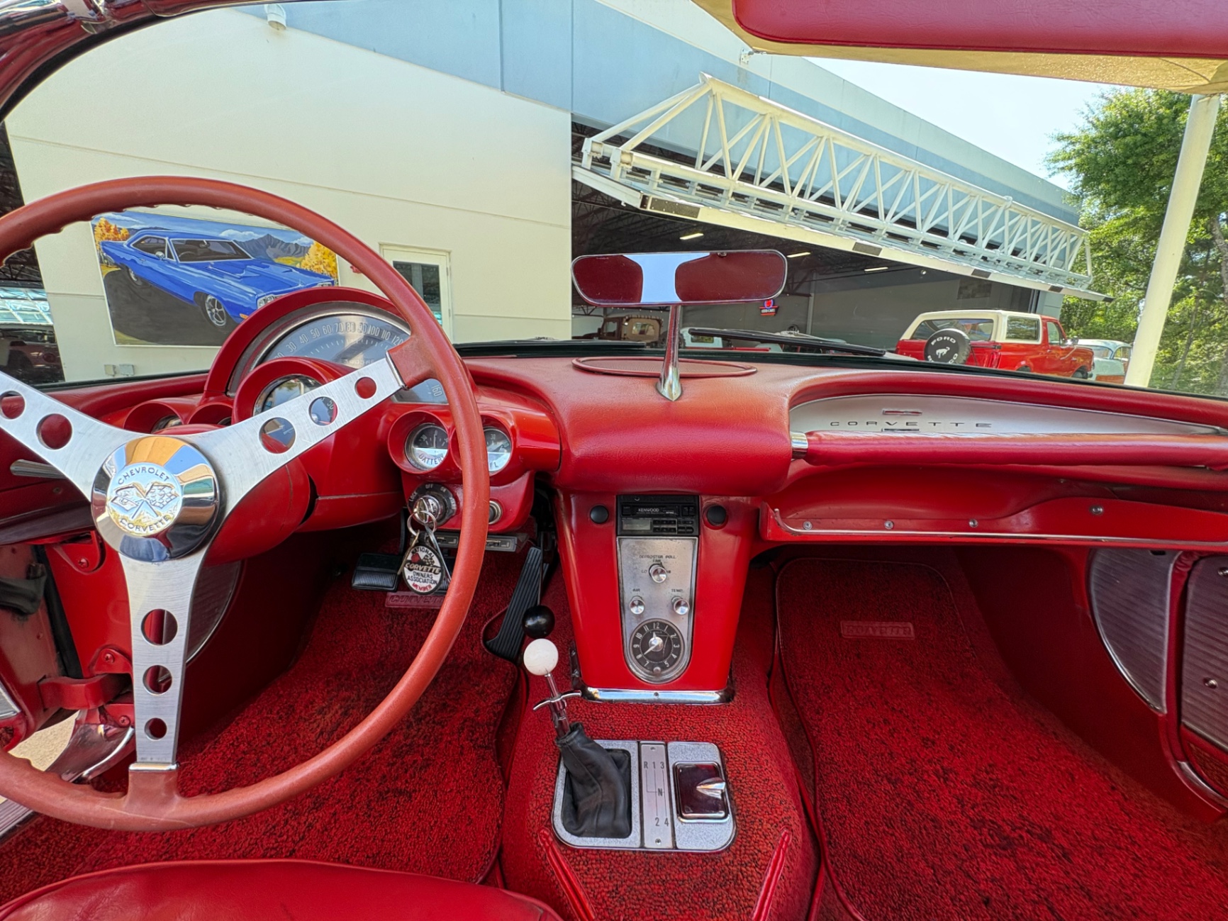 The center console houses the 4-speed shifter in the correct location, giving the driver easy, natural access to the gearbox. The overall cockpit is tight by modern standards, which is part of what makes a C1 Corvette feel like a sports car rather than a cruiser.