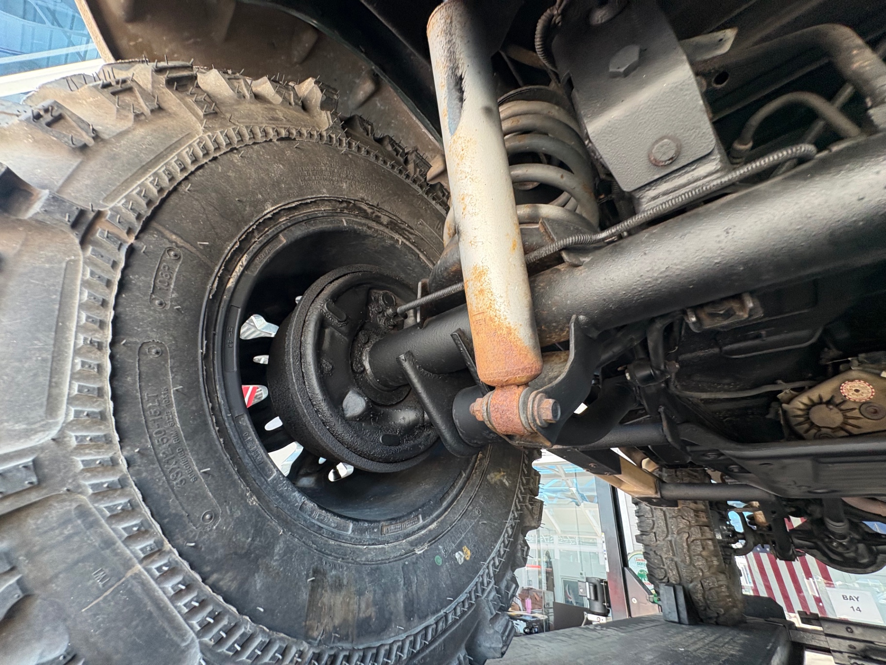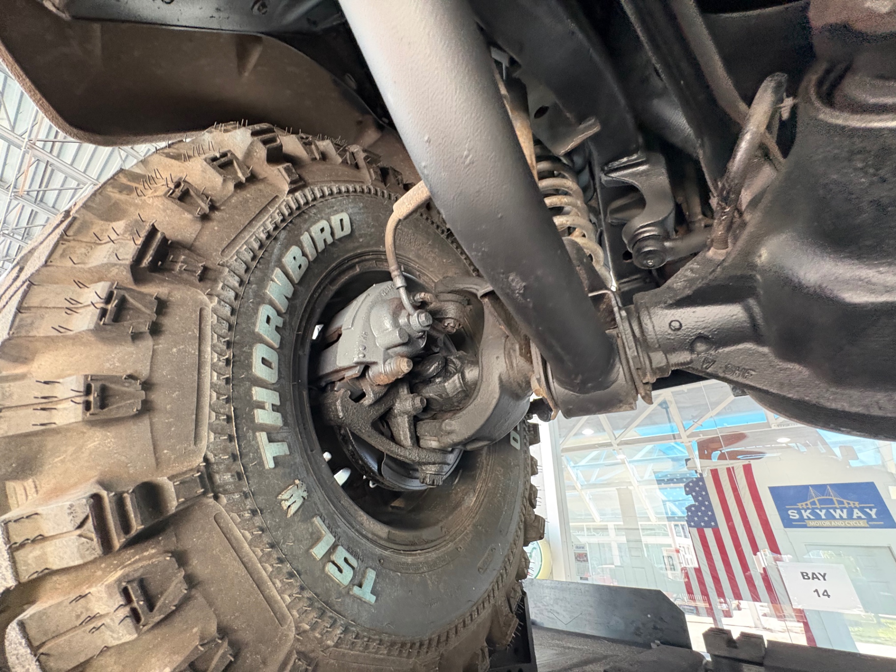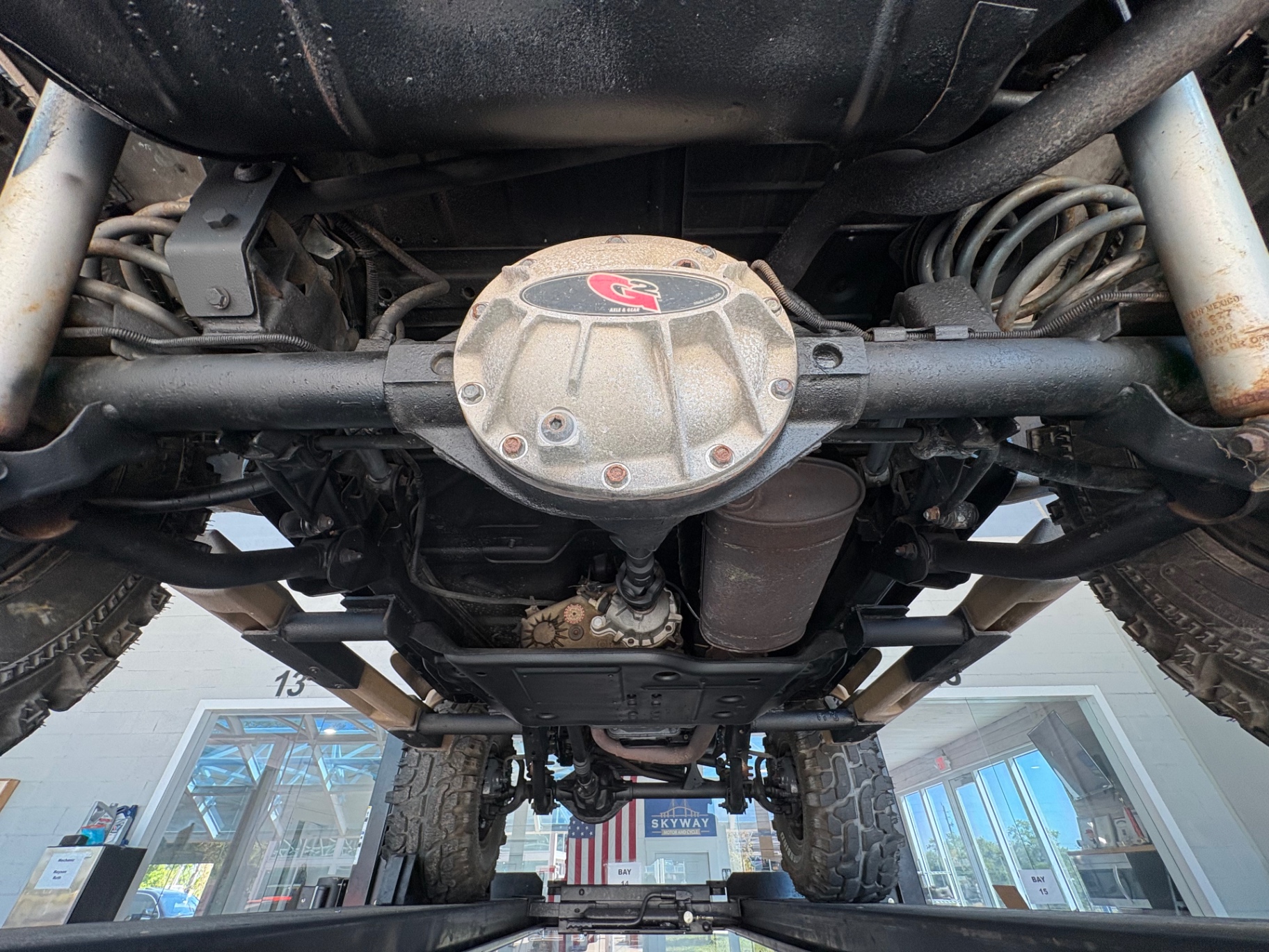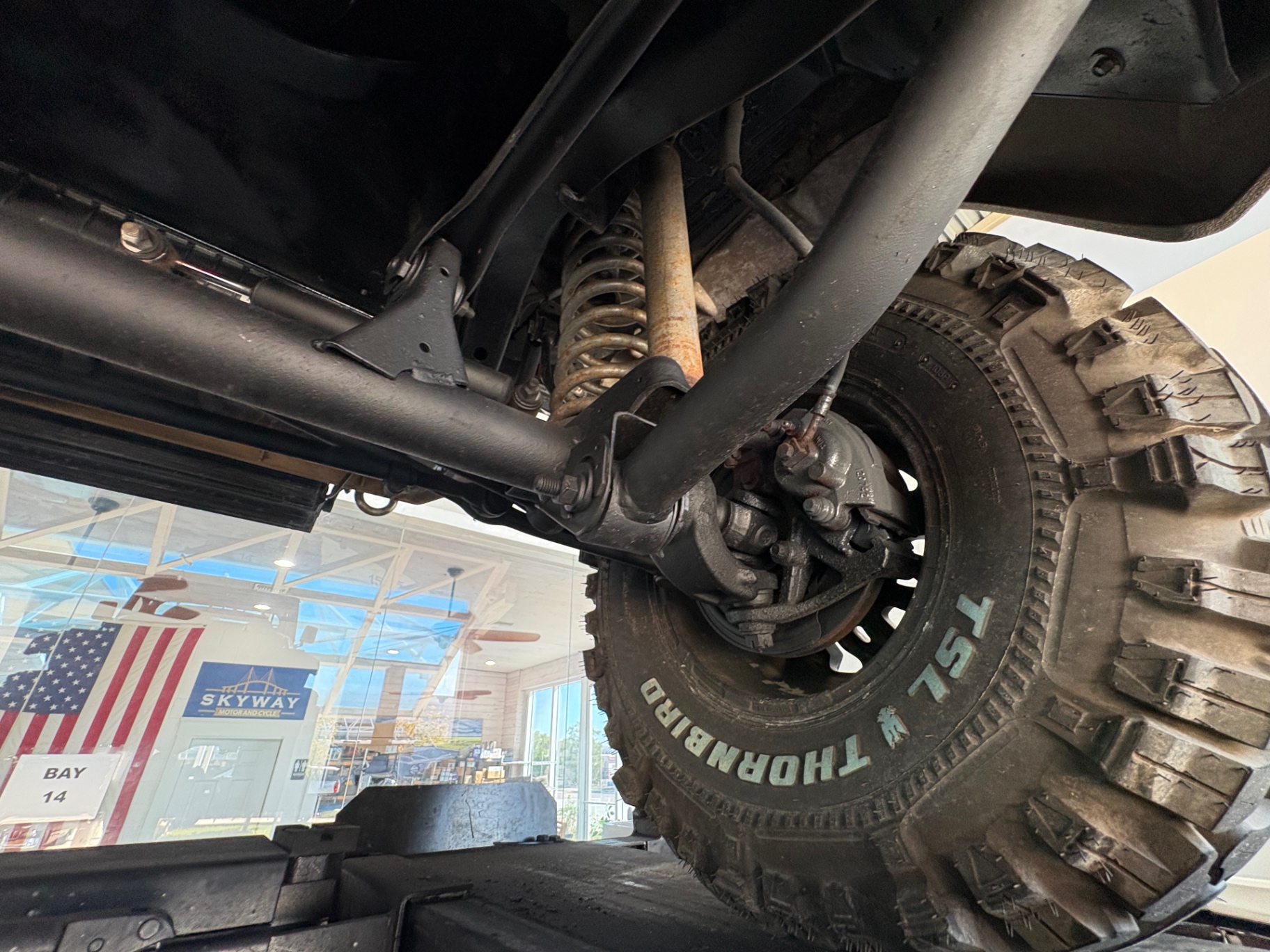 The mechanical highlights here are the Detroit Lockers installed in both the front and rear differentials. Detroit Locker is one of the oldest and most respected names in locking differential technology. Unlike a limited-slip, a Detroit Locker does not rely on friction or electronics — it mechanically locks the axle shafts together when torque is applied, ensuring both wheels on that axle receive power regardless of surface conditions. Running them front and rear means this Wrangler has full mechanical four-wheel drive grip in the truest sense. On mud, rock, sand, or any surface where one wheel might otherwise spin freely, both wheels dig. That combination is what separates a built Jeep from a stock one, and it's expensive to do properly. Power steering keeps the oversized tires manageable on and off road.