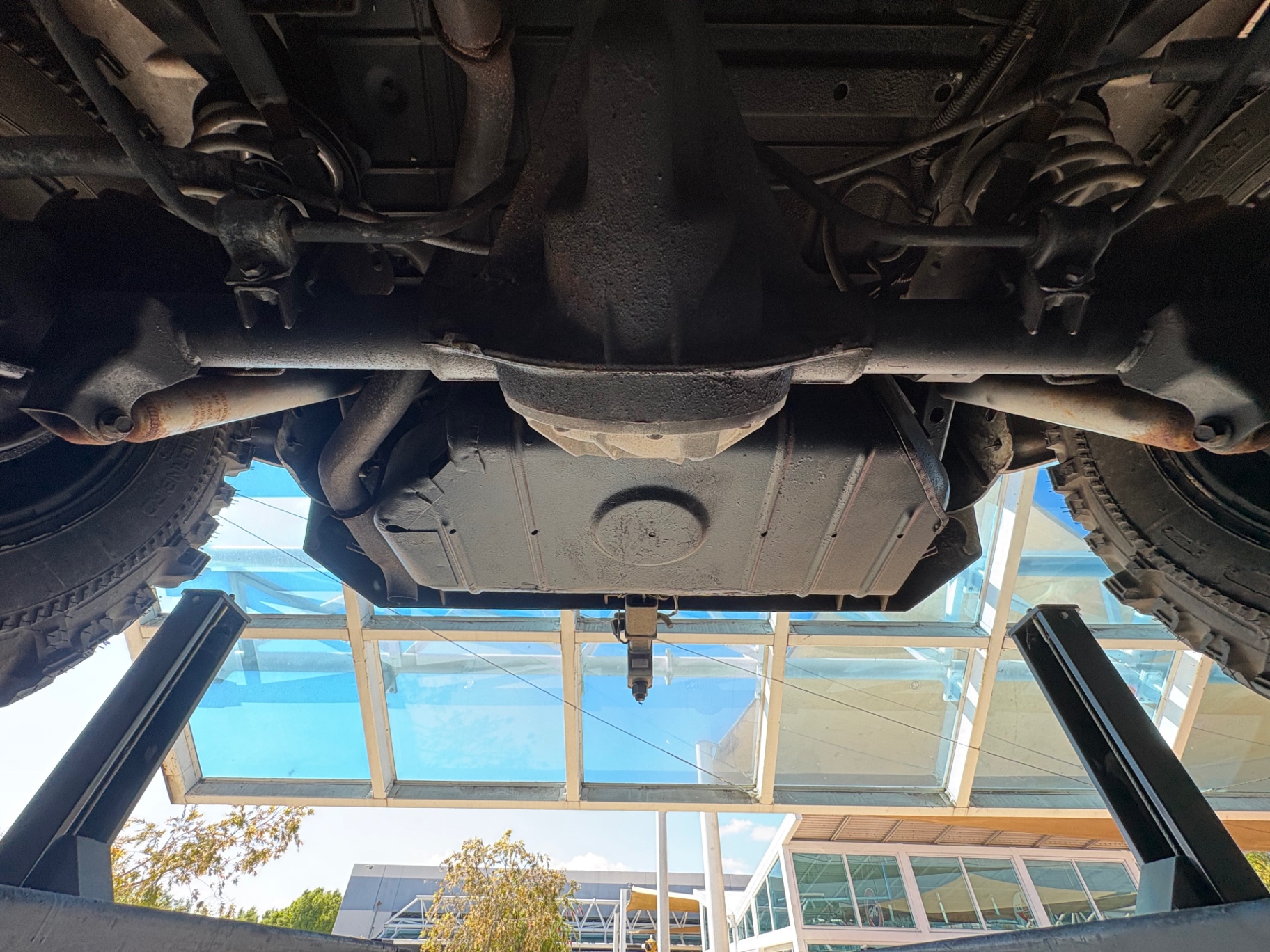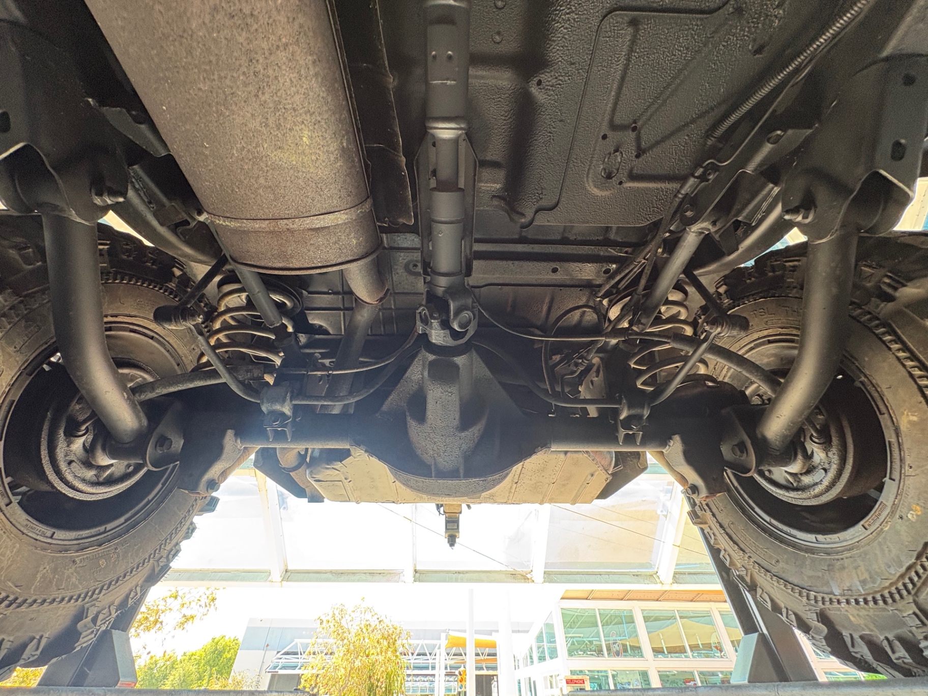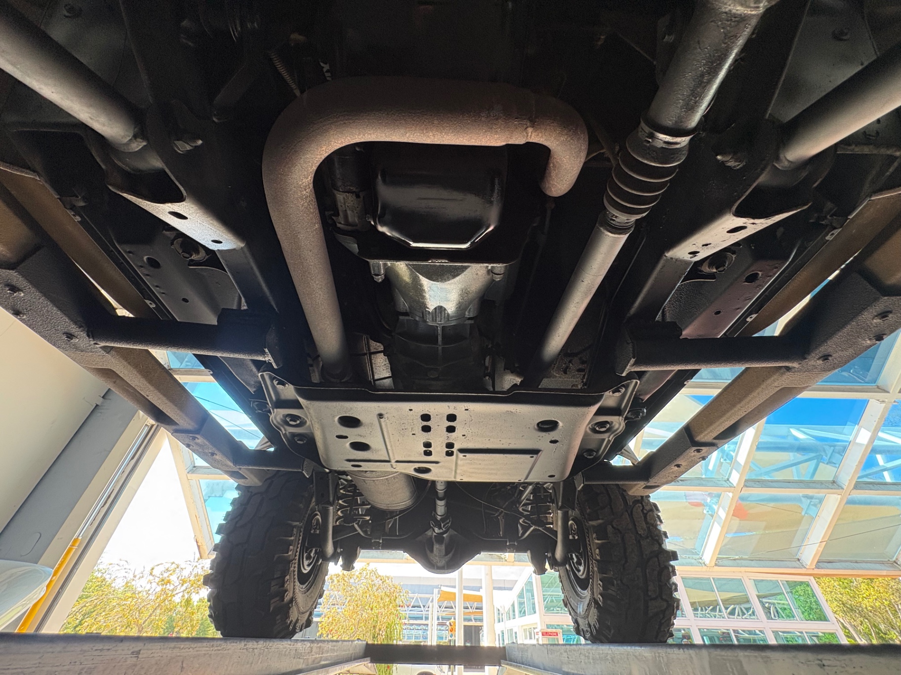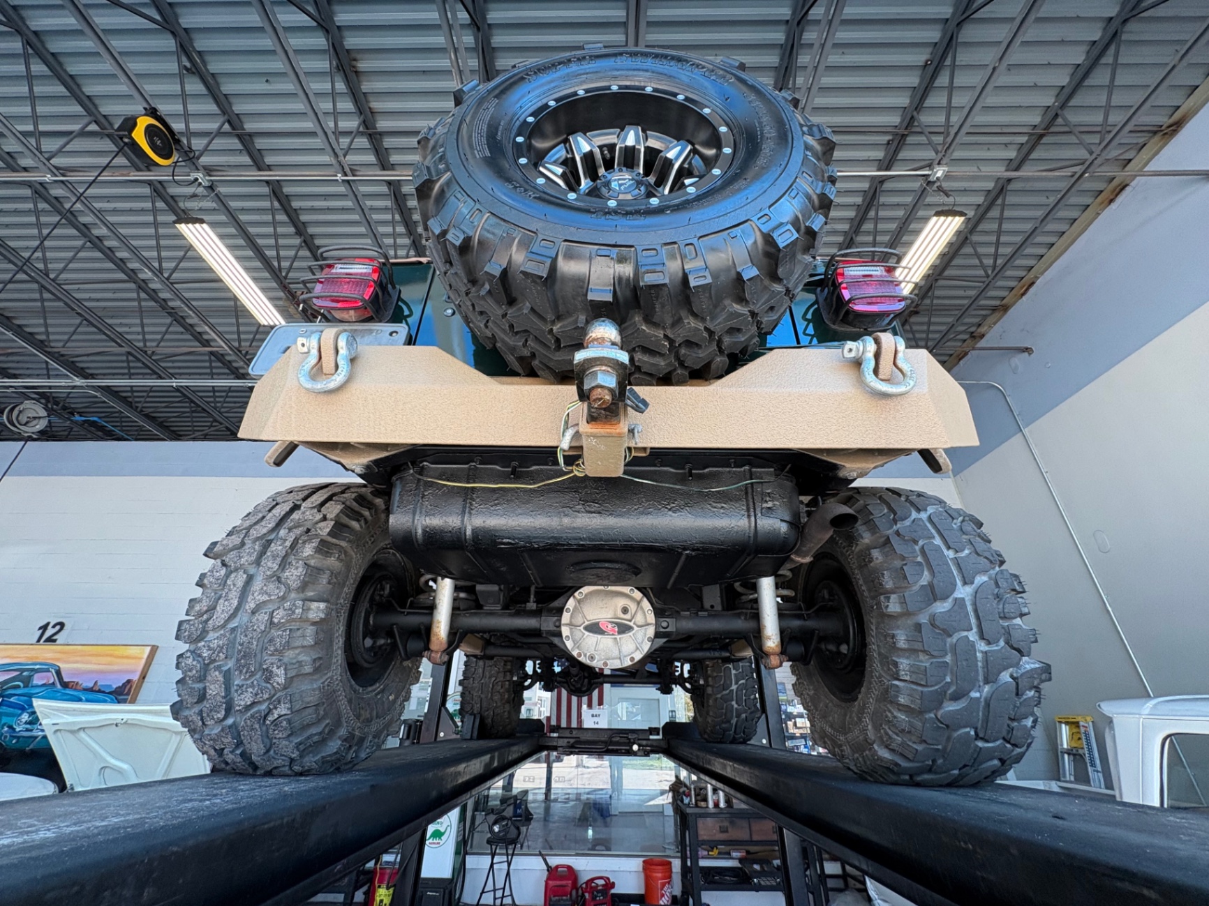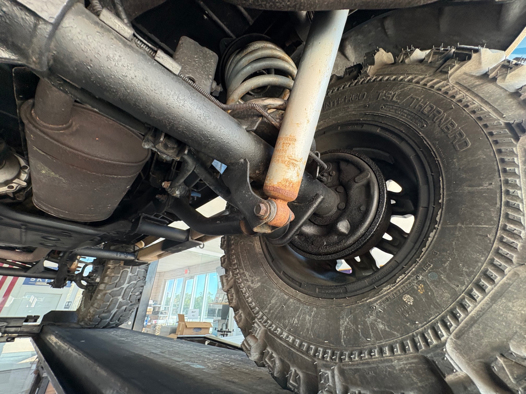 The mechanical highlights here are the Detroit Lockers installed in both the front and rear differentials. Detroit Locker is one of the oldest and most respected names in locking differential technology. Unlike a limited-slip, a Detroit Locker does not rely on friction or electronics — it mechanically locks the axle shafts together when torque is applied, ensuring both wheels on that axle receive power regardless of surface conditions. Running them front and rear means this Wrangler has full mechanical four-wheel drive grip in the truest sense. On mud, rock, sand, or any surface where one wheel might otherwise spin freely, both wheels dig. That combination is what separates a built Jeep from a stock one, and it's expensive to do properly. Power steering keeps the oversized tires manageable on and off road.