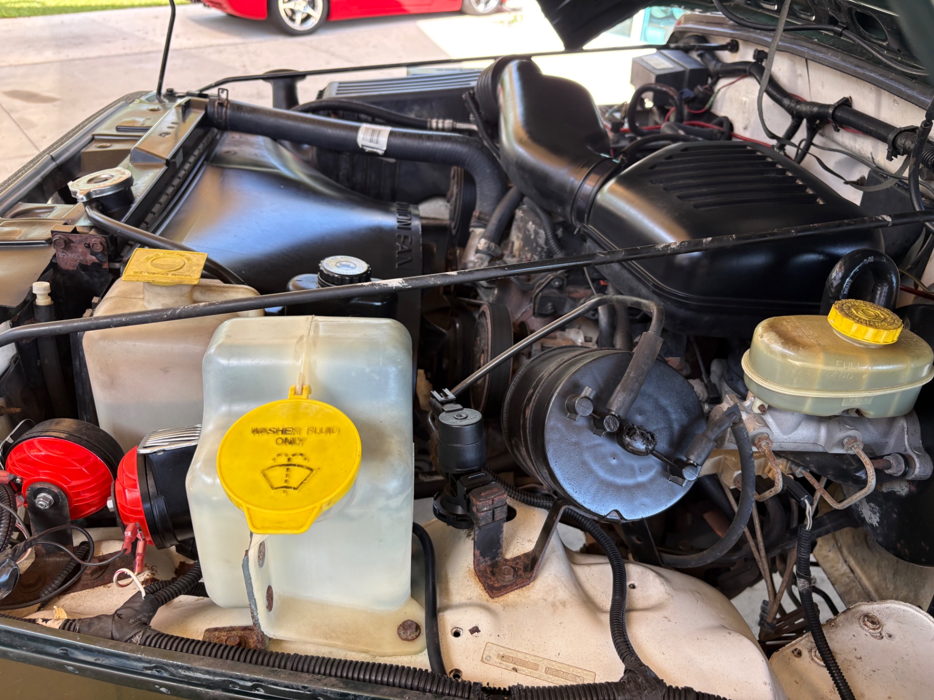 The front winch is mounted on the custom steel bumper and provides a critical recovery tool for remote trail use. A winch is only as useful as the anchor points around it, and the rear D-ring shackles provide exactly that — solid recovery points that can be used with a tree saver strap, another vehicle, or a ground anchor. Factory air conditioning is present and reported to be functioning well, which is worth noting on any 27-year-old Jeep that has seen trail use.