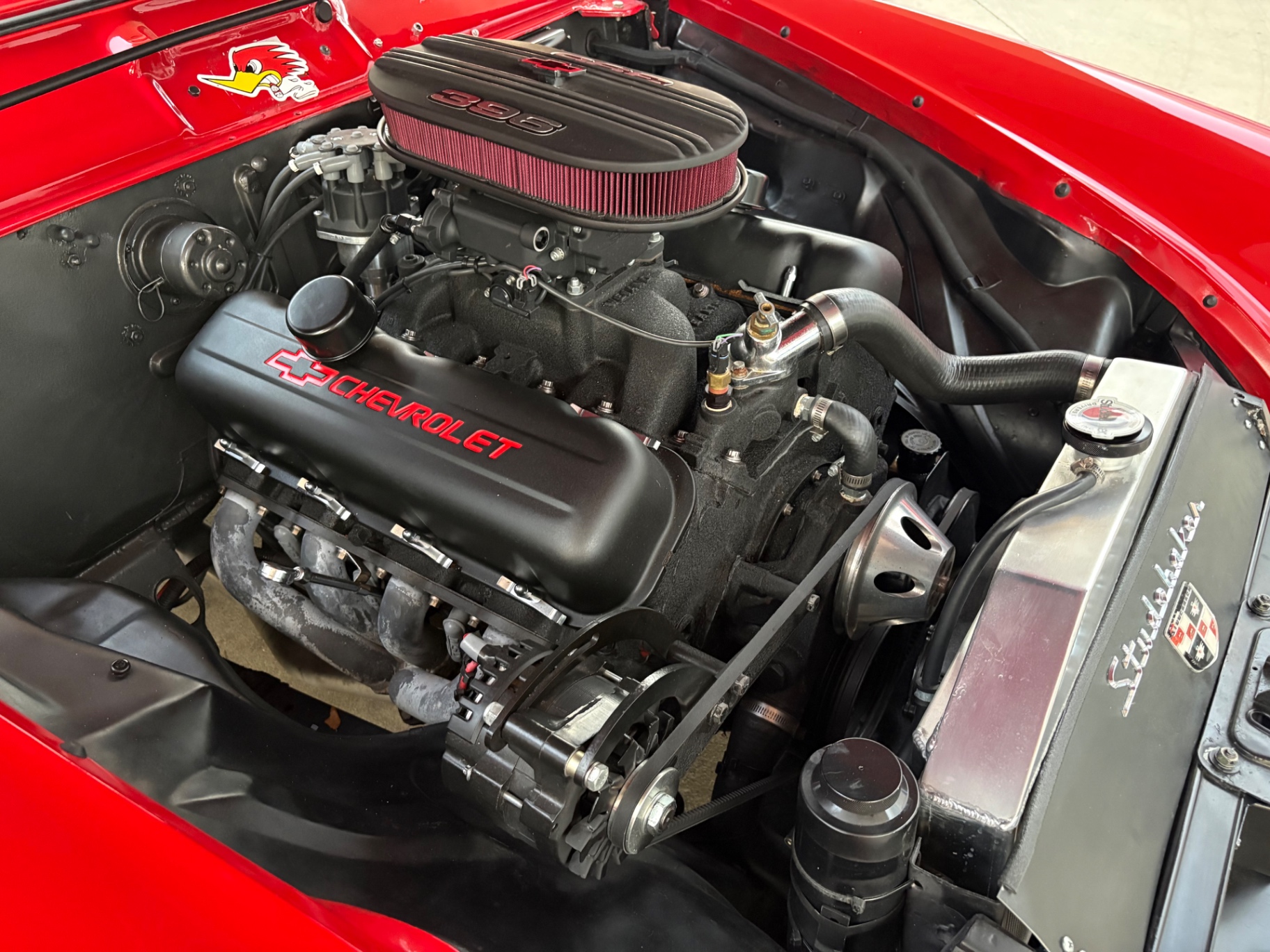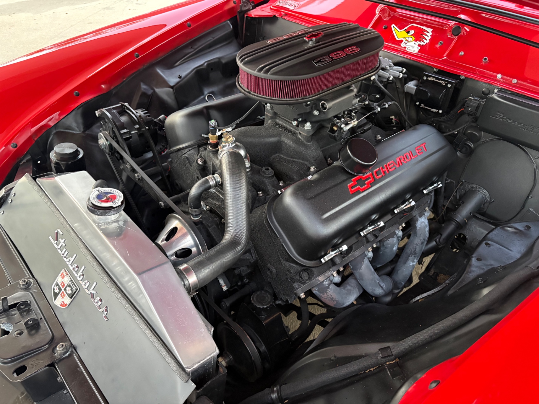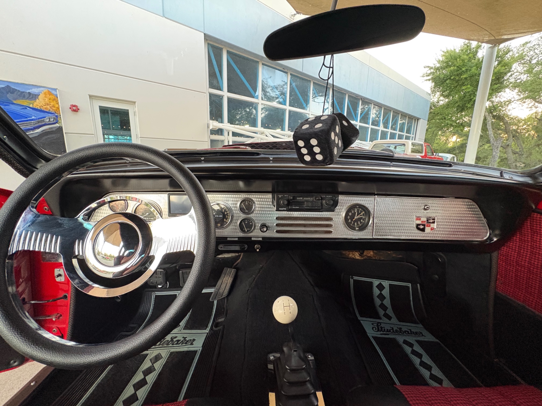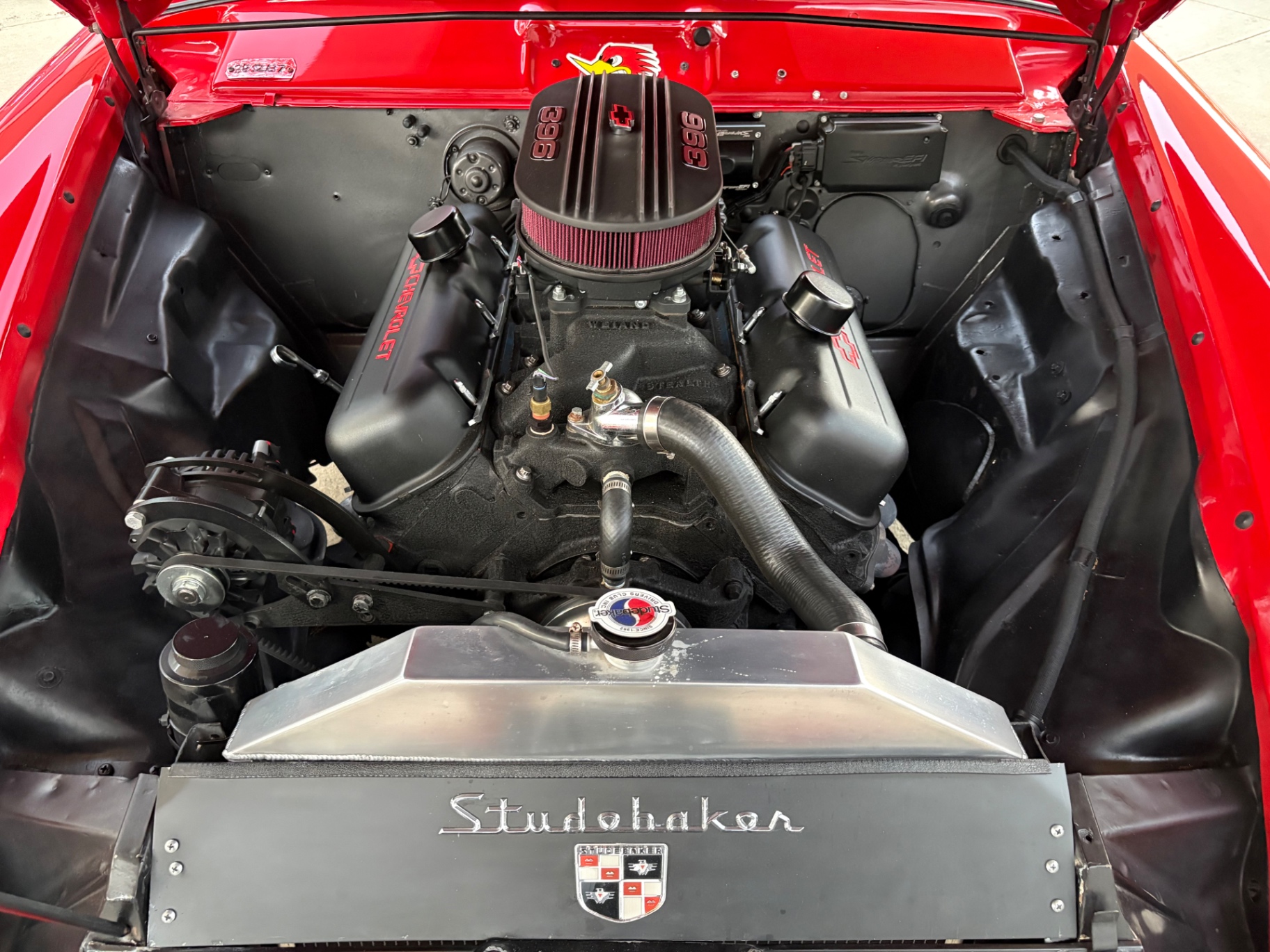 Engine: Chevrolet 396 Big Block V8 Induction: Holley Sniper Fuel Injection EFI system Intake: Cold air intake Transmission: 4-speed manual Rear end: Ford 9-inch Rear suspension: Coilover suspension Steering: Rack and pinion with power assist Steering wheel: Billet unit with tilt column Wheels: Polished Torque Thrust style wheels Tires: BF Goodrich Radial T/A Cooling: Aluminum radiator Exhaust: Dual exhaust Headlights: LED headlights Interior: Black vinyl with red and black houndstooth door panel inserts Gauges: Full custom gauge cluster with tachometer reading to 8,000 RPM and 160 MPH speedometer, all gauges functional, clock Windows: Power windows Exterior: Custom red paint with minor custom pin striping Bumpers: Chrome front and rear bumpers Rear trim: Chrome rear trim panel Mirrors: Dual exterior rear view mirrors Hood: Hood scoop Original items retained: Studebaker seat belts, Studebaker floor mats, Studebaker owner's manual