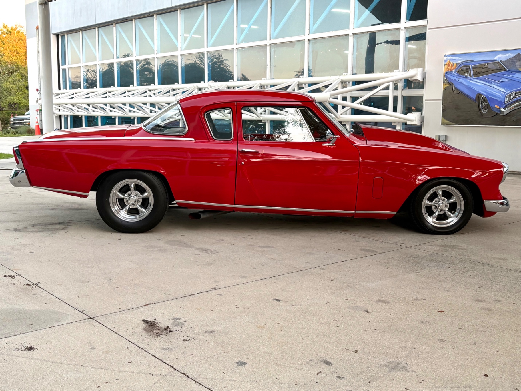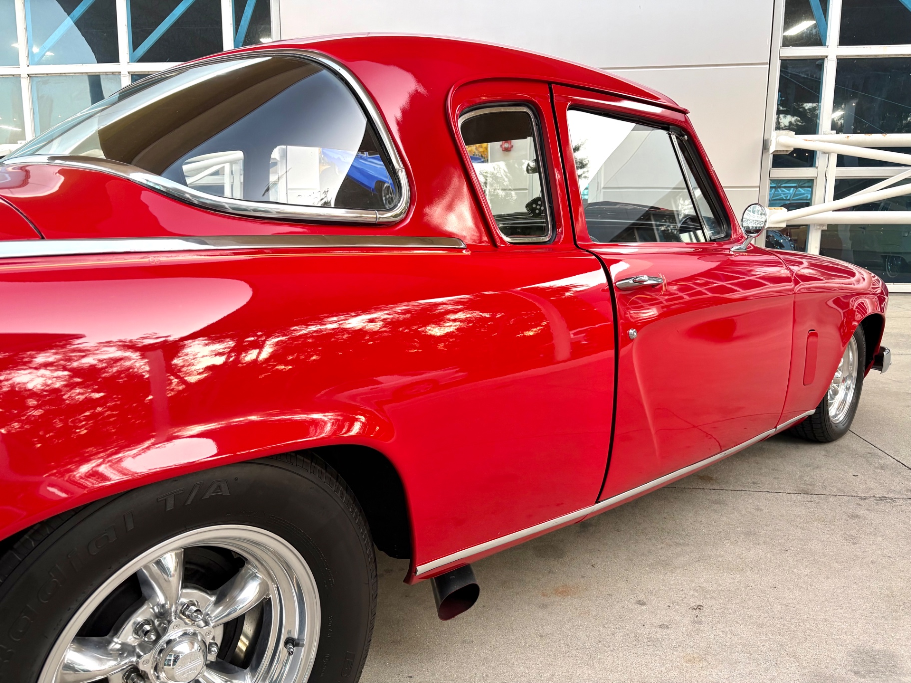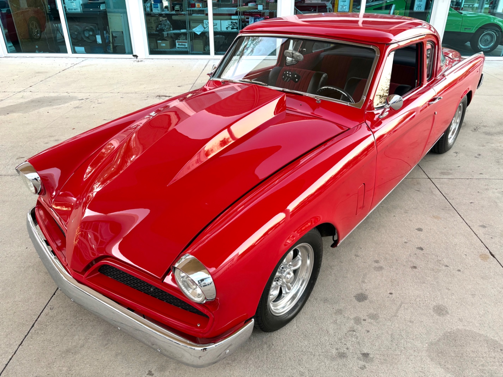Engine: Chevrolet 396 Big Block V8 Induction: Holley Sniper Fuel Injection EFI system Intake: Cold air intake Transmission: 4-speed manual Rear end: Ford 9-inch Rear suspension: Coilover suspension Steering: Rack and pinion with power assist Steering wheel: Billet unit with tilt column Wheels: Polished Torque Thrust style wheels Tires: BF Goodrich Radial T/A Cooling: Aluminum radiator Exhaust: Dual exhaust Headlights: LED headlights Interior: Black vinyl with red and black houndstooth door panel inserts Gauges: Full custom gauge cluster with tachometer reading to 8,000 RPM and 160 MPH speedometer, all gauges functional, clock Windows: Power windows Exterior: Custom red paint with minor custom pin striping Bumpers: Chrome front and rear bumpers Rear trim: Chrome rear trim panel Mirrors: Dual exterior rear view mirrors Hood: Hood scoop Original items retained: Studebaker seat belts, Studebaker floor mats, Studebaker owner's manual