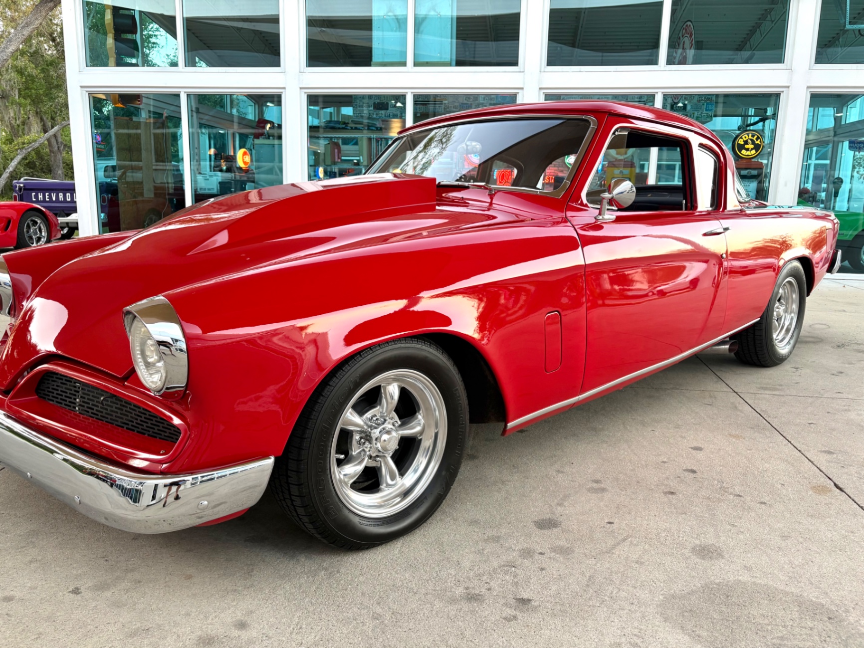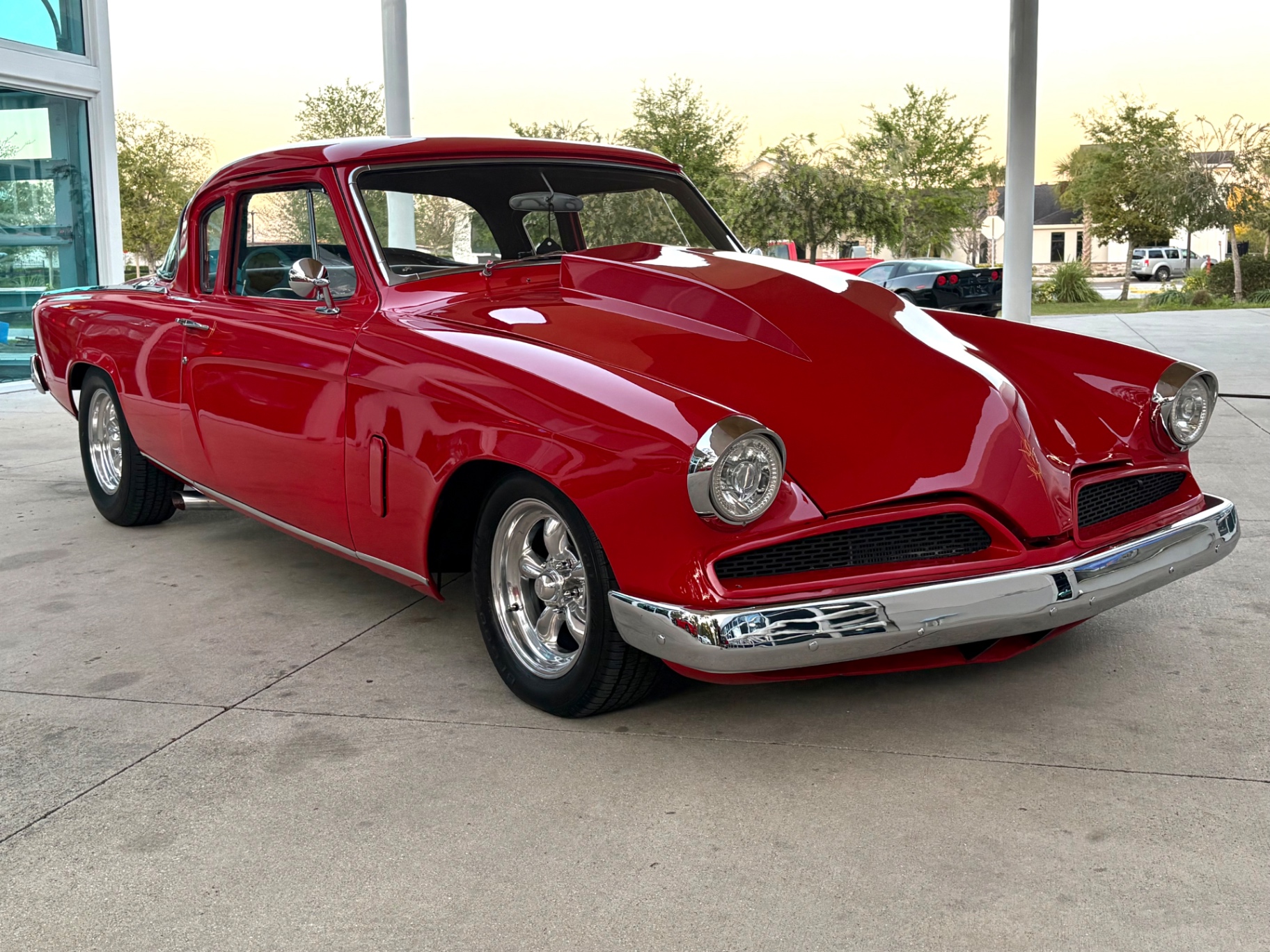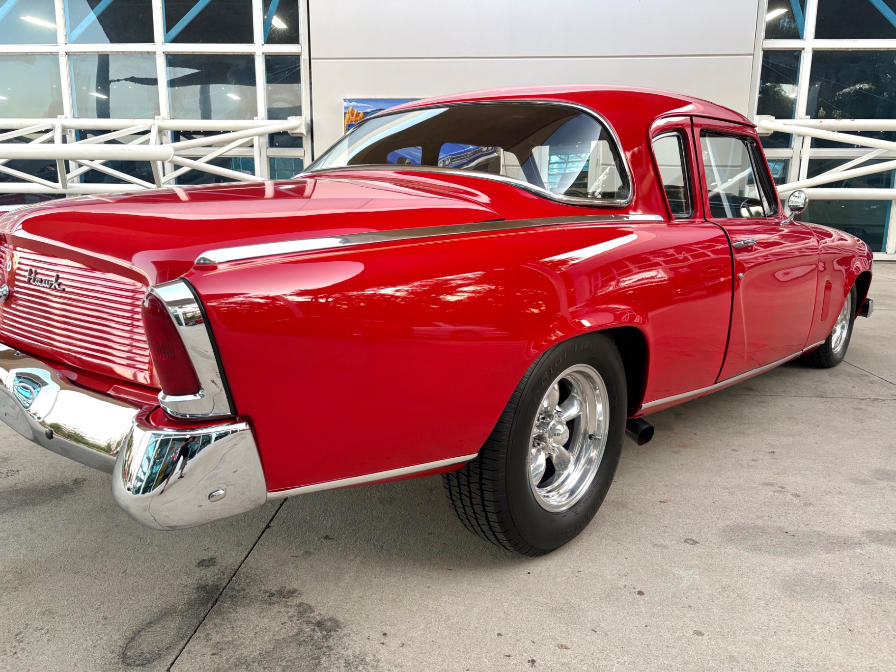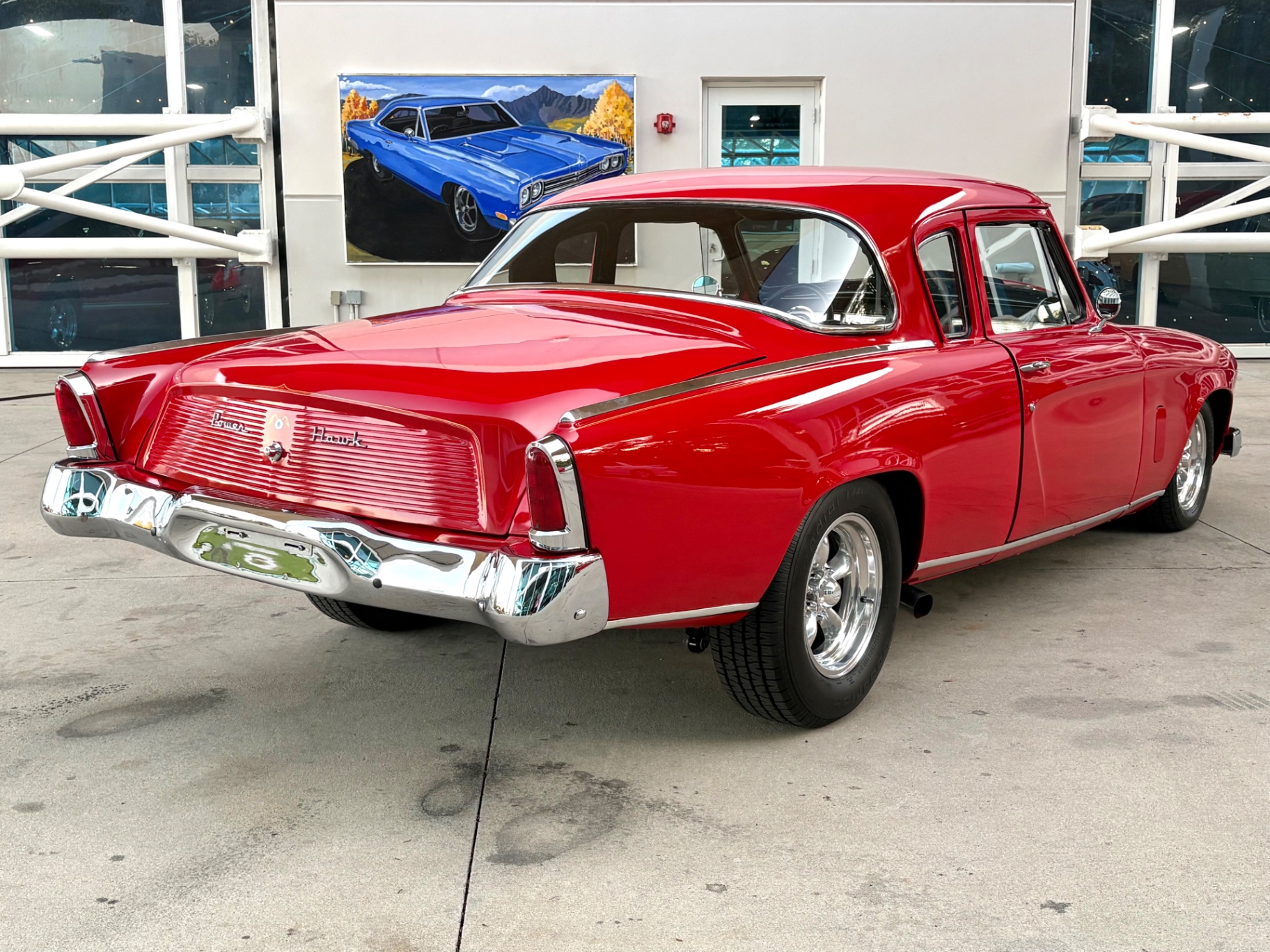 Engine: Chevrolet 396 Big Block V8 Induction: Holley Sniper Fuel Injection EFI system Intake: Cold air intake Transmission: 4-speed manual Rear end: Ford 9-inch Rear suspension: Coilover suspension Steering: Rack and pinion with power assist Steering wheel: Billet unit with tilt column Wheels: Polished Torque Thrust style wheels Tires: BF Goodrich Radial T/A Cooling: Aluminum radiator Exhaust: Dual exhaust Headlights: LED headlights Interior: Black vinyl with red and black houndstooth door panel inserts Gauges: Full custom gauge cluster with tachometer reading to 8,000 RPM and 160 MPH speedometer, all gauges functional, clock Windows: Power windows Exterior: Custom red paint with minor custom pin striping Bumpers: Chrome front and rear bumpers Rear trim: Chrome rear trim panel Mirrors: Dual exterior rear view mirrors Hood: Hood scoop Original items retained: Studebaker seat belts, Studebaker floor mats, Studebaker owner's manual