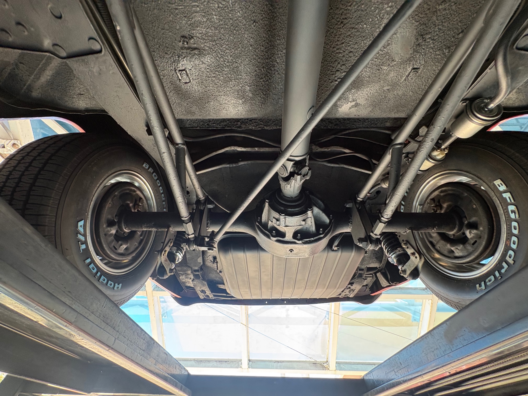 The hood scoop is a functional design addition appropriate to the build. LED headlights replace the original sealed beam units and provide significantly better illumination for night driving. Polished Torque Thrust style wheels are one of the most historically appropriate wheel choices for an American pro-street custom — the original Torque Thrust design dates to the early 1960s and has been associated with performance cars of this era ever since. They are wrapped in BF Goodrich Radial T/A tires, a tire with a long track record in the street performance market. Dual exterior mirrors are fitted on both sides. The underside, visible in the photos, shows a clean, well-finished build with the coilover units clearly visible at the rear axle.