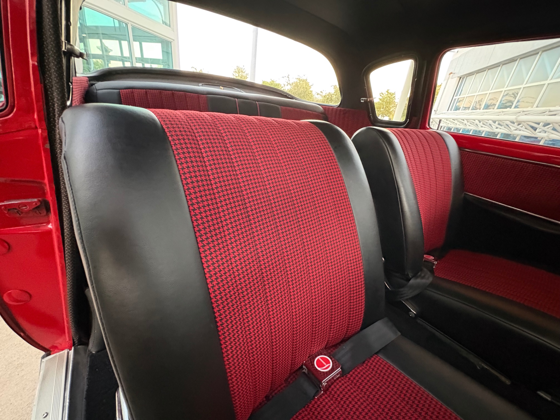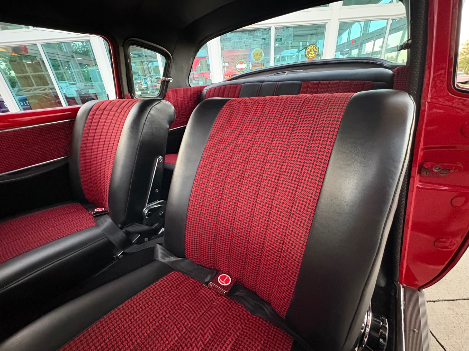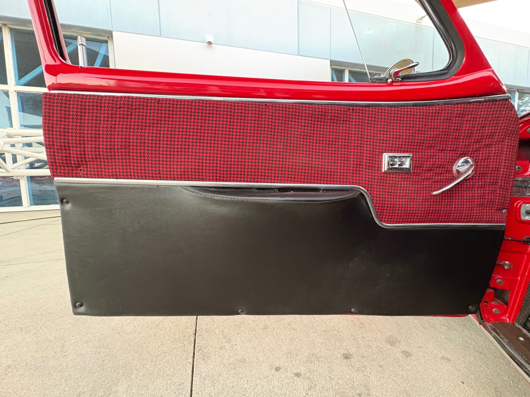 The interior of this 1956 Studebaker Power Hawk pairs black vinyl with red and black houndstooth fabric inserts on the door panels, tying the cabin visually to the exterior red paint. The houndstooth pattern carries real credibility in the classic car world — it was used extensively in period-correct American performance interiors and works here as a thoughtful design choice rather than an afterthought.