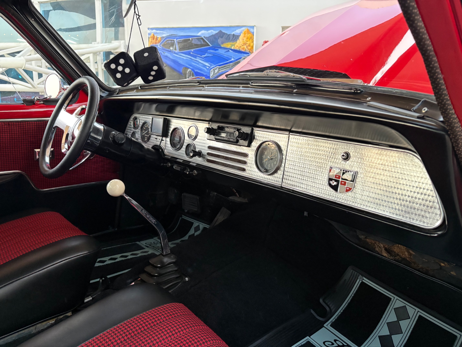 This particular 1956 Studebaker Power Hawk has been transformed into a purpose-built driver with real mechanical substance under that custom red paint. The factory drivetrain is long gone. In its place sits a Chevrolet 396 Big Block V8 mated to a 4-speed manual transmission, fed by a Holley Sniper EFI system and breathing through a cold air intake. Out back, a Ford 9-inch rear end handles the power delivery. The suspension has been updated with coilover units at the rear. Rack and pinion steering with power assist replaces the original recirculating ball setup. This is a car that was built to be driven, not parked on a trailer.