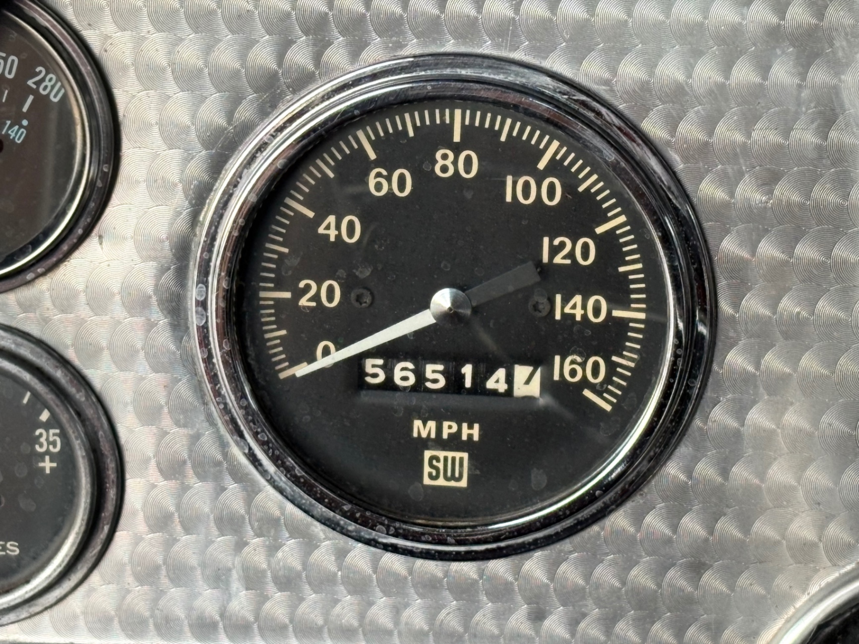 The custom gauge cluster gives the driver full instrumentation, including a tachometer with an 8,000 RPM redline sweep and a 160 MPH speedometer. Having accurate, functional gauges in a high-powered custom build is not a cosmetic detail — it is a practical necessity. A clock is also included in the cluster. The billet steering wheel sits on a tilt steering column, which makes ingress and egress easier in a car with a relatively low roofline. Power windows operate the door glass, a convenience feature that also preserves the clean look of the interior panels. The original Studebaker floor mats and seat belts have been retained, as has the factory owner's manual — small details that speak to the care taken with this build.